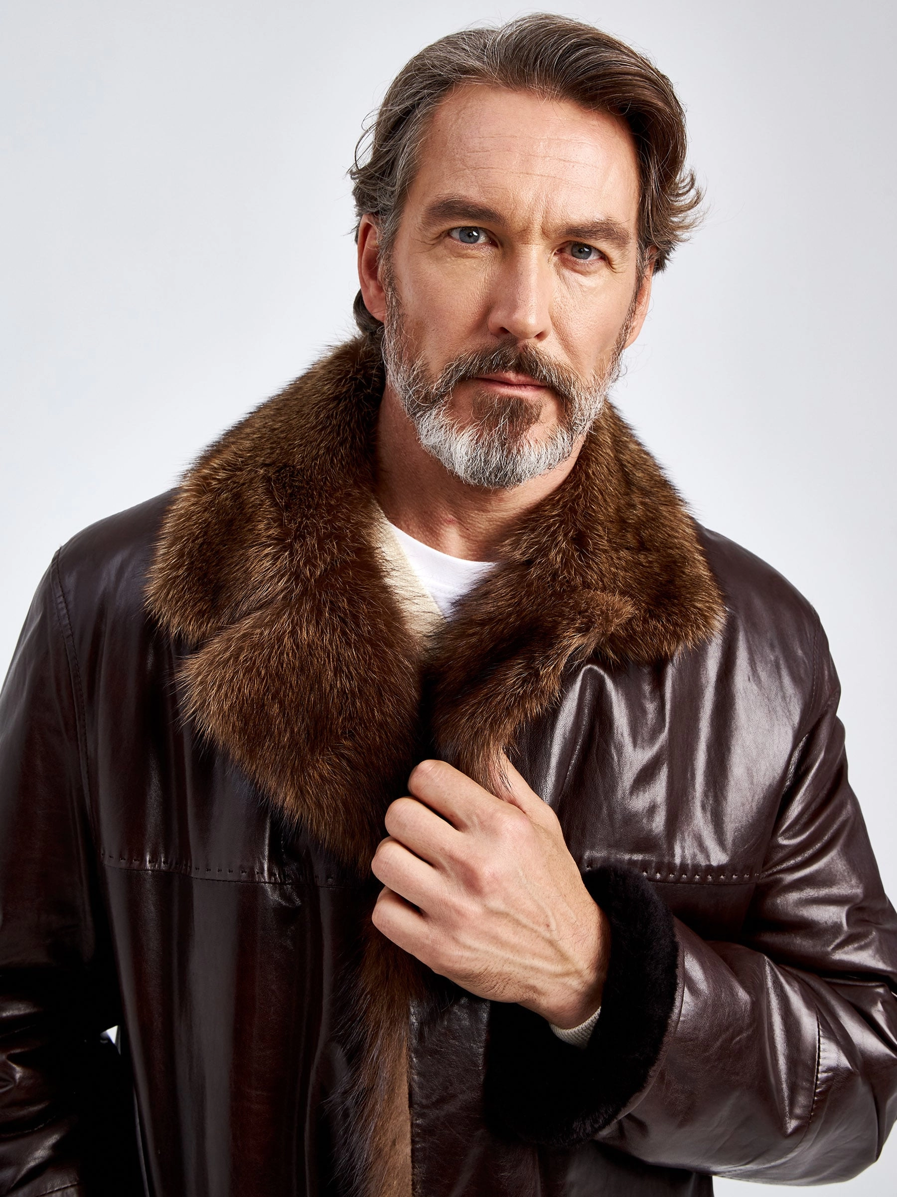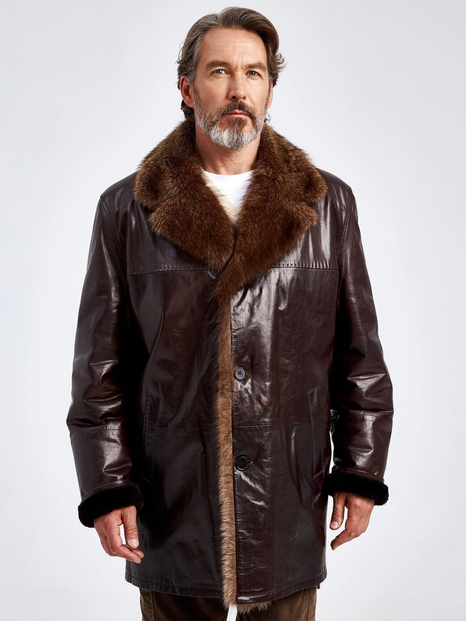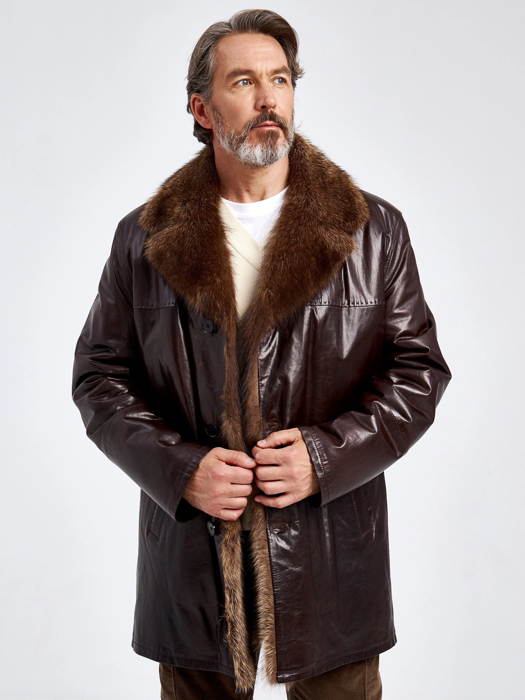 Товар кожаное мужское зимнее полупальто с воротником меха соболя премиум класса 5140, коричневое, размер 56, артикул 40580 выполнен из натуральной кожи с застежкой пуговицы. Рассчитан на сезон: осень-зима. Длина изделия 87 см, силуэт прямой.