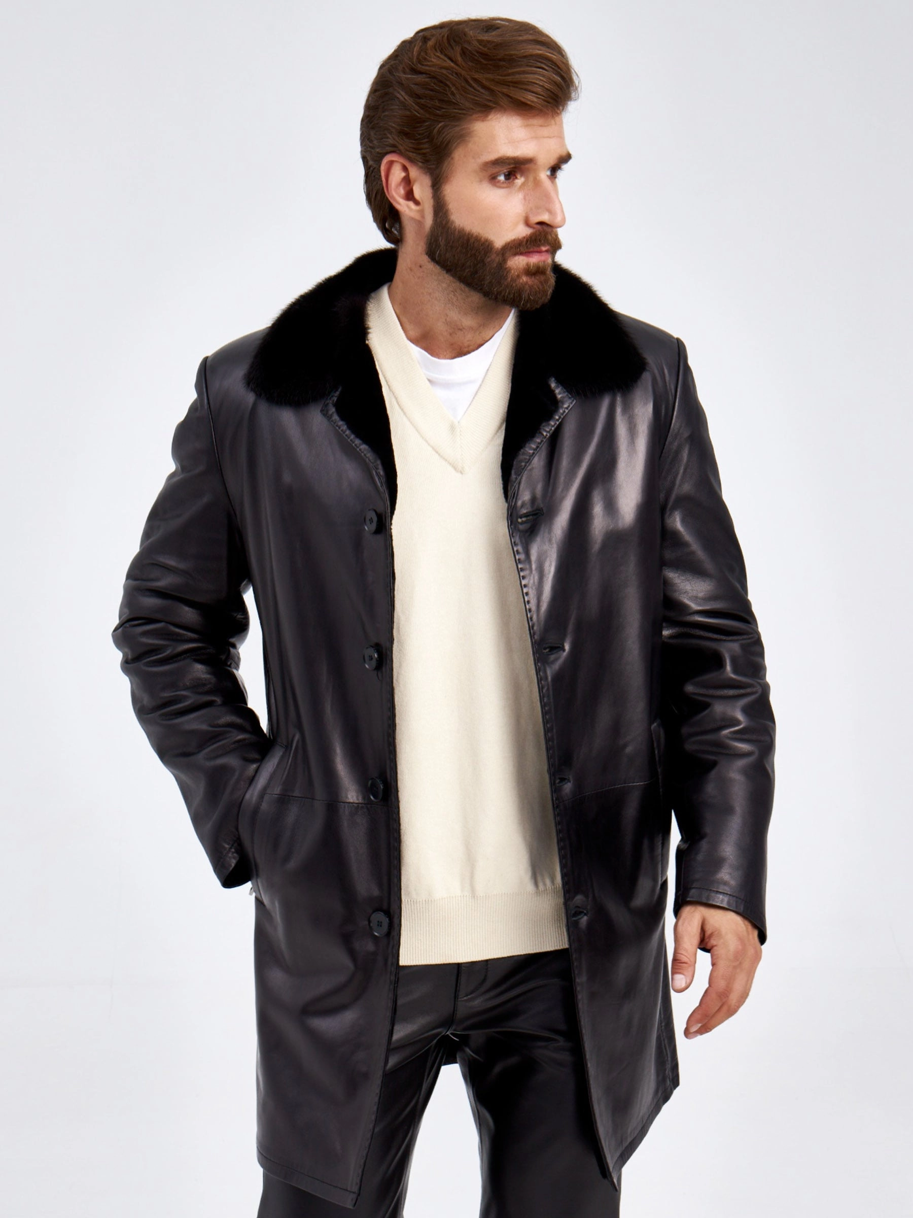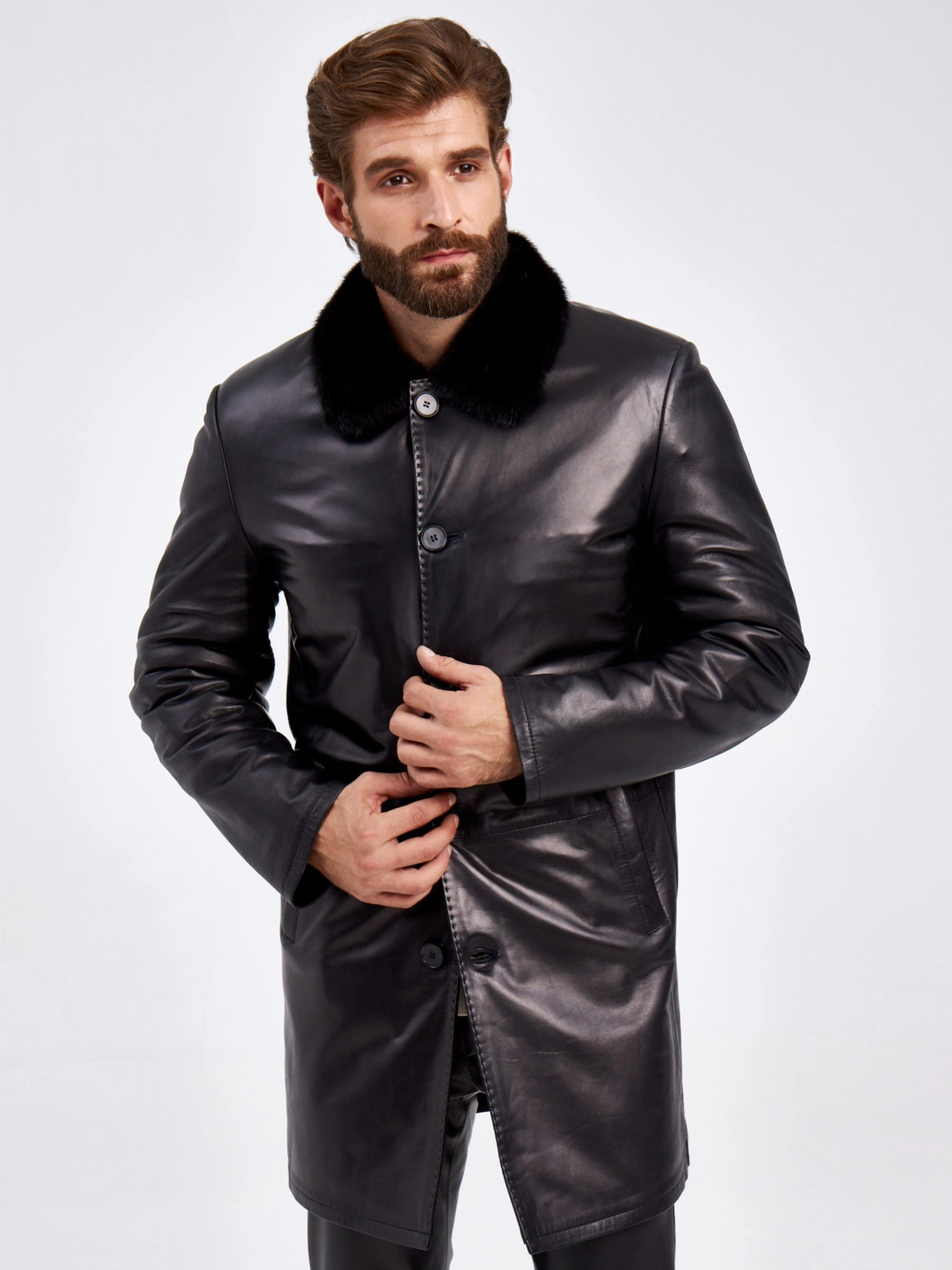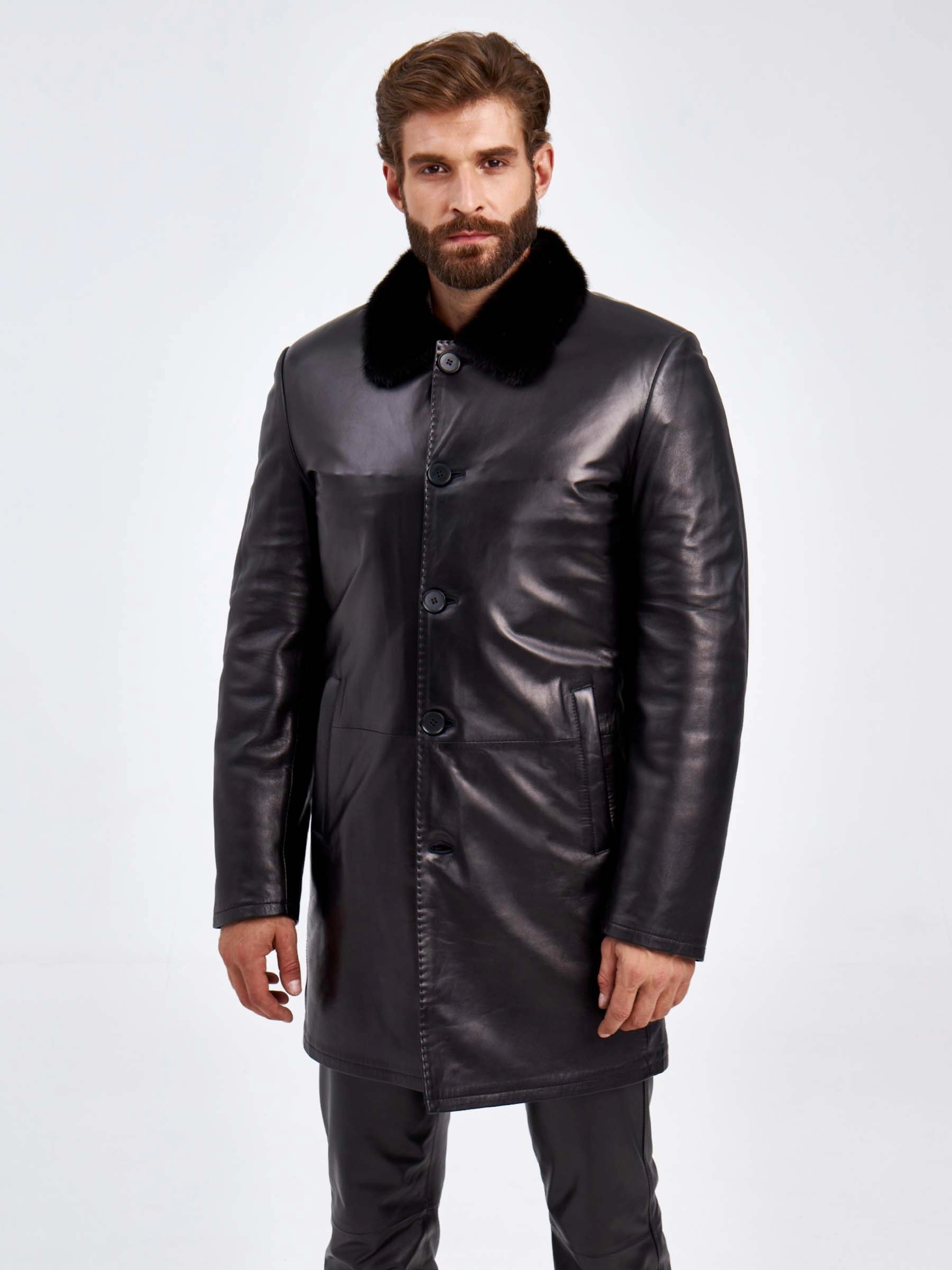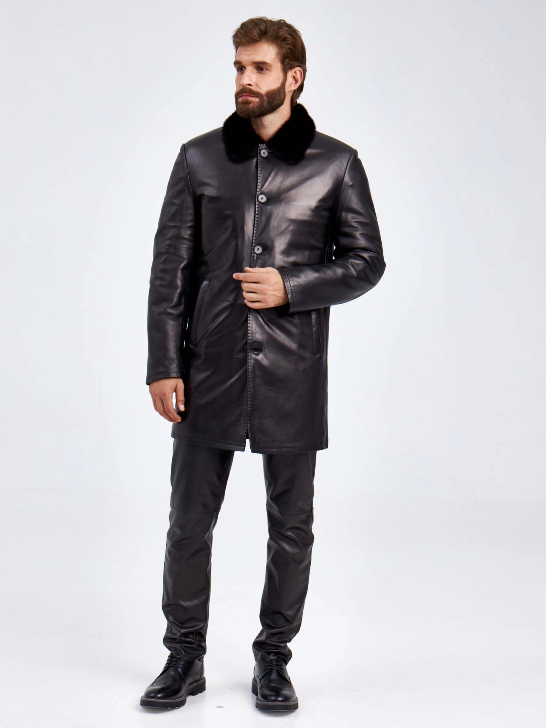 Товар кожаное мужское зимнее пальто на подкладке из овчины с норковым воротником 5365, черное, размер 46, артикул 29440 выполнен из натуральной кожи с застежкой пуговицы. Рассчитан на сезон: осень-зима. Длина изделия 90 см, силуэт прямой.