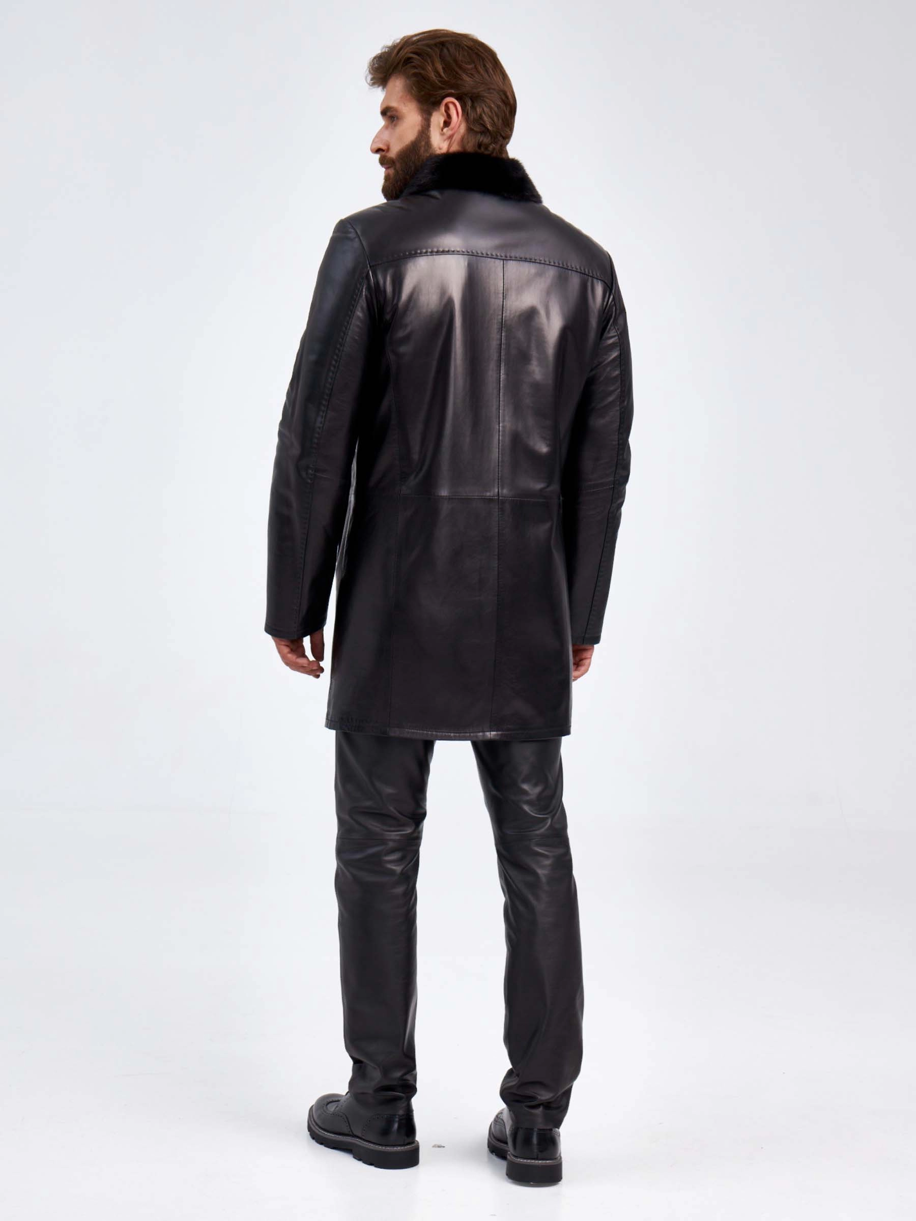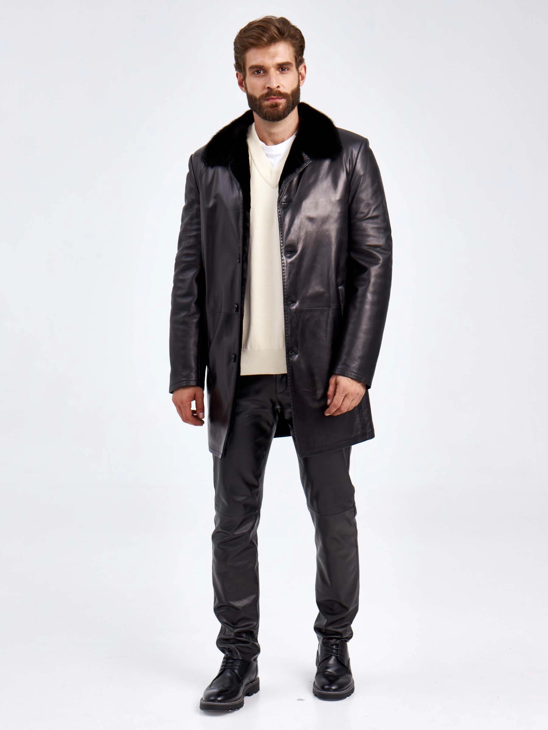 Кожаное мужское зимнее пальто на подкладке из овчины с норковым воротником 5365, черное, размер 46, артикул 29440
