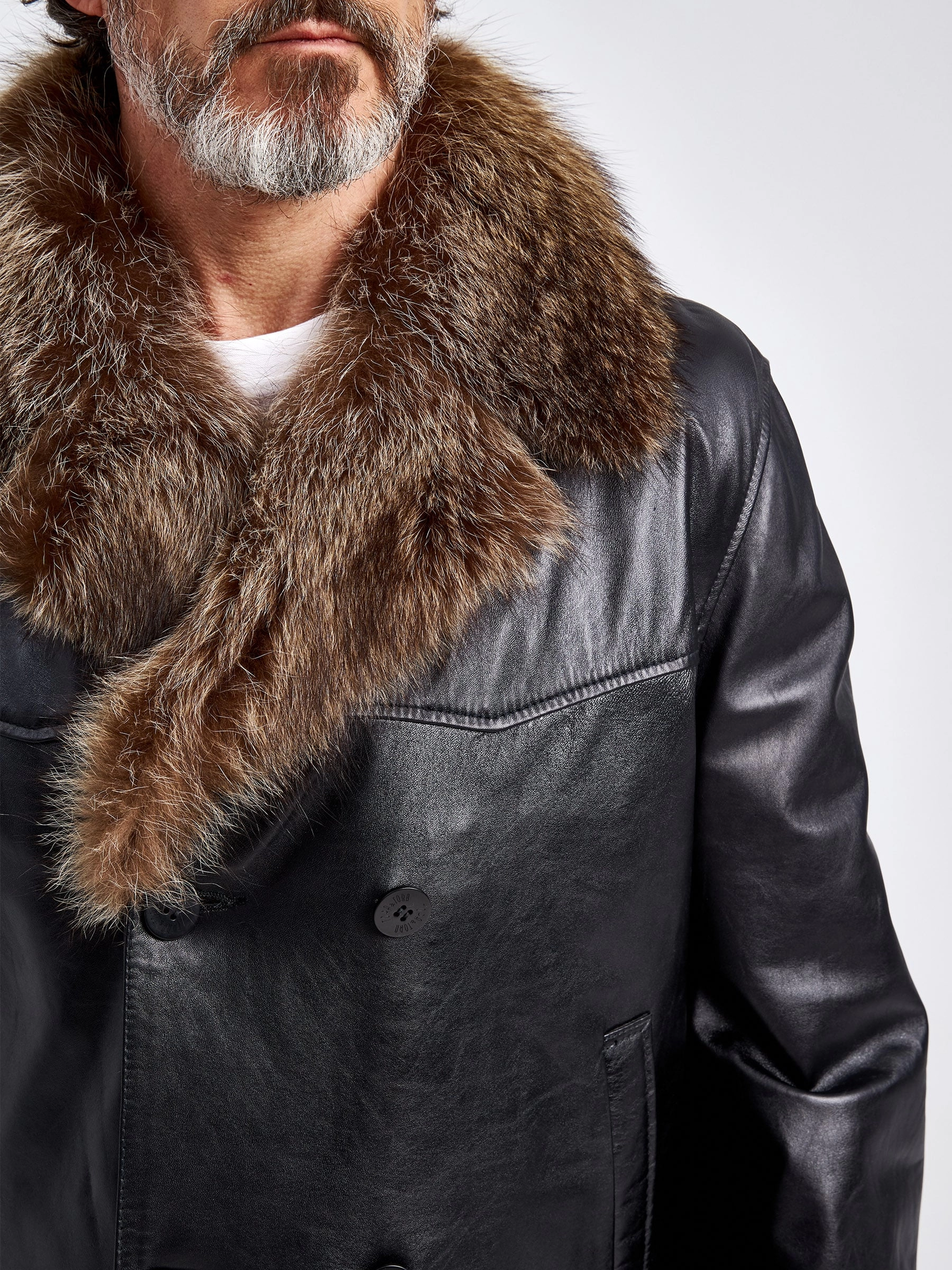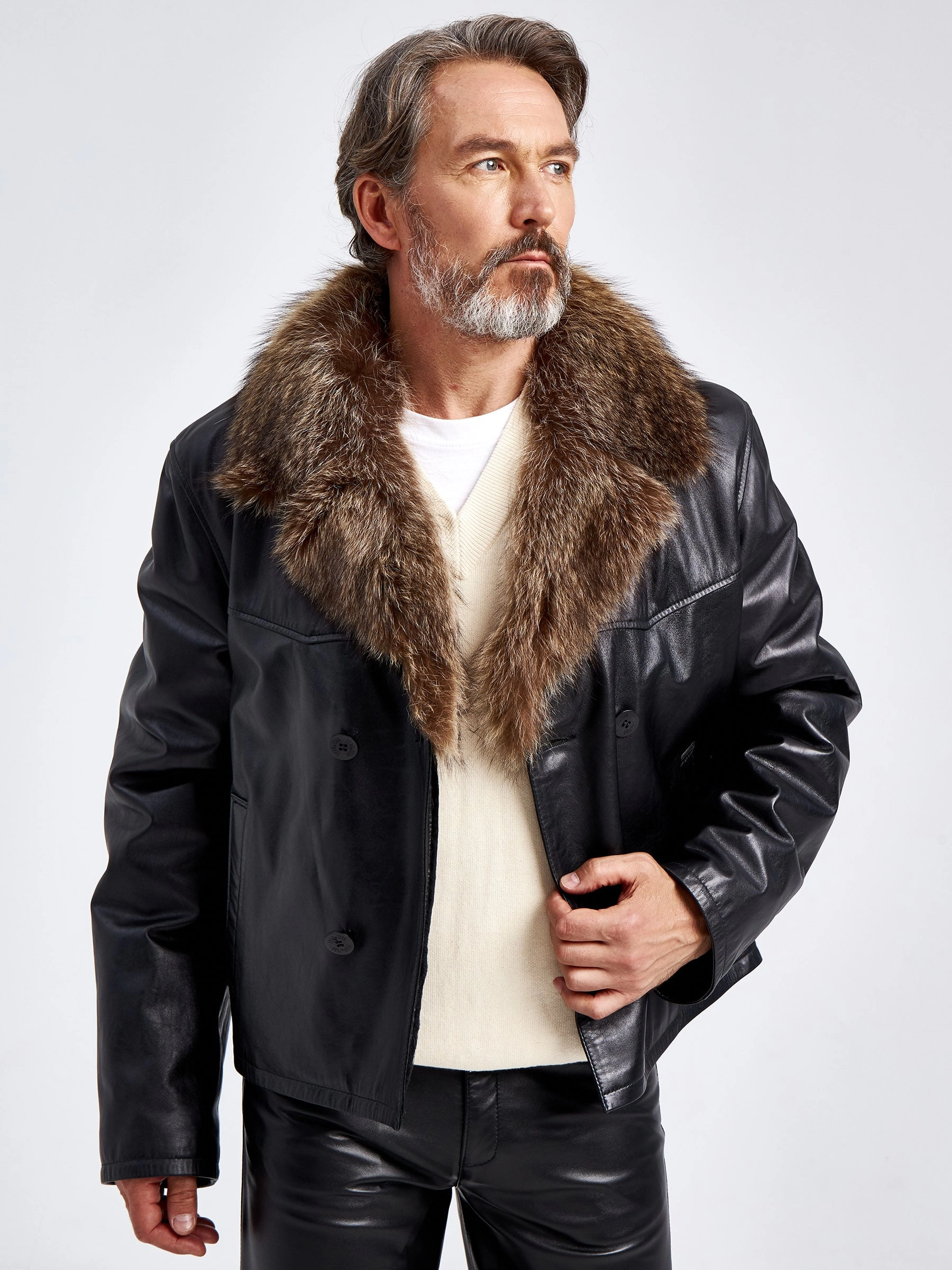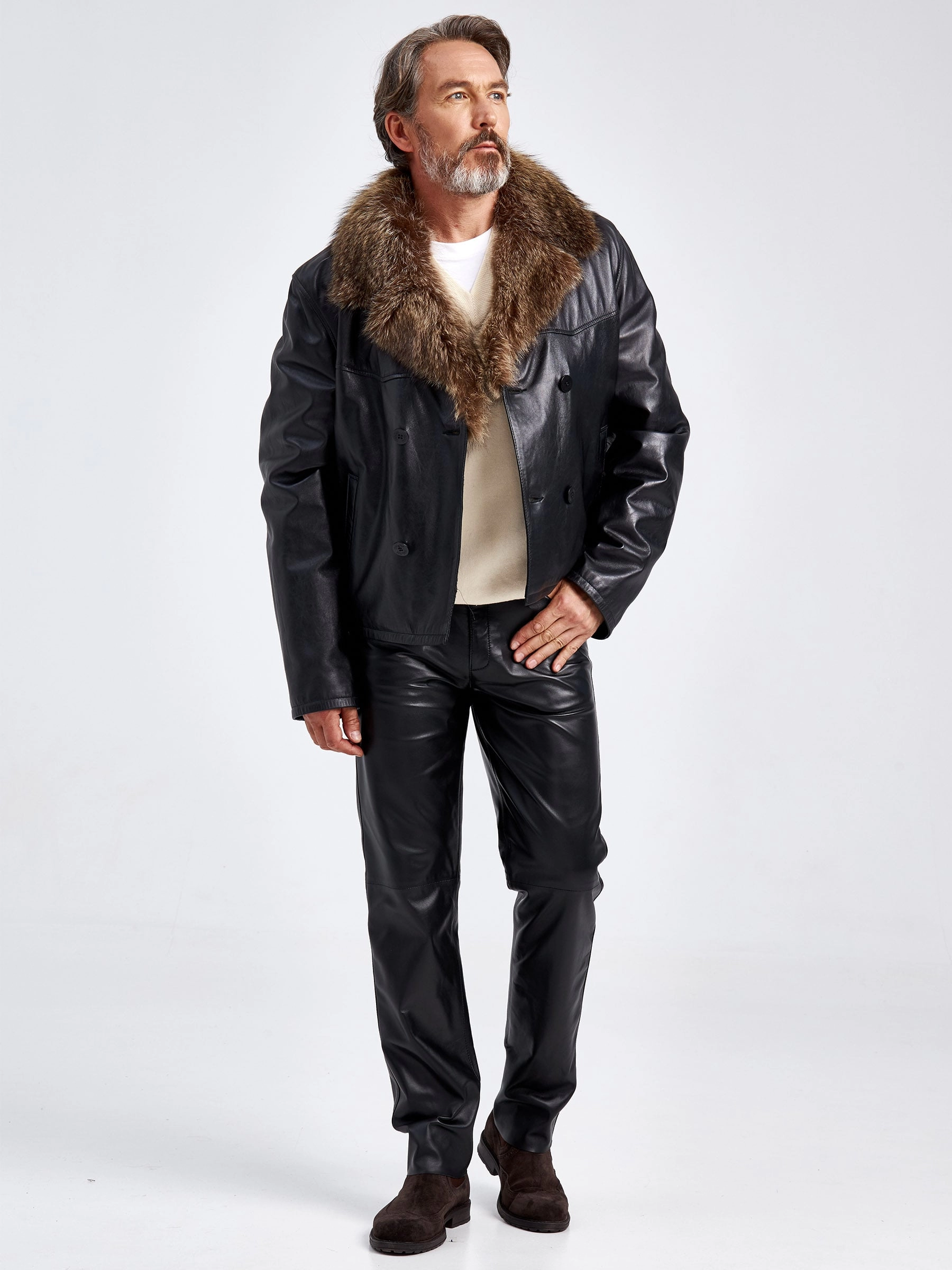 Зимняя двубортная мужская кожаная куртка с воротником меха енота Mafia/New, черная, размер 54, артикул 40810