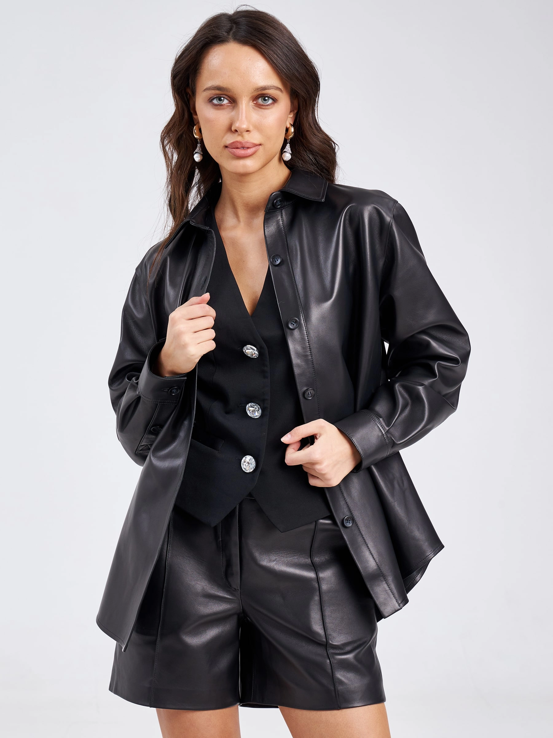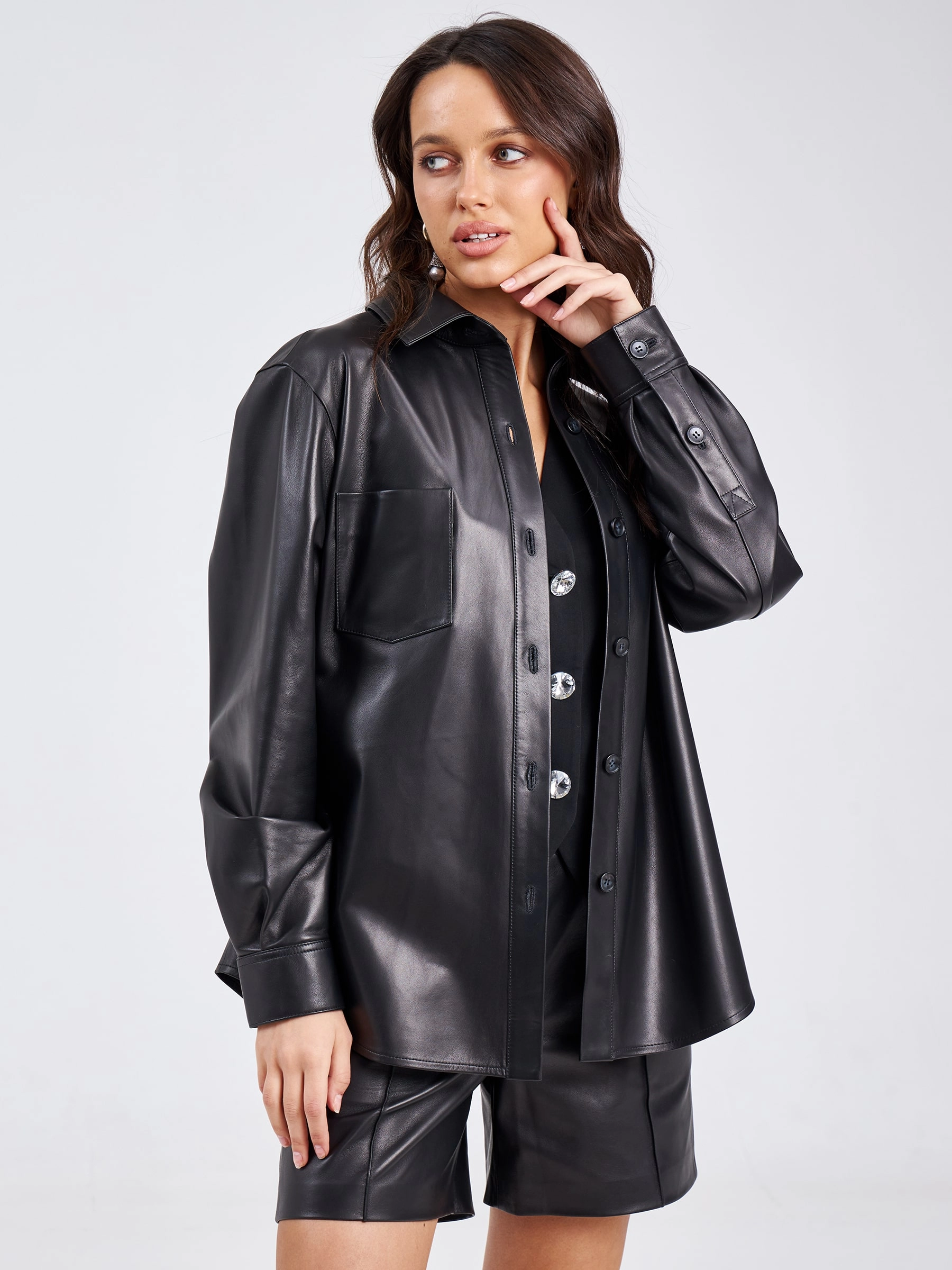 Женская рубашка прямого кроя, с длинными рукавами и отложным воротником, станет отличным решением в прохладные дни. Для пошива модели мастера выбрали мягкую кожу премиум класс. Изменить силуэт поможет тонкий кожаный ремень.