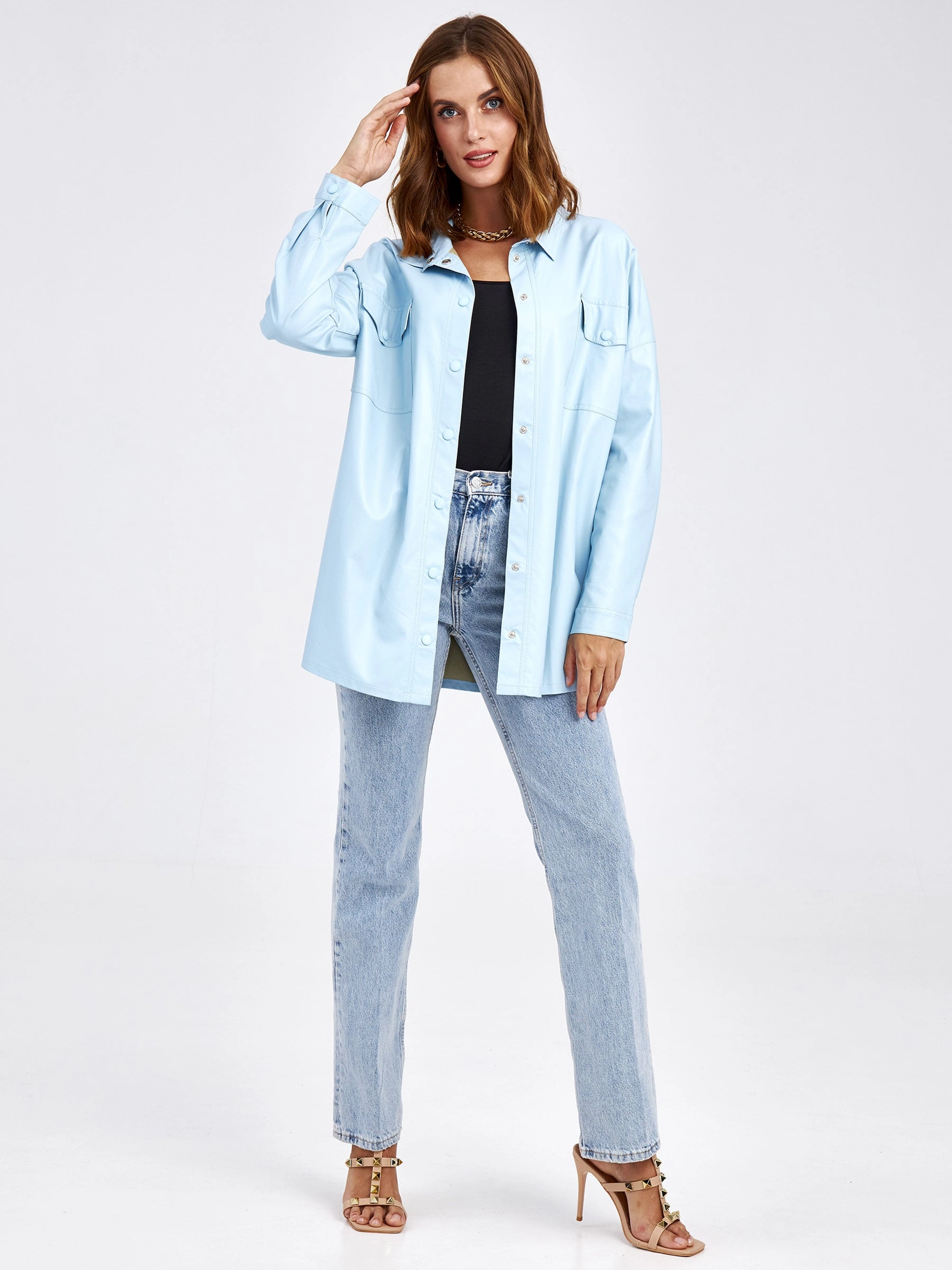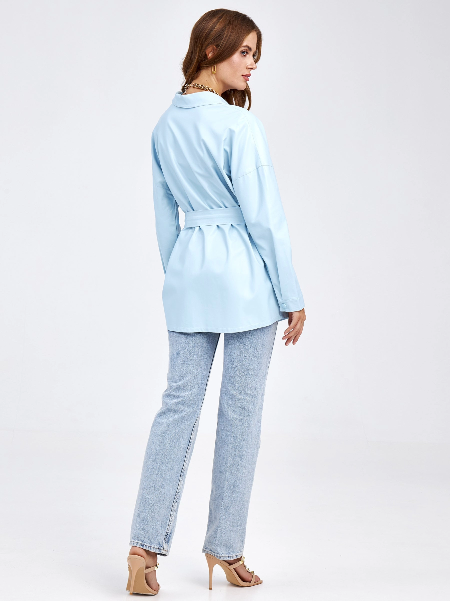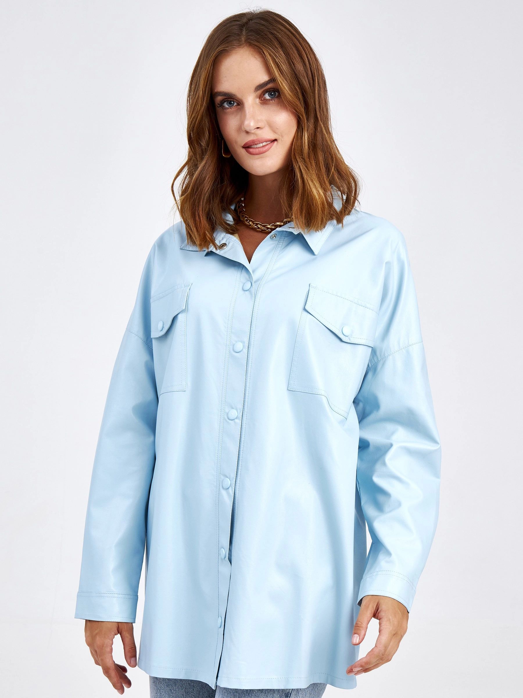 Товар кожаная рубашка женская из экокожи 4820791, голубая, размер 46, артикул 85690 выполнен из экокожи с застежкой кнопки. Рассчитан на сезон: демисезон. Длина изделия 73 см, силуэт прямой.