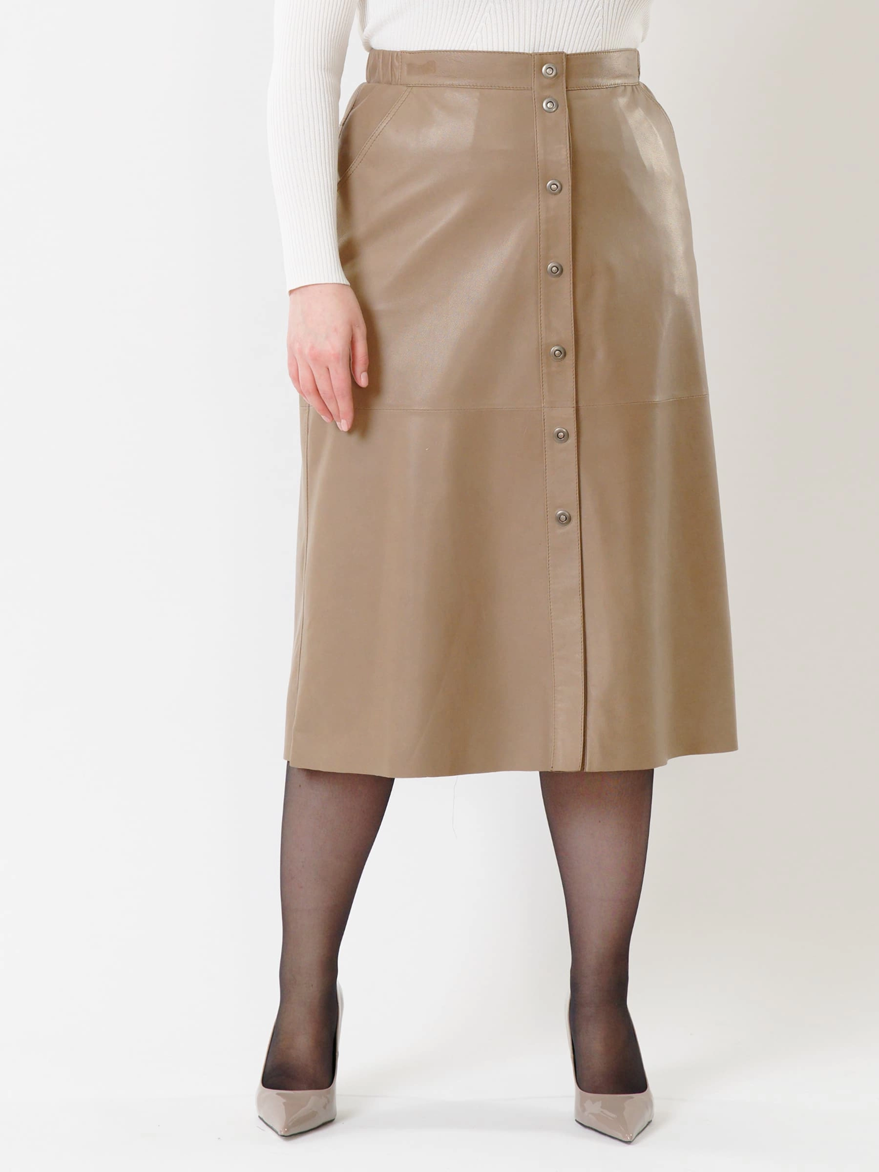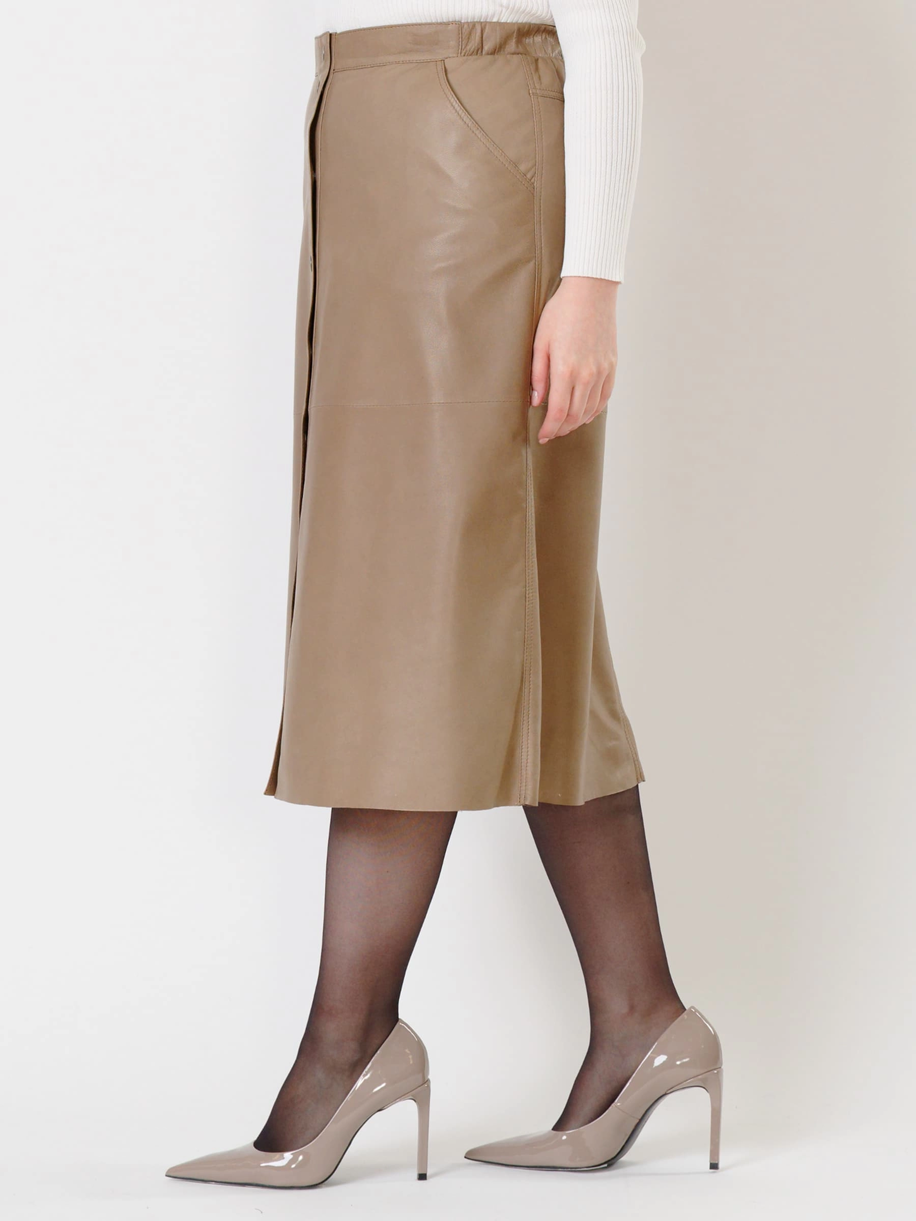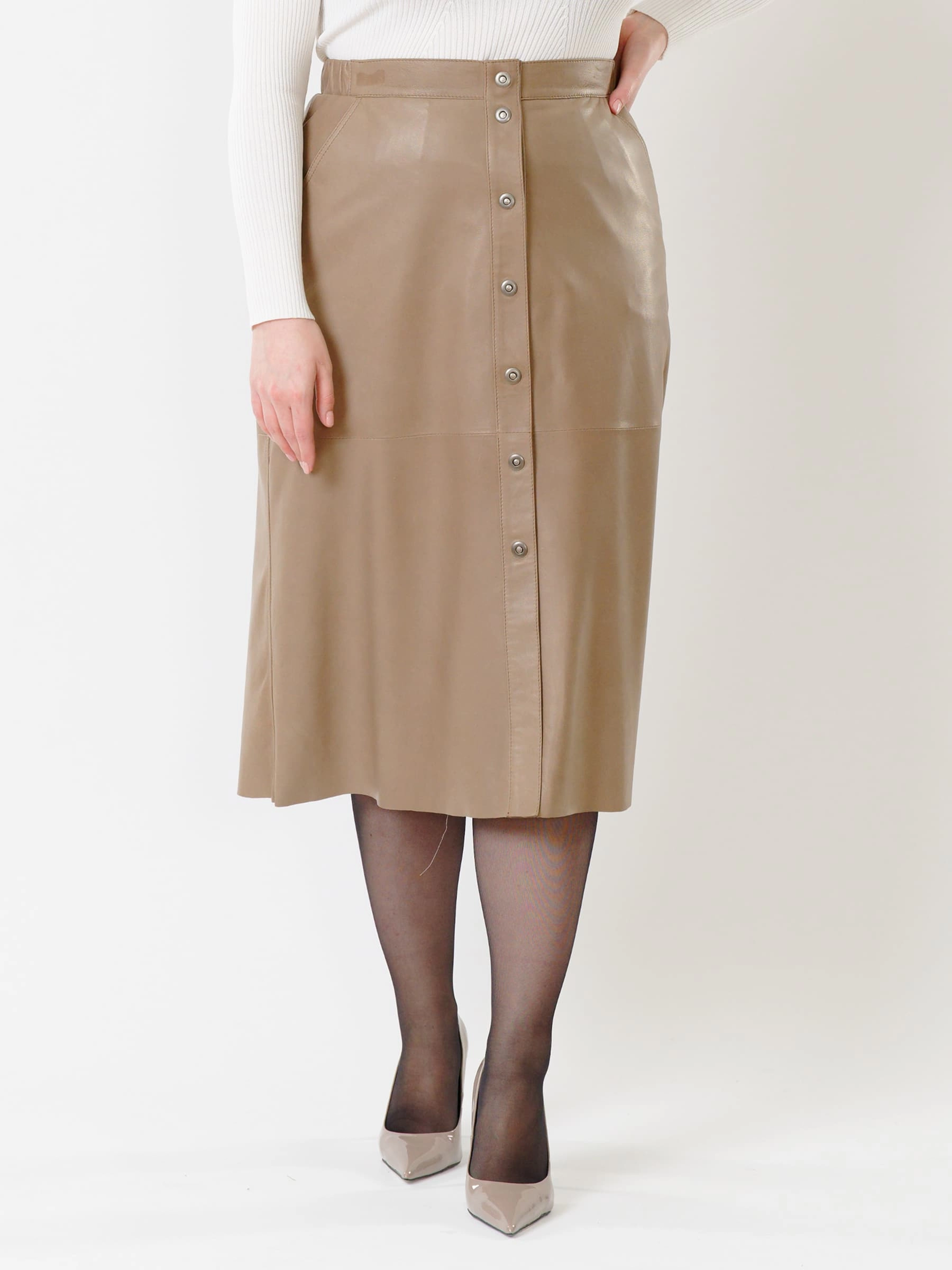 Длинная юбка из натуральной кожи на кнопках длиной 80 см с расклешённым силуэтом обеспечивает безупречную посадку. Мягкая кожа премиального качества идеально сочетается с облегающими водолазками, объёмными свитерами и кожаными косухами — дополните образ ботильонами или сапогами на каблуке, добавьте тонкие металлические аксессуары, чтобы создать стильный лук на любой случай. Эта универсальная модель одинаково хороша для элегантных, уютных и дерзких образов, подчёркивая индивидуальность и чувство стиля.