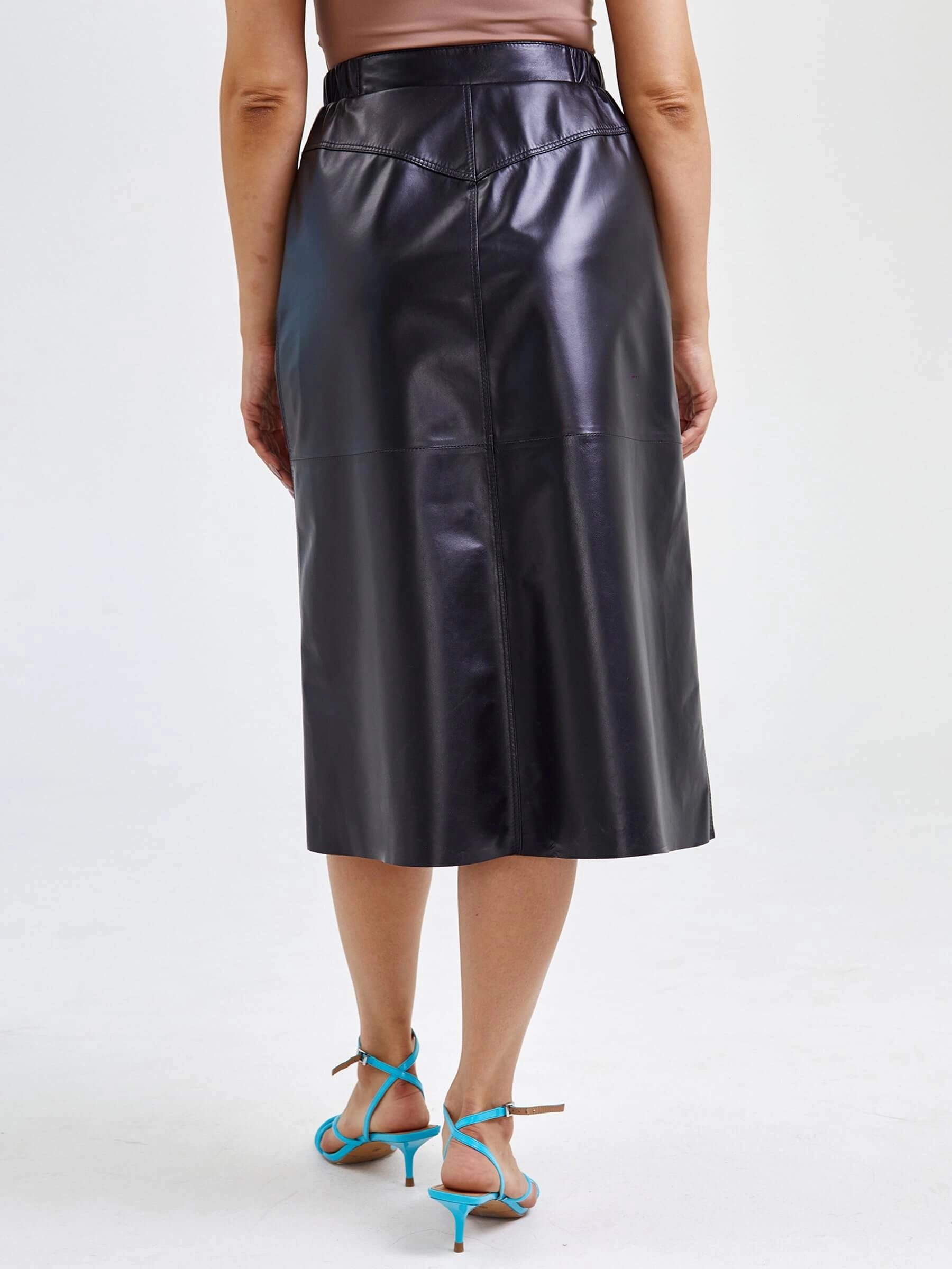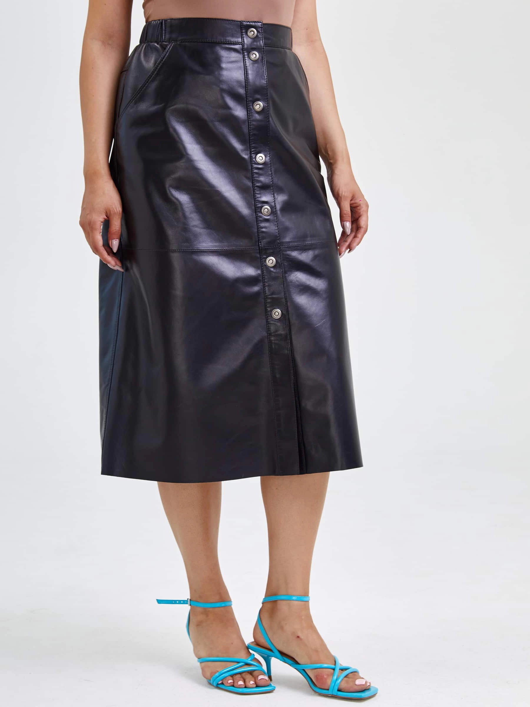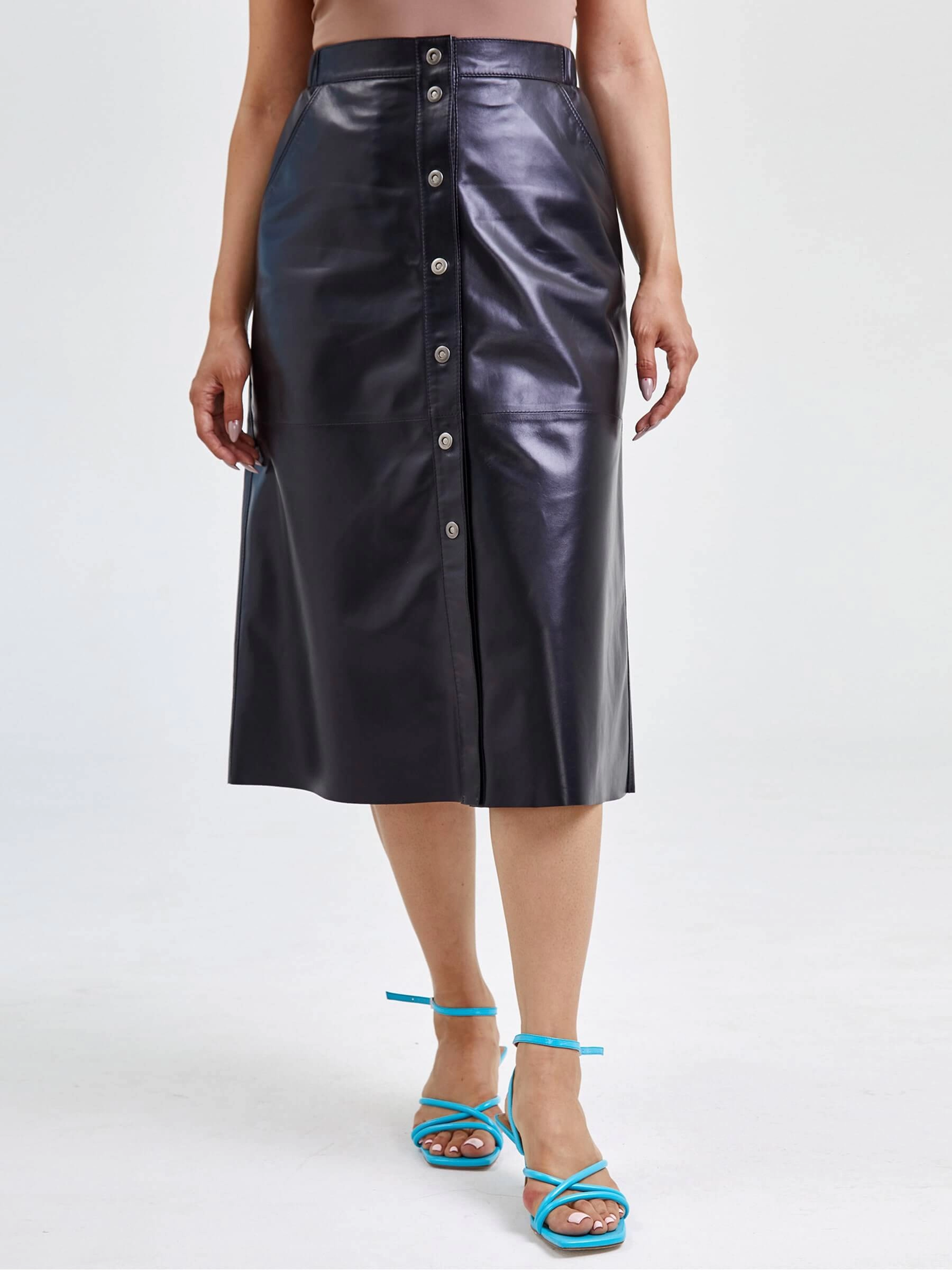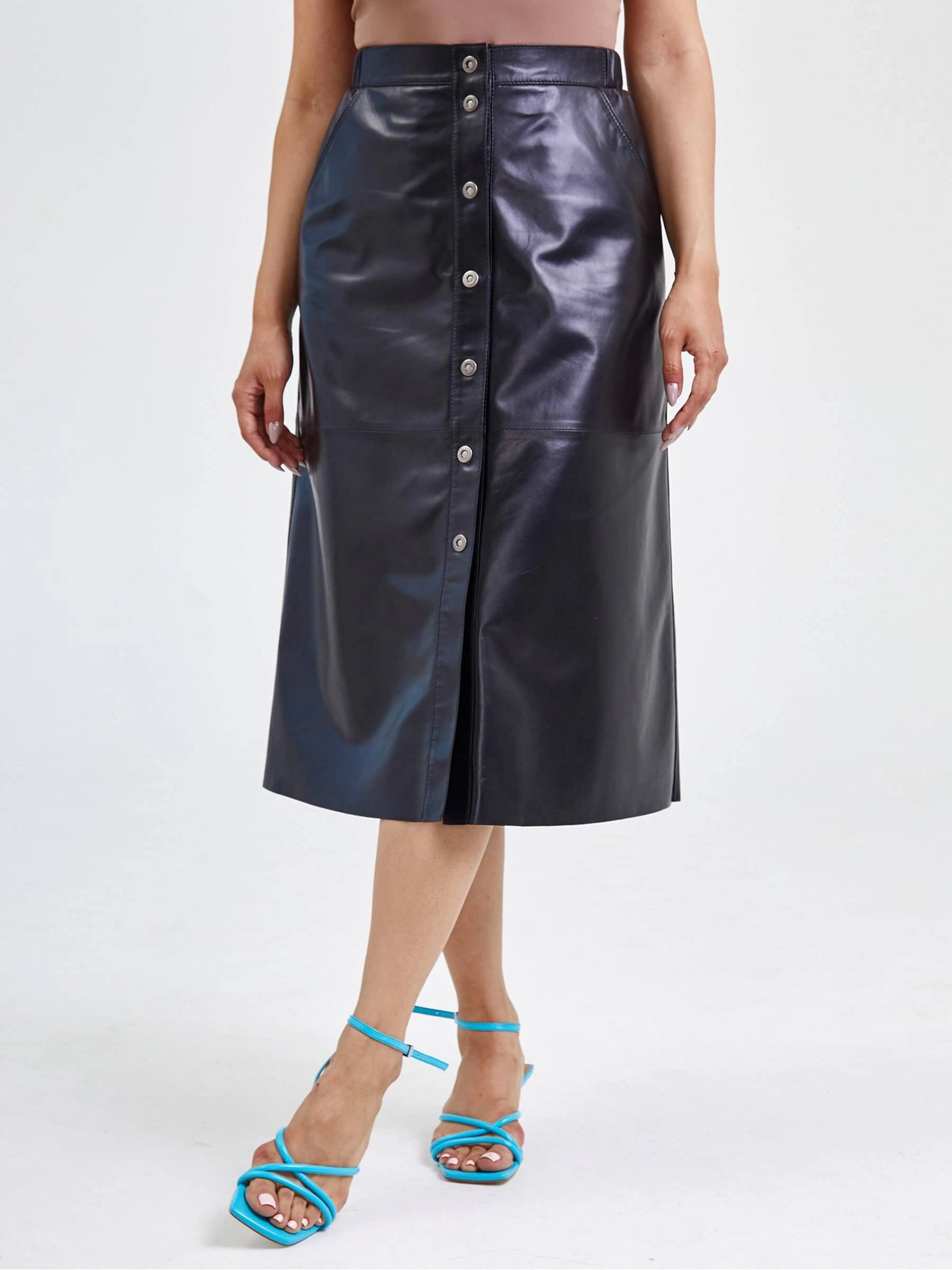 Длинная юбка из натуральной кожи на кнопках длиной 80 см с расклешённым силуэтом обеспечивает безупречную посадку. Мягкая кожа премиального качества идеально сочетается с облегающими водолазками, объёмными свитерами и кожаными косухами — дополните образ ботильонами или сапогами на каблуке, добавьте тонкие металлические аксессуары, чтобы создать стильный лук на любой случай. Эта универсальная модель одинаково хороша для элегантных, уютных и дерзких образов, подчёркивая индивидуальность и чувство стиля.