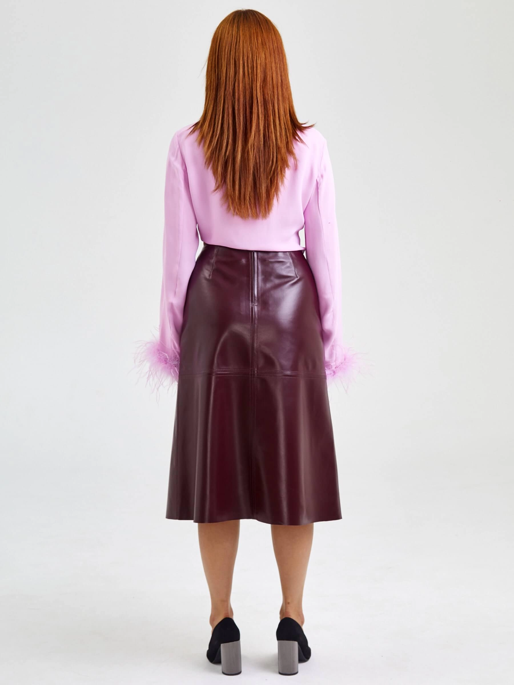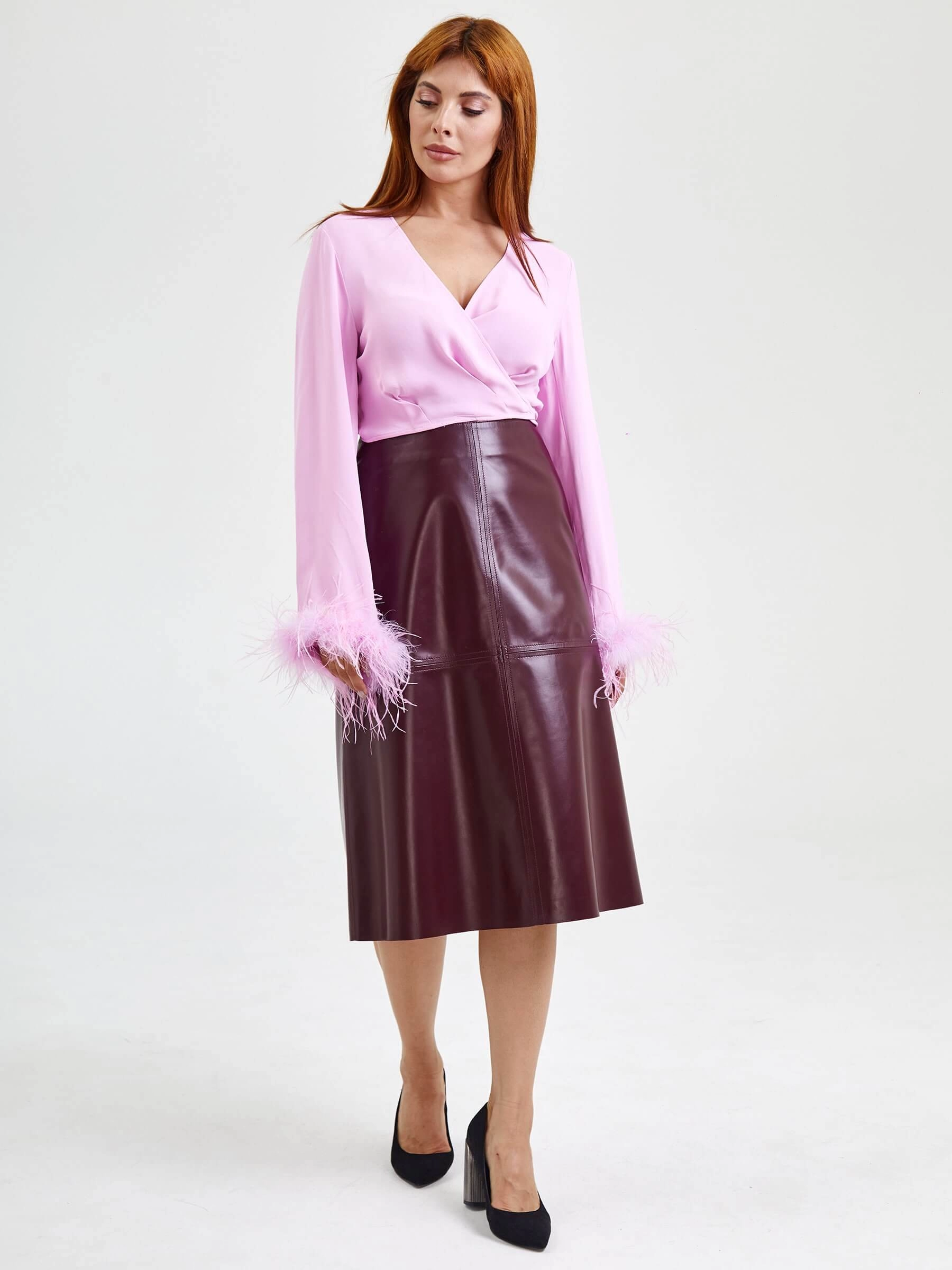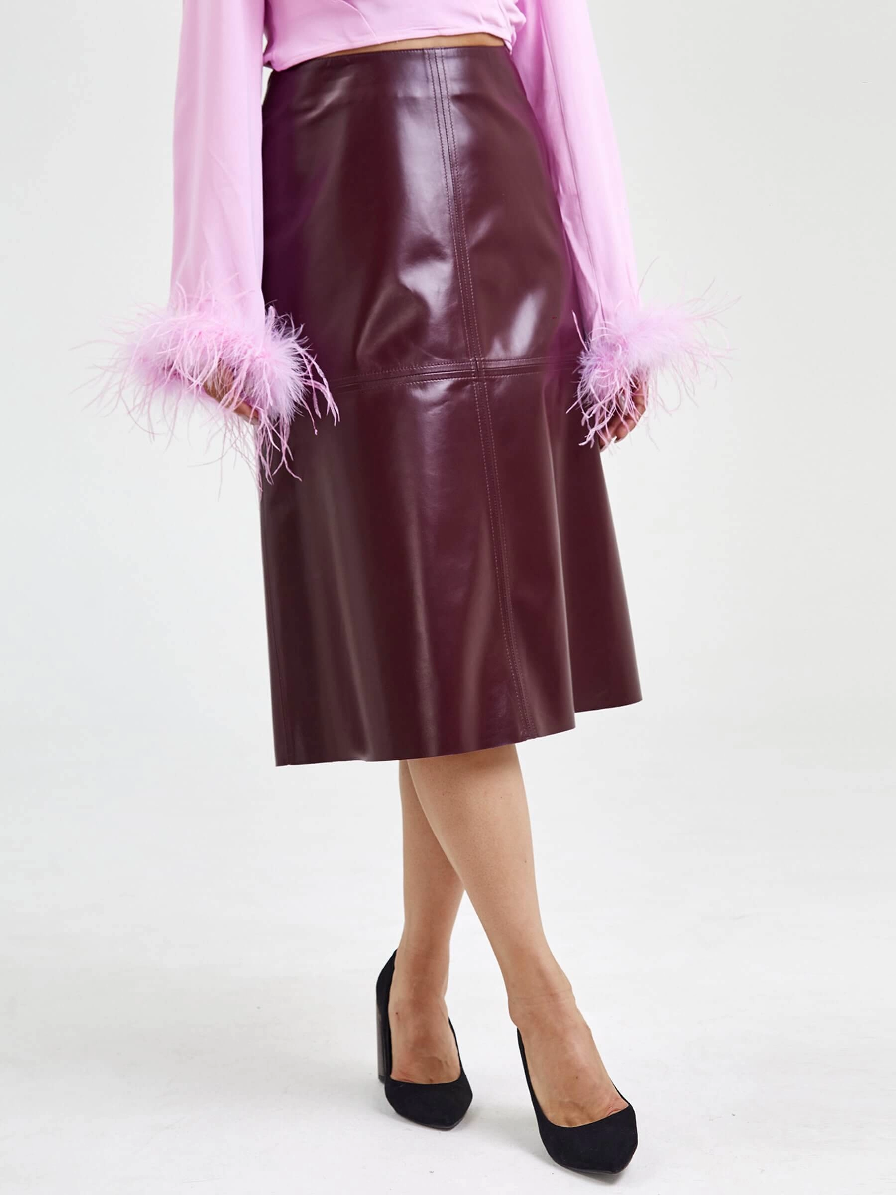 Товар кожаная юбка миди 09, бордовая, размер 44, артикул 85570 выполнен из натуральной кожи с застежкой молния. Рассчитан на сезон: демисезон. Длина изделия 76 см, силуэт расклешенный.
