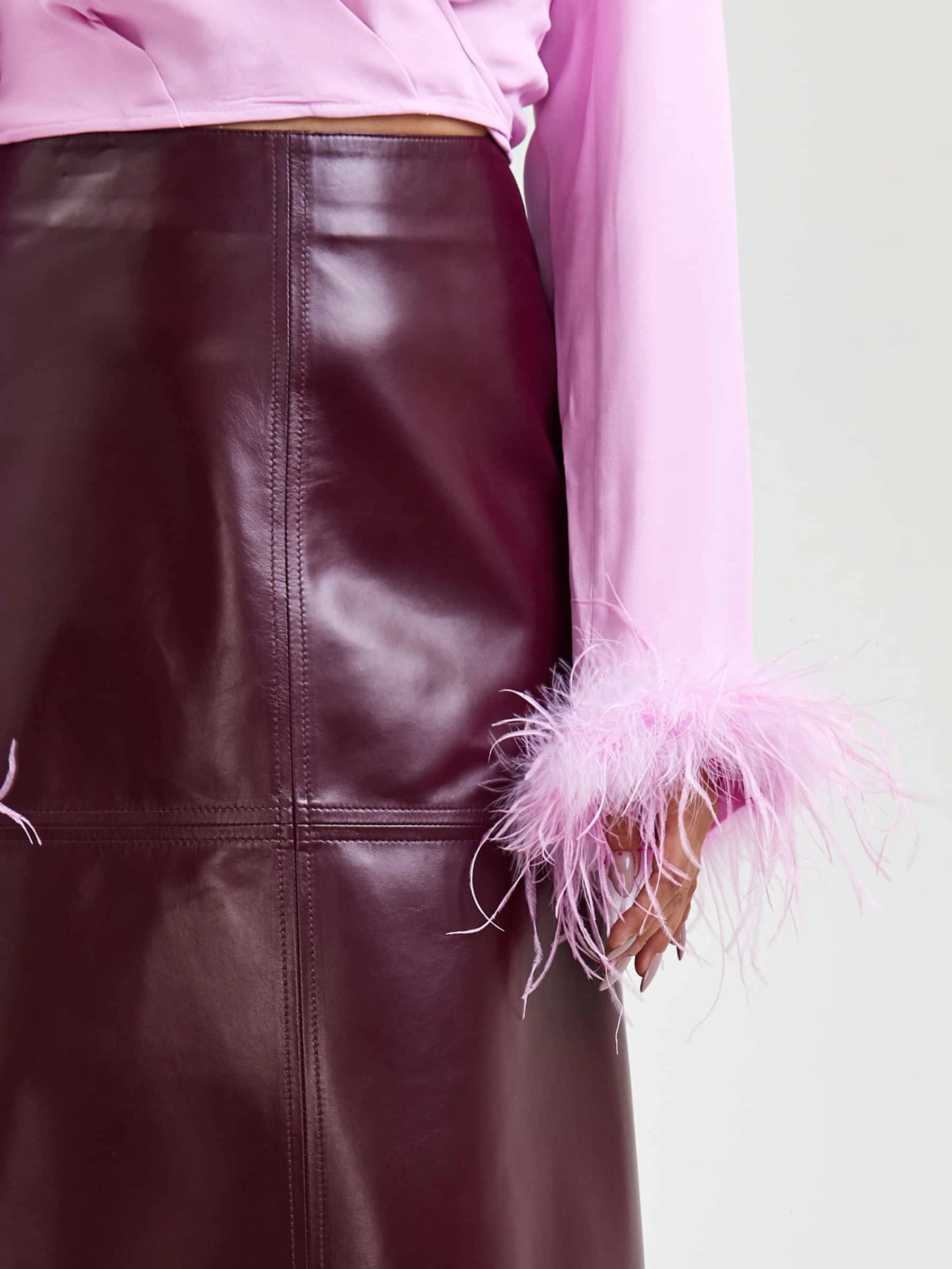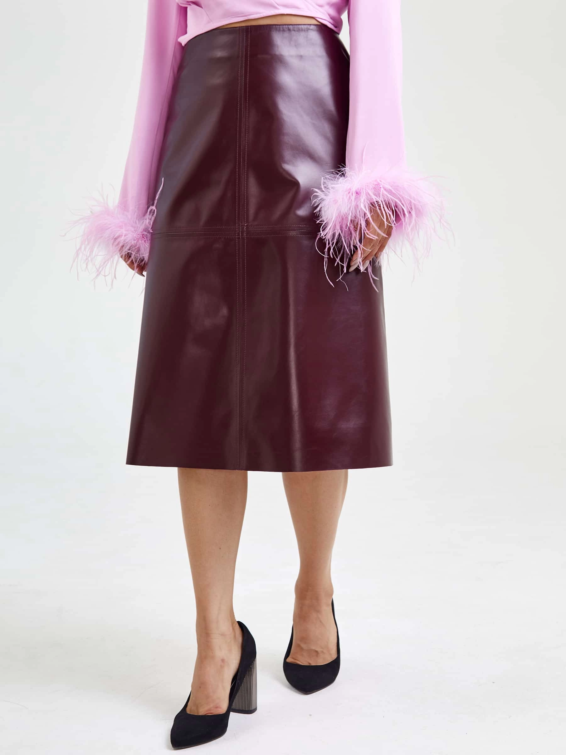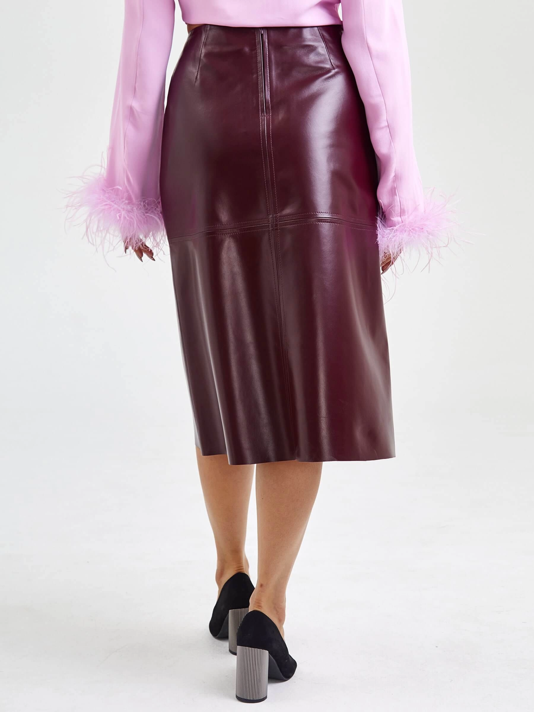 Кожаная юбка миди 09, бордовая, размер 44, артикул 85570