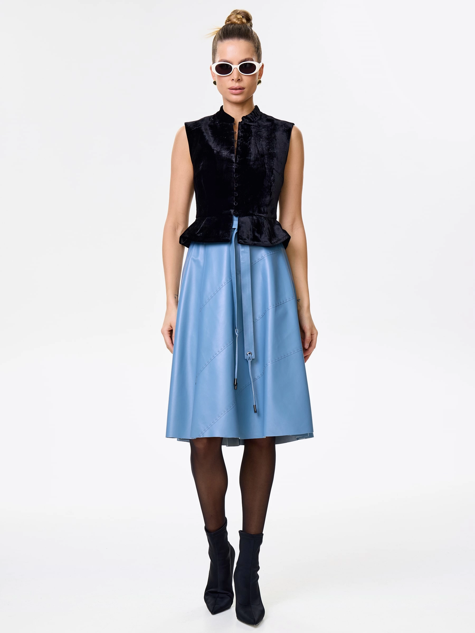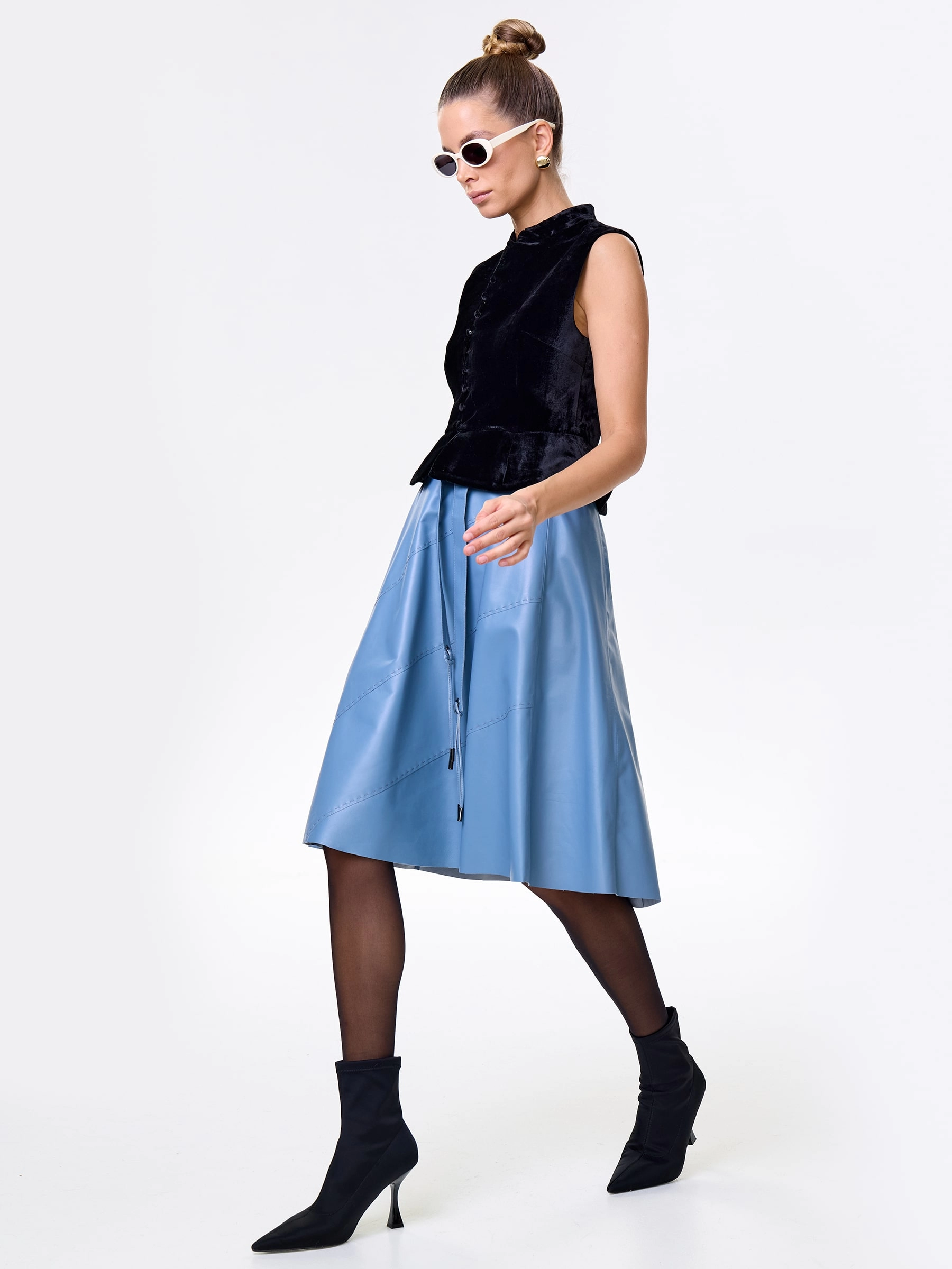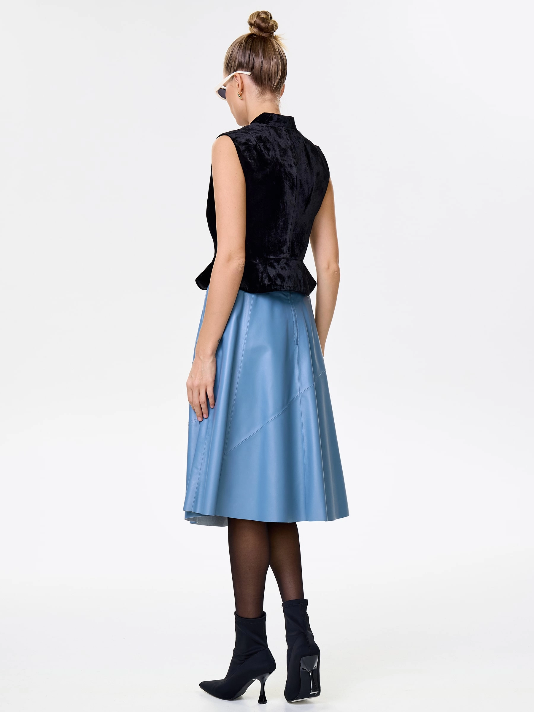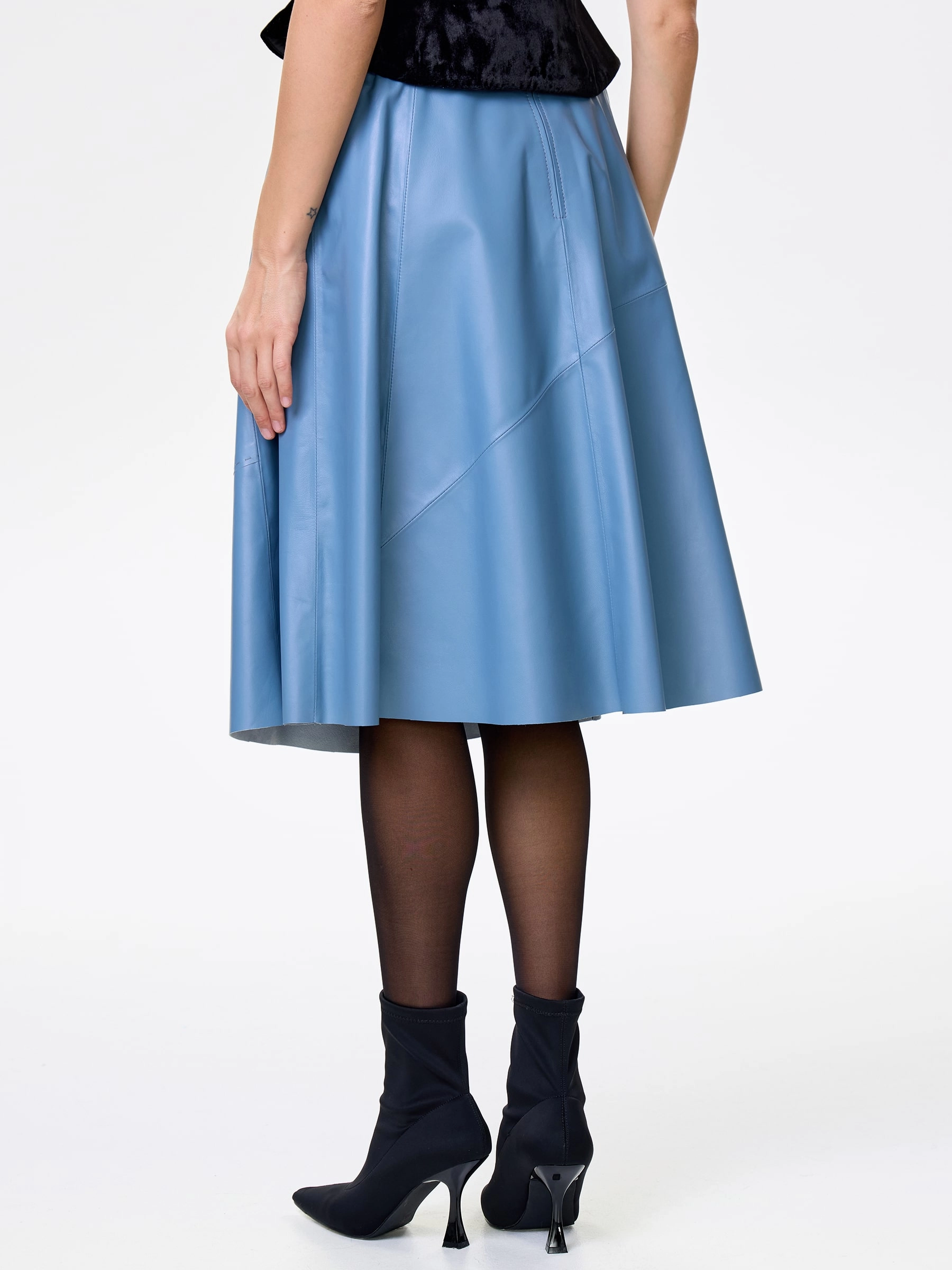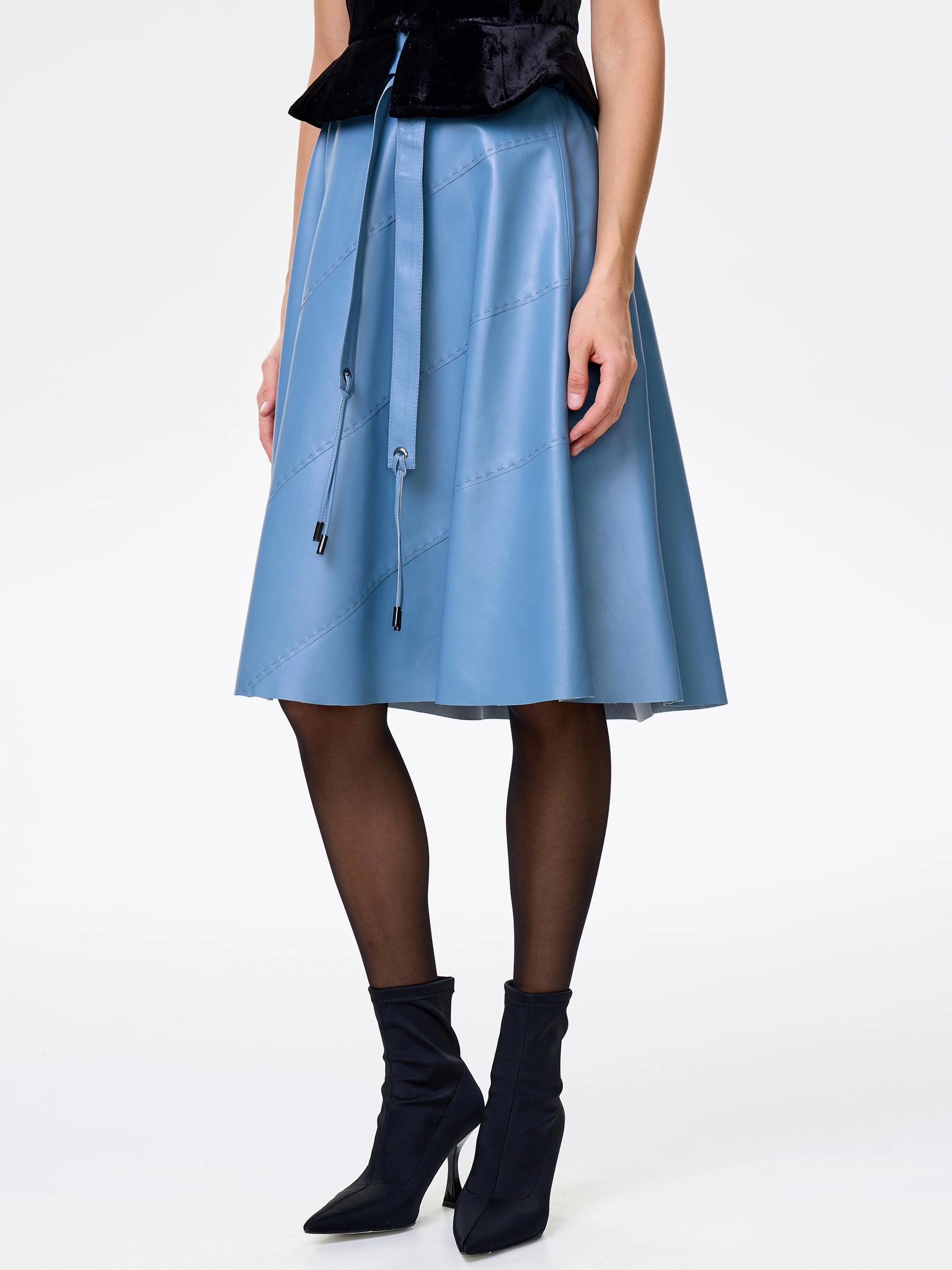 Товар кожаная расклешенная юбка из натуральной кожи 01рс, голубая, размер 46, артикул 85360 выполнен из натуральной кожи с застежкой молния. Рассчитан на сезон: демисезон. Длина изделия 70 см, силуэт расклешенный.