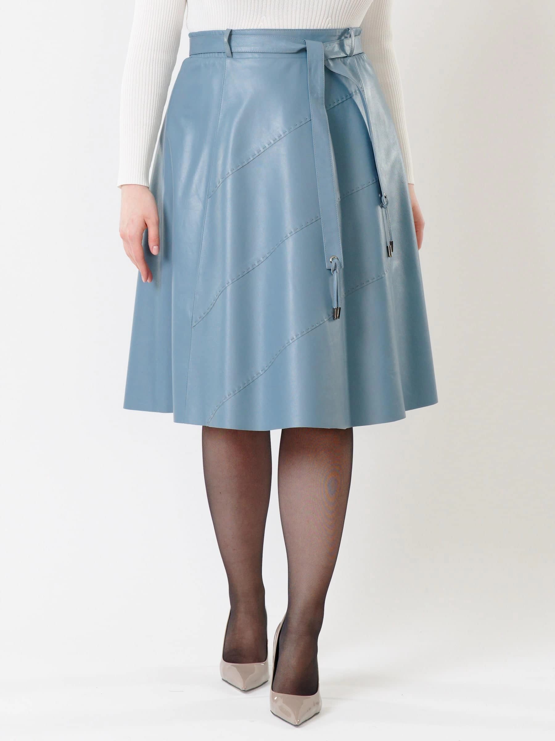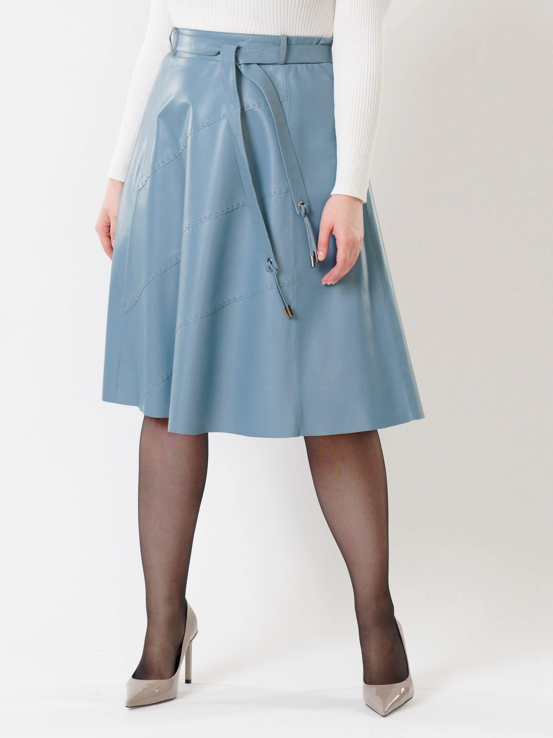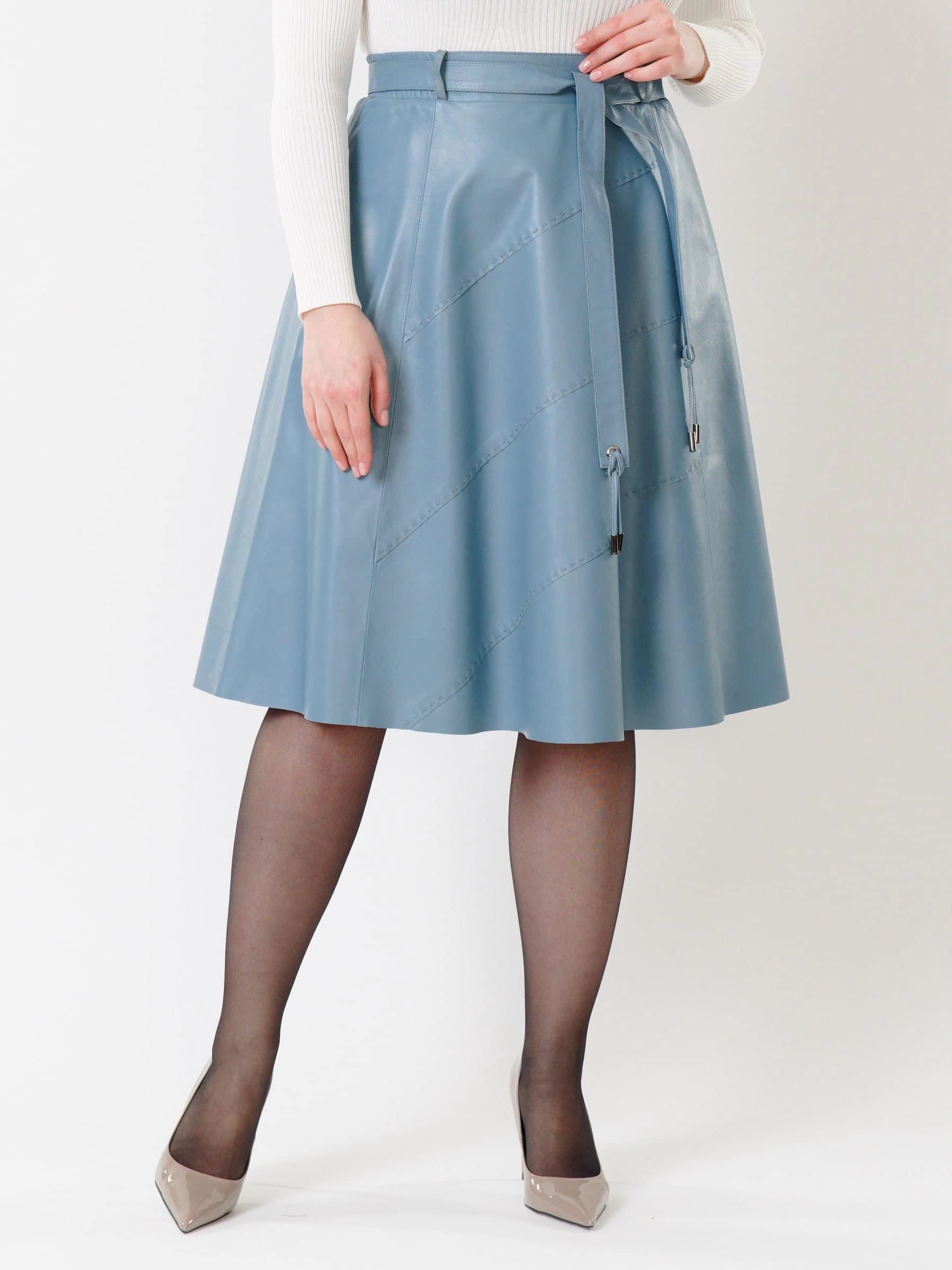 Товар кожаная расклешенная юбка из натуральной кожи 01рс, голубая, размер 46, артикул 85451 выполнен из натуральной кожи с застежкой молния. Рассчитан на сезон: демисезон. Длина изделия 70 см, силуэт расклешенный.