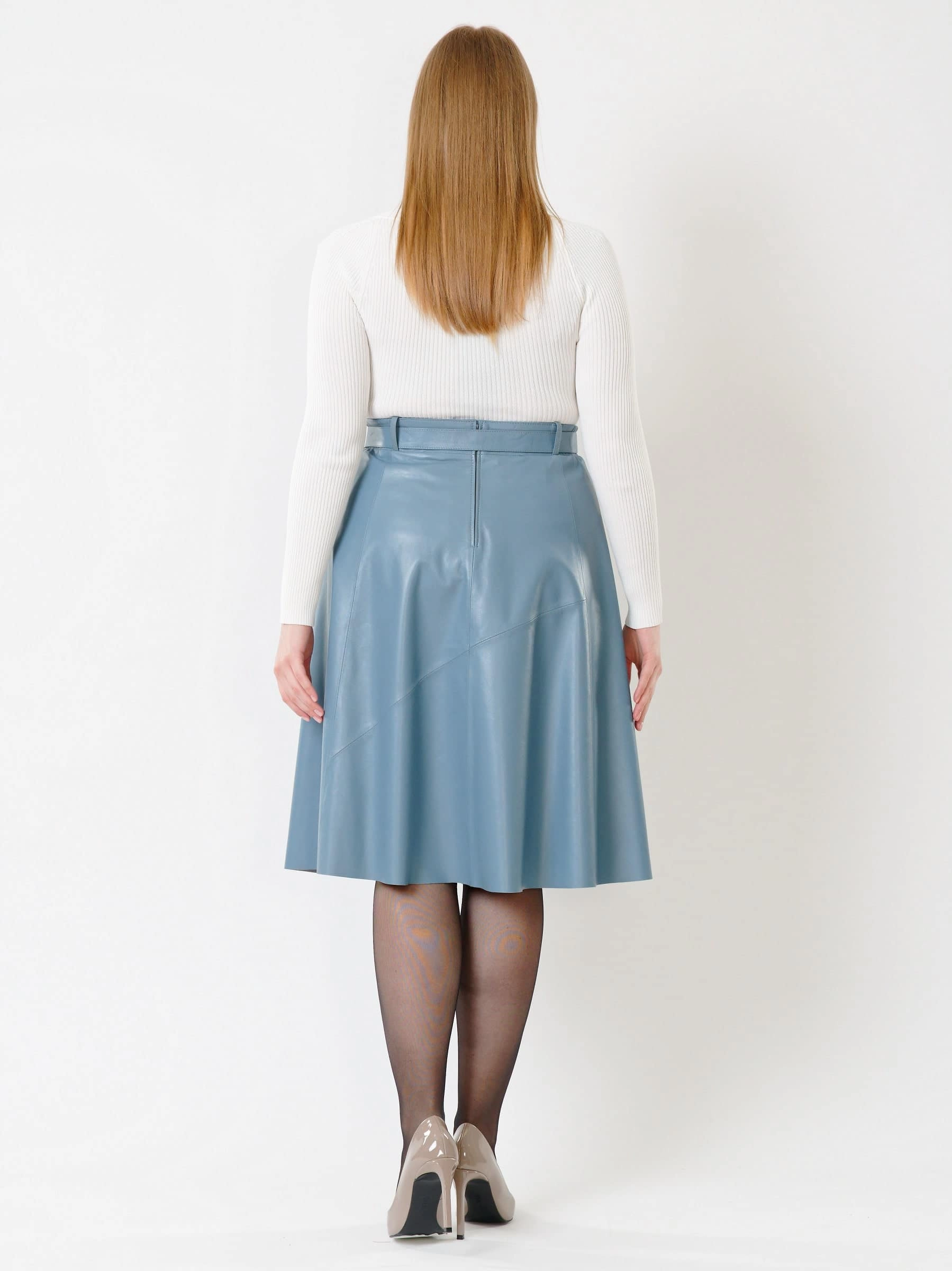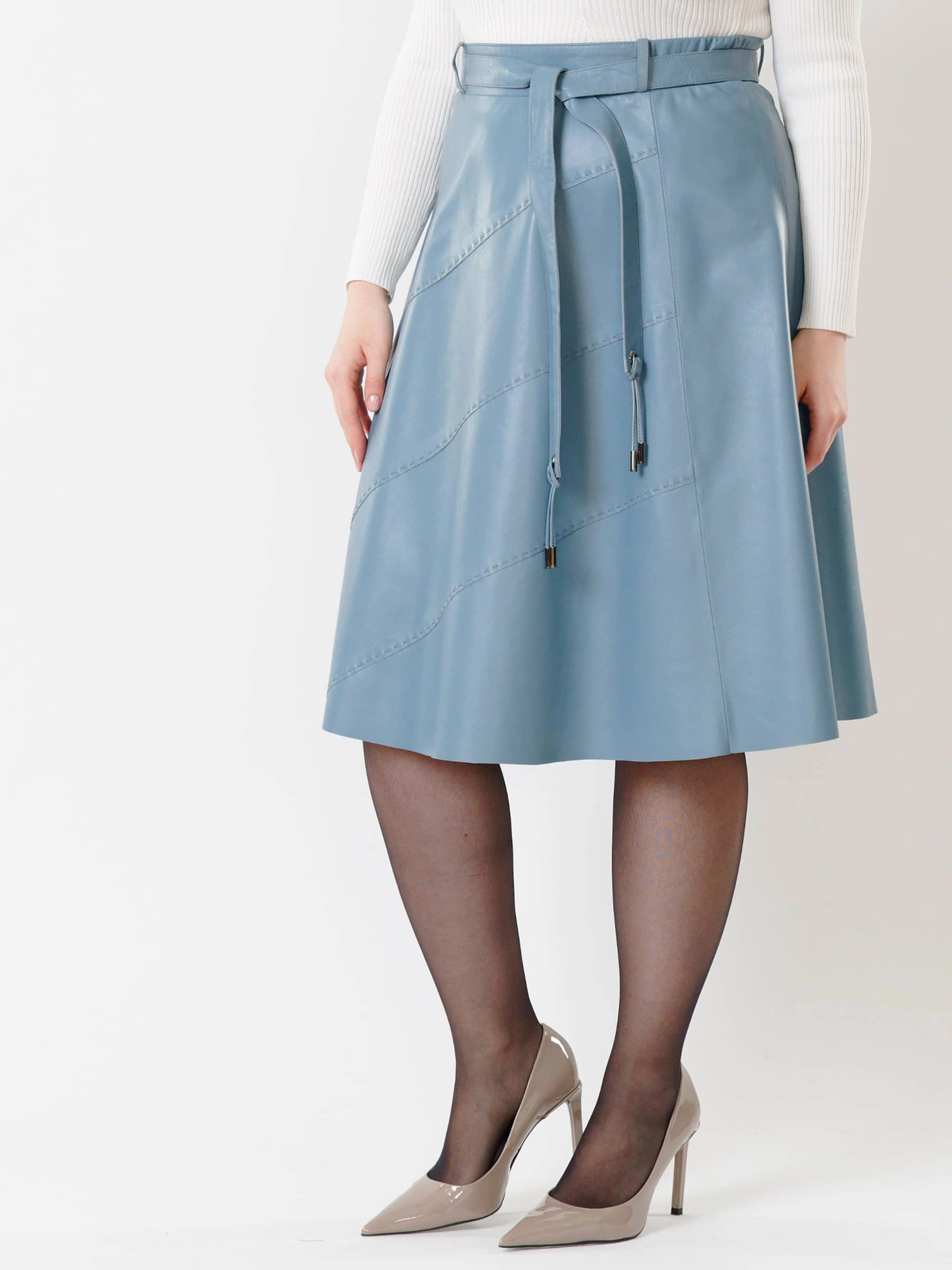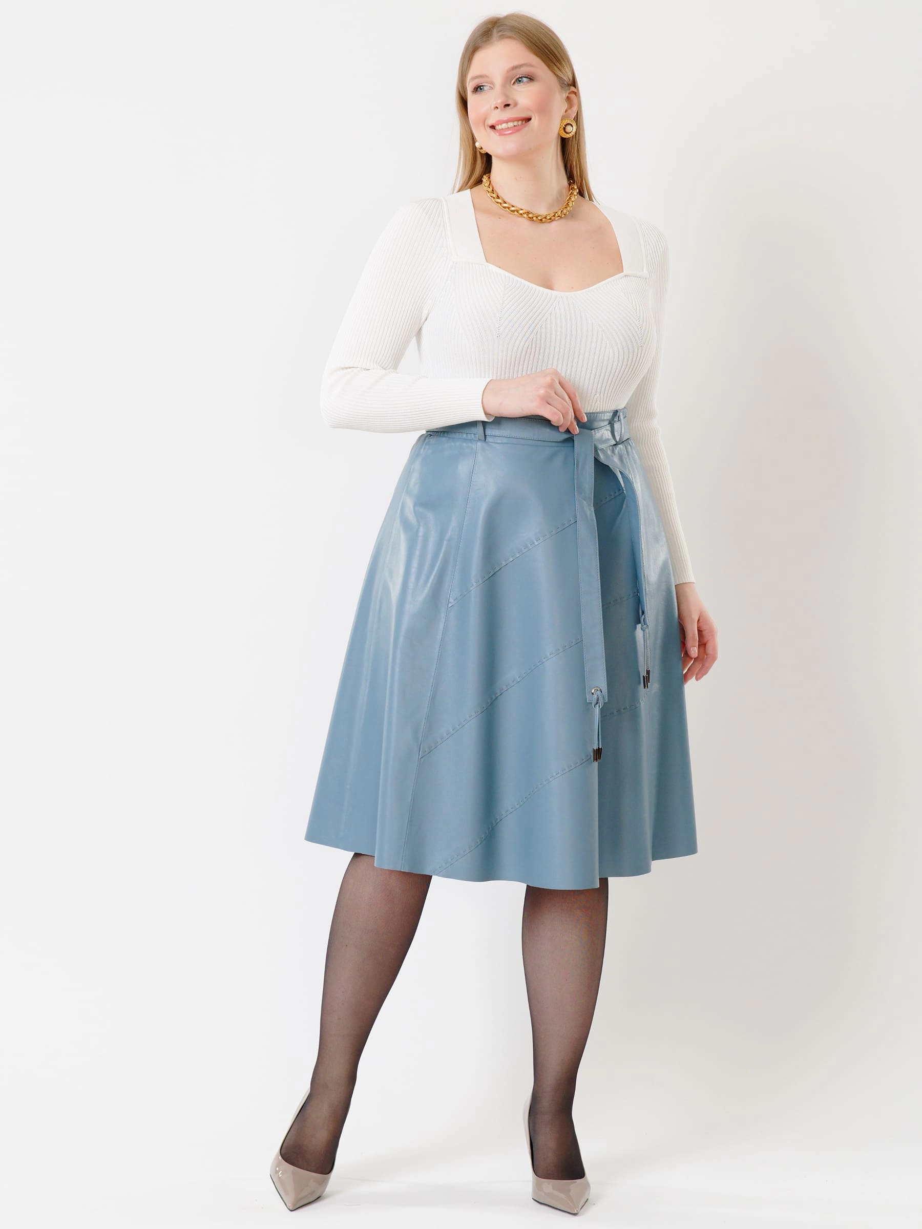 Товар кожаная расклешенная юбка из натуральной кожи 01рс, голубая, размер 46, артикул 85451 выполнен из натуральной кожи с застежкой молния. Рассчитан на сезон: демисезон. Длина изделия 70 см, силуэт расклешенный.