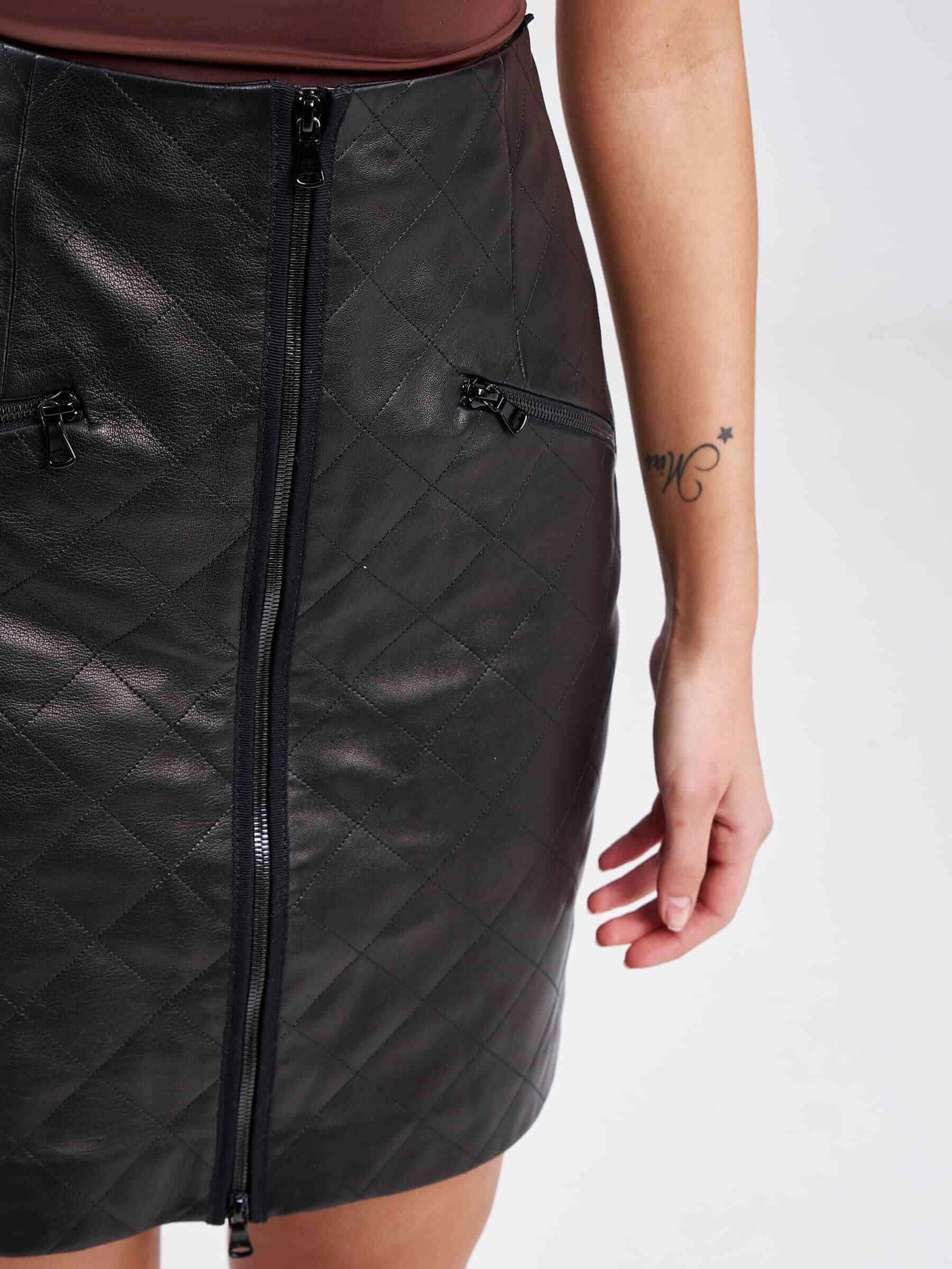 Товар кожаная женская стеганая мини юбка 12, черная, размер 42, артикул 85940 выполнен из натуральной кожи с застежкой молния. Рассчитан на сезон: весна-лето. Длина изделия 50 см, силуэт прямой.