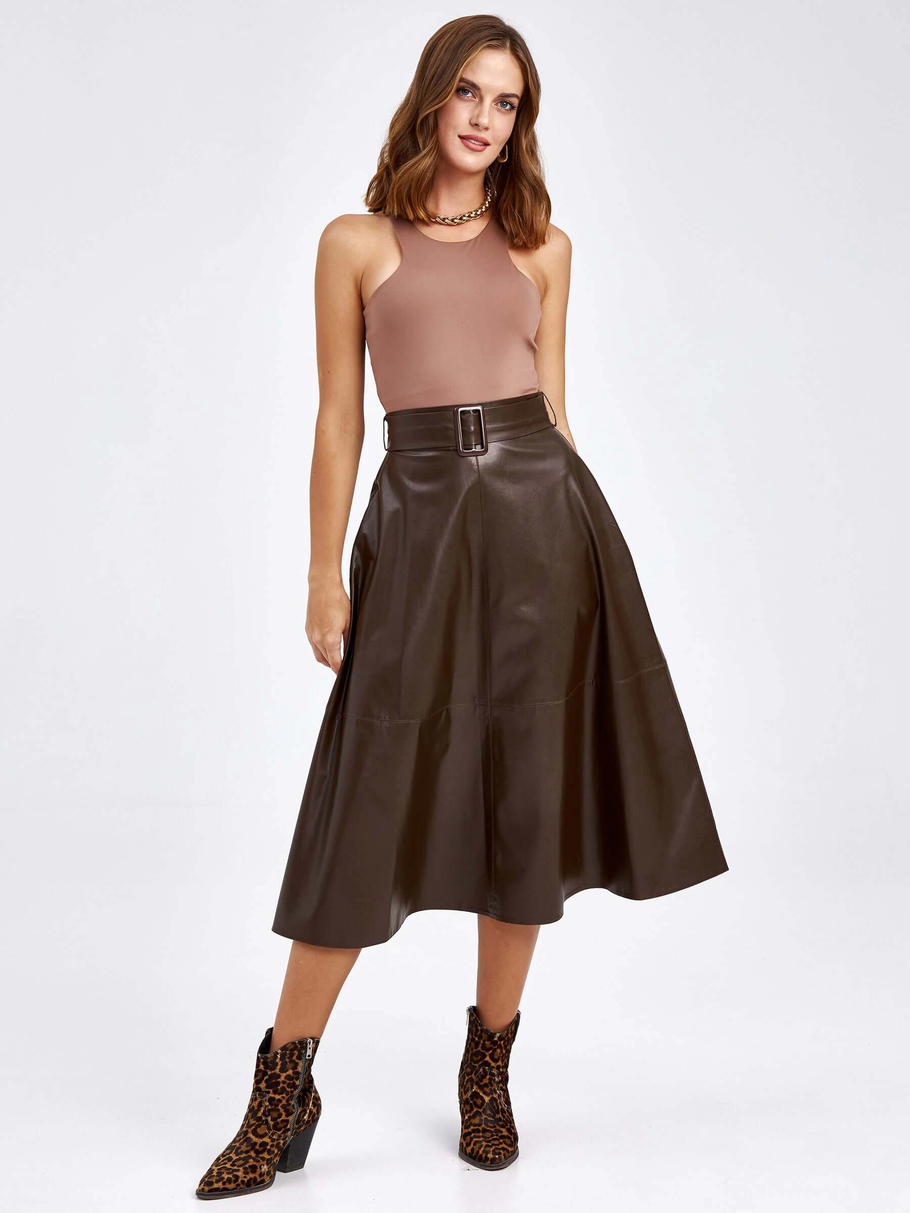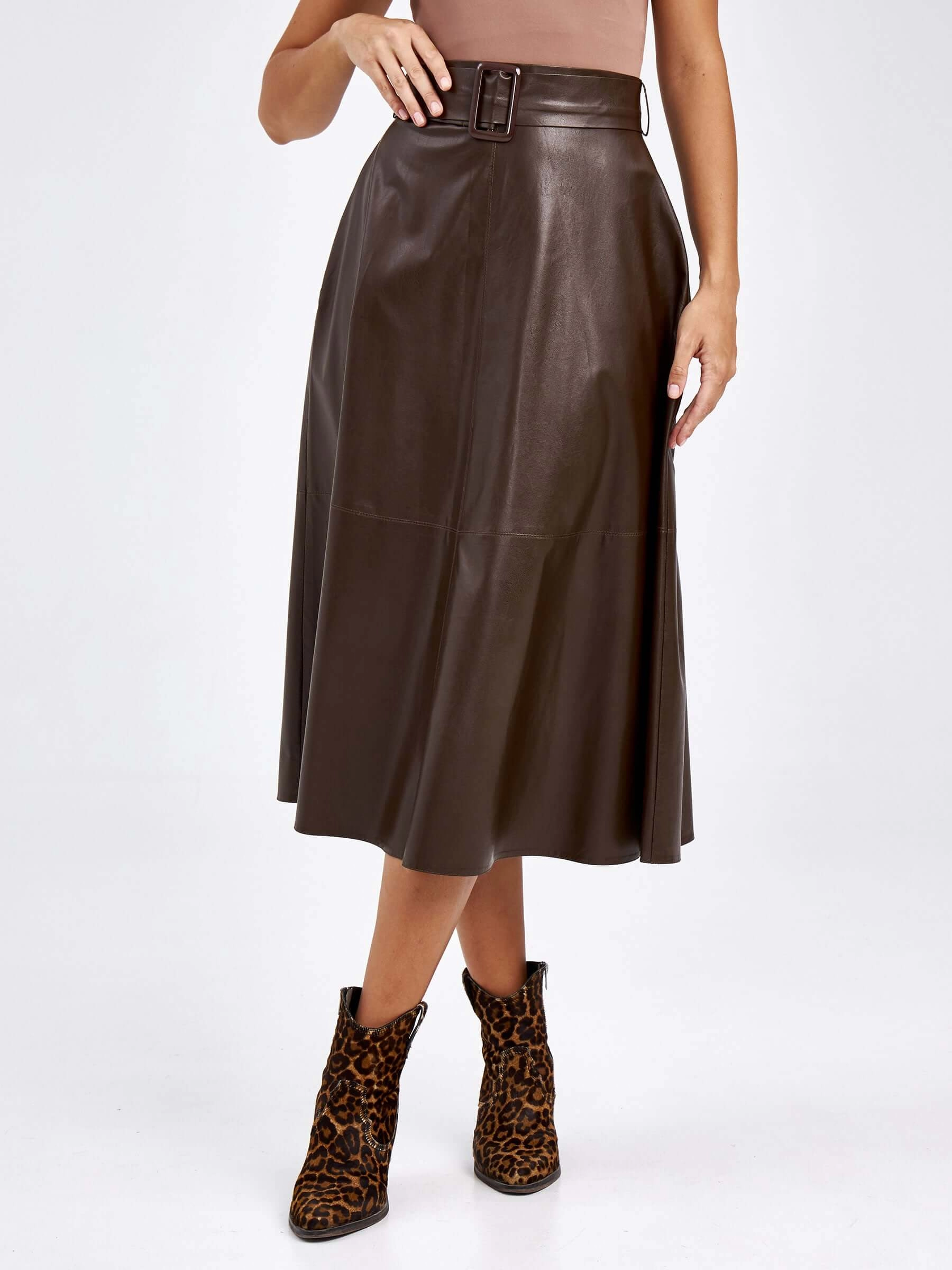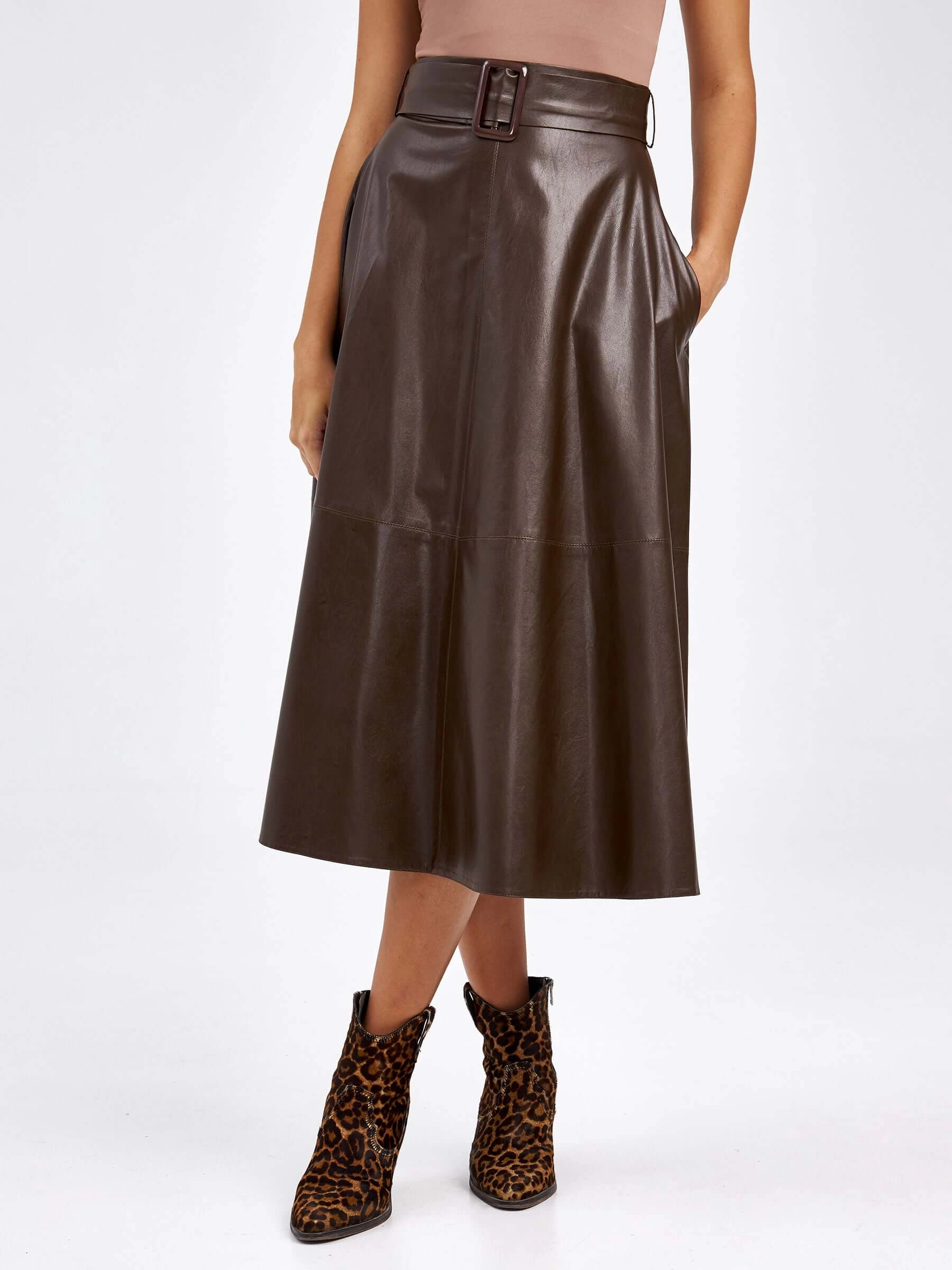 Товар женские кожаная юбка из экокожи 4820748, коричневая, размер 44, артикул 85790 выполнен из экокожи с застежкой молния. Рассчитан на сезон: демисезон. Длина изделия 75-90 см, силуэт расклешенный.