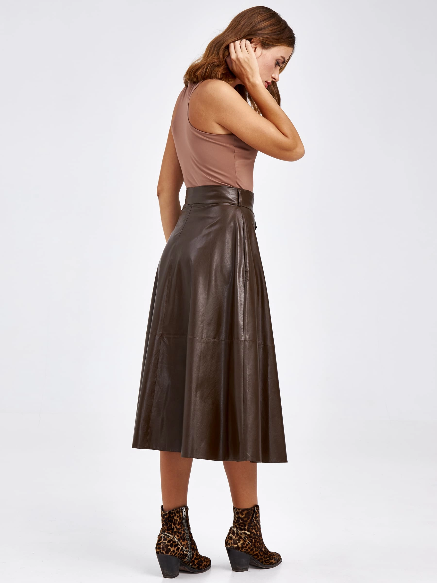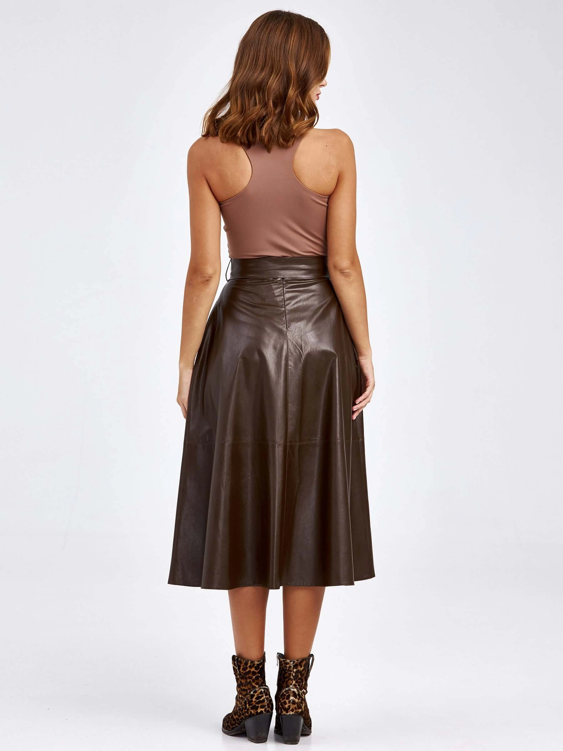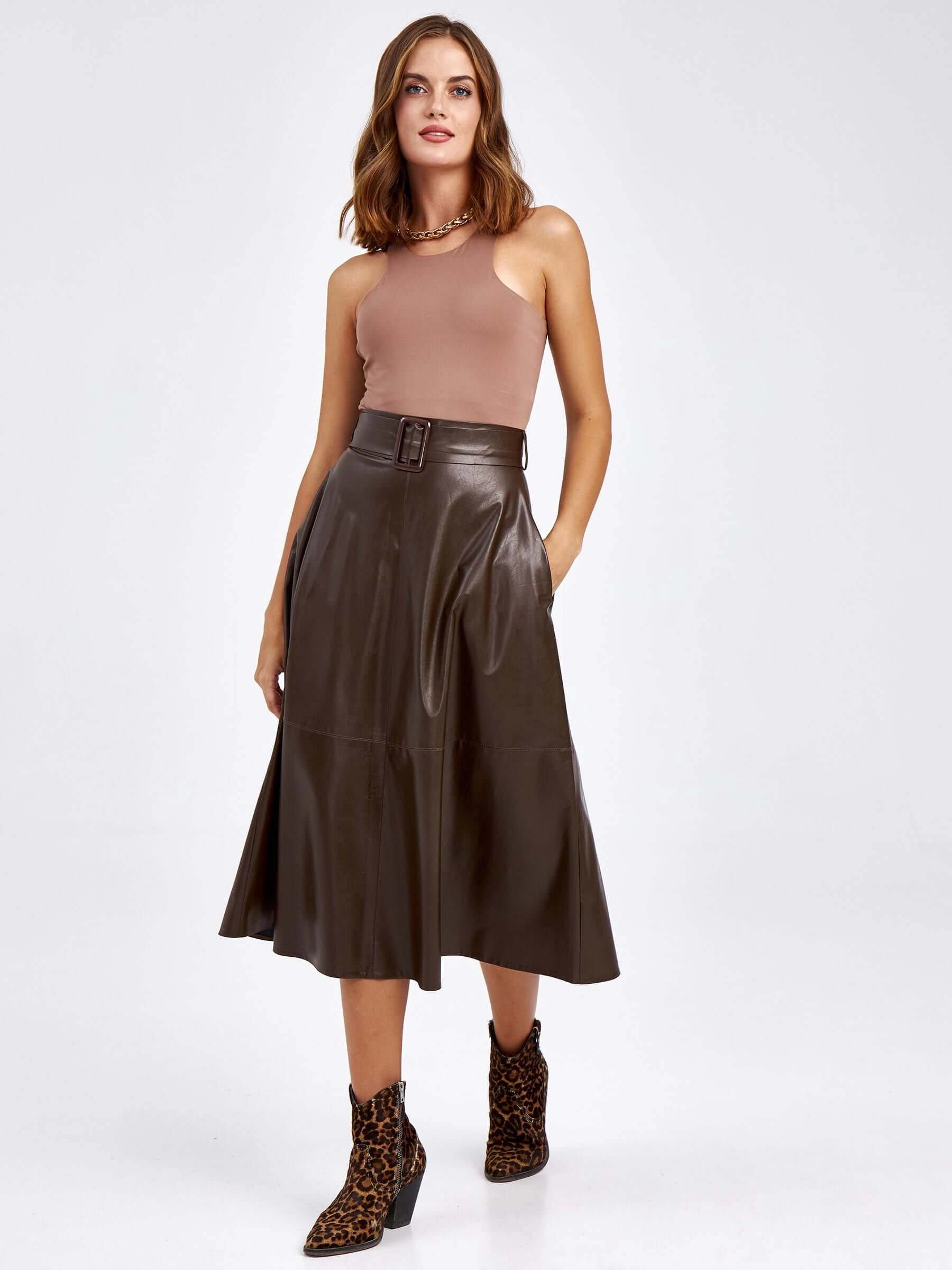 Товар женские кожаная юбка из экокожи 4820748, коричневая, размер 44, артикул 85790 выполнен из экокожи с застежкой молния. Рассчитан на сезон: демисезон. Длина изделия 75-90 см, силуэт расклешенный.