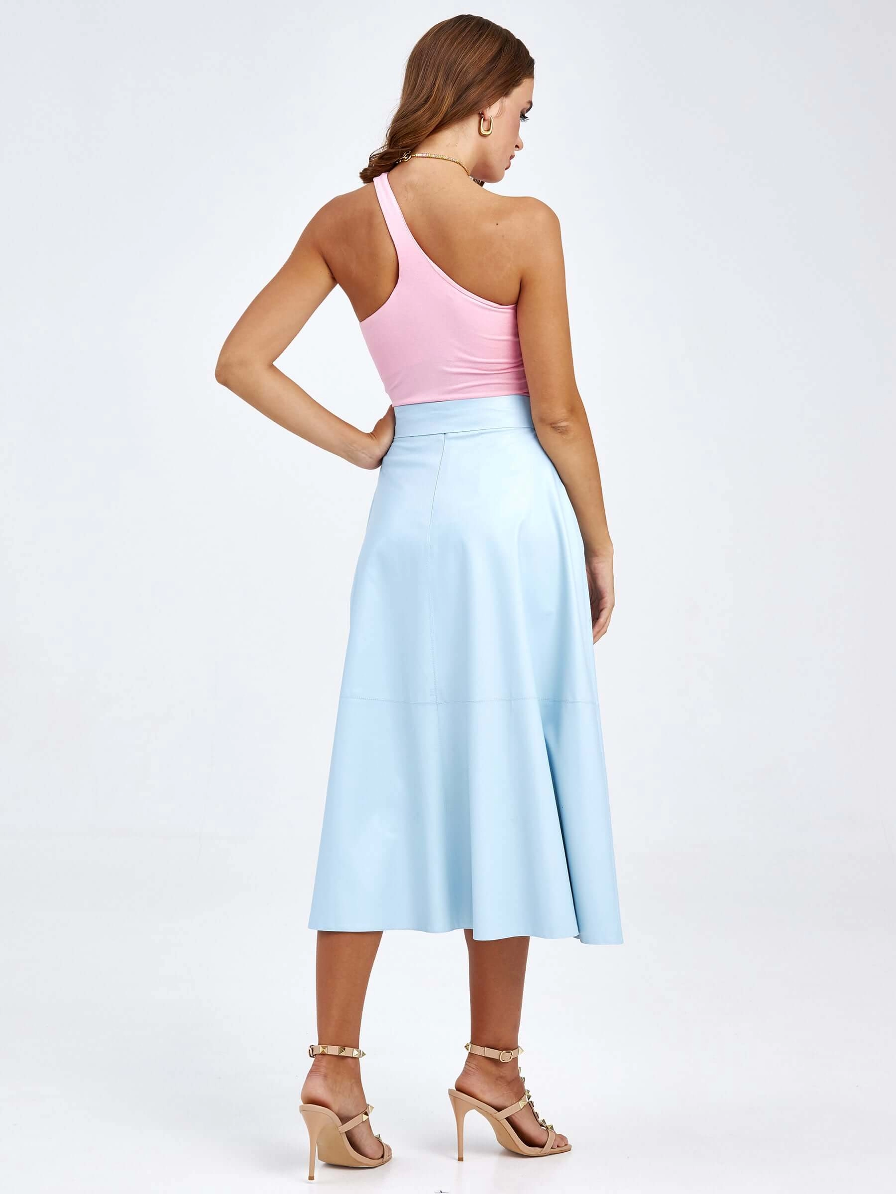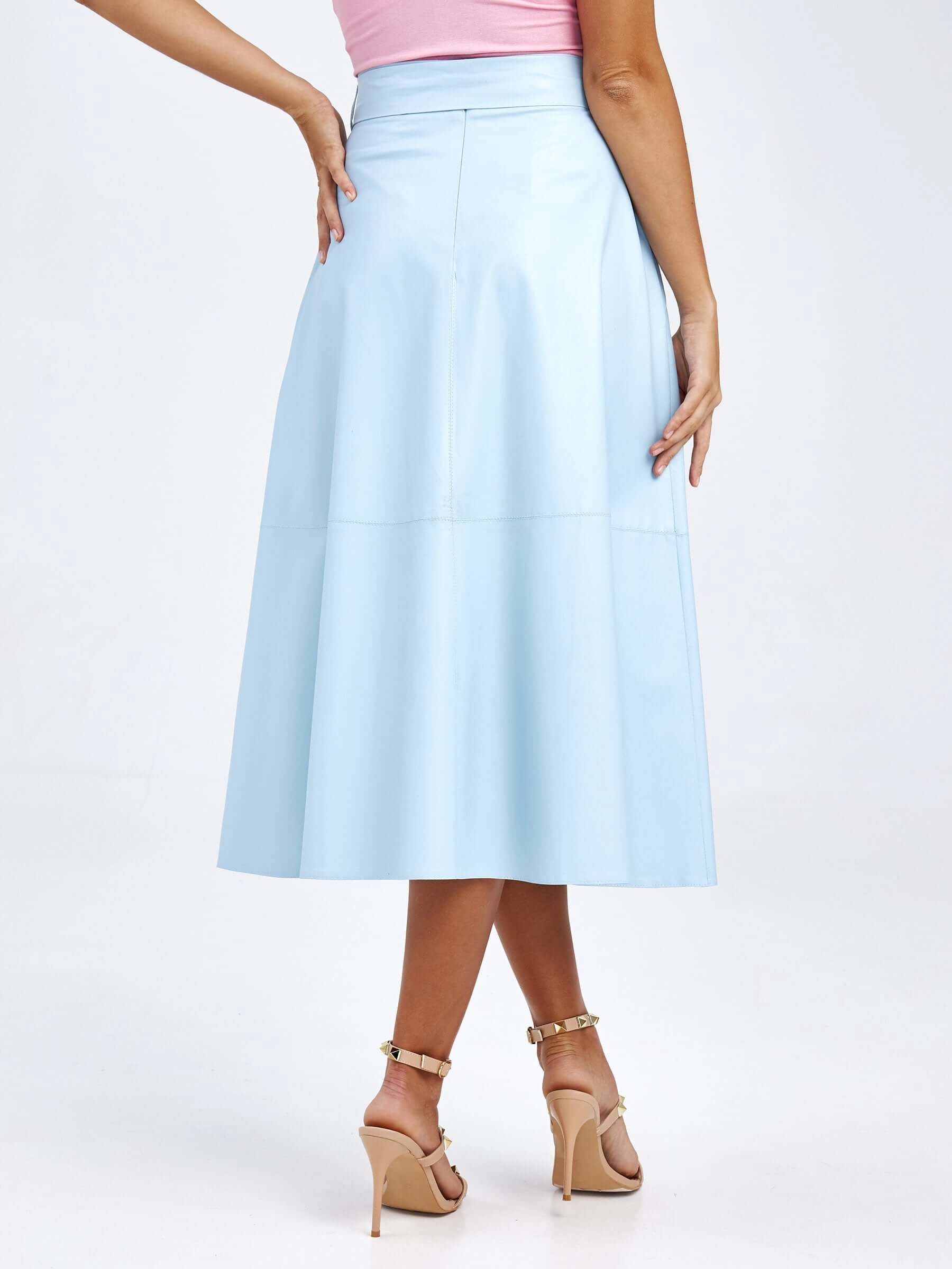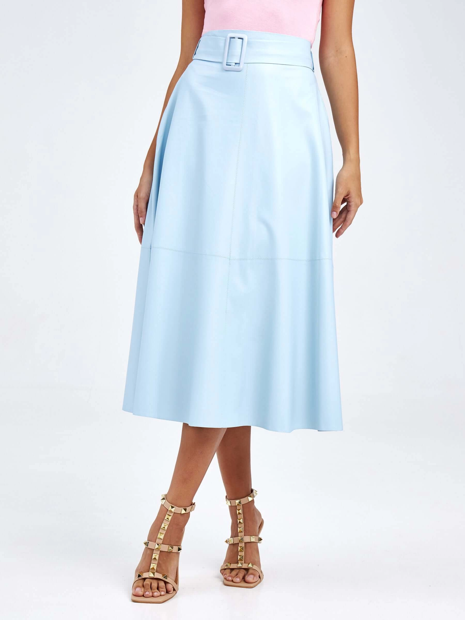 Товар женские кожаная юбка из экокожи 4820757, голубая, размер 48, артикул 85770 выполнен из экокожи с застежкой молния. Рассчитан на сезон: демисезон. Длина изделия 75-90 см, силуэт расклешенный.