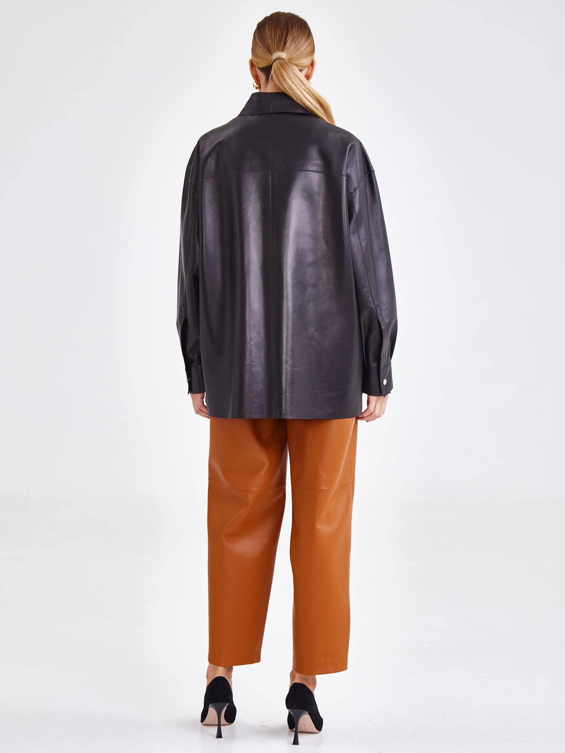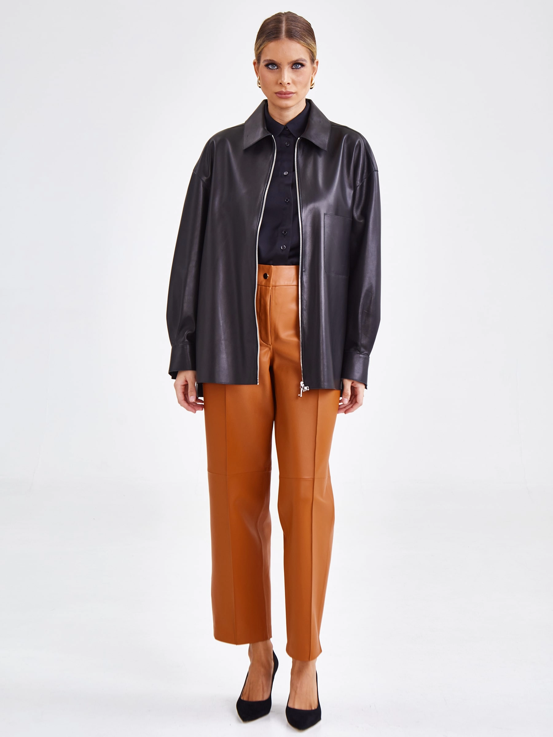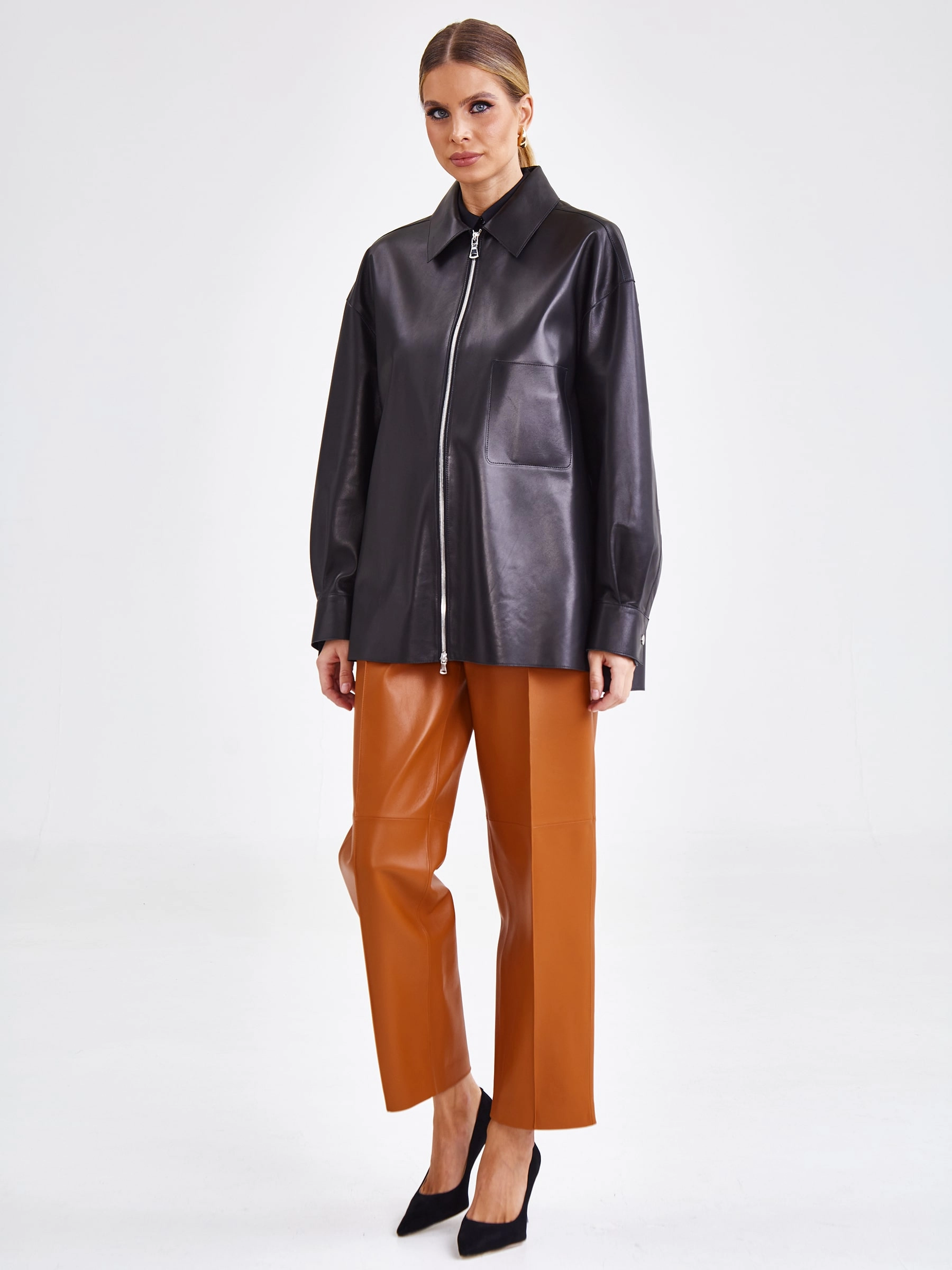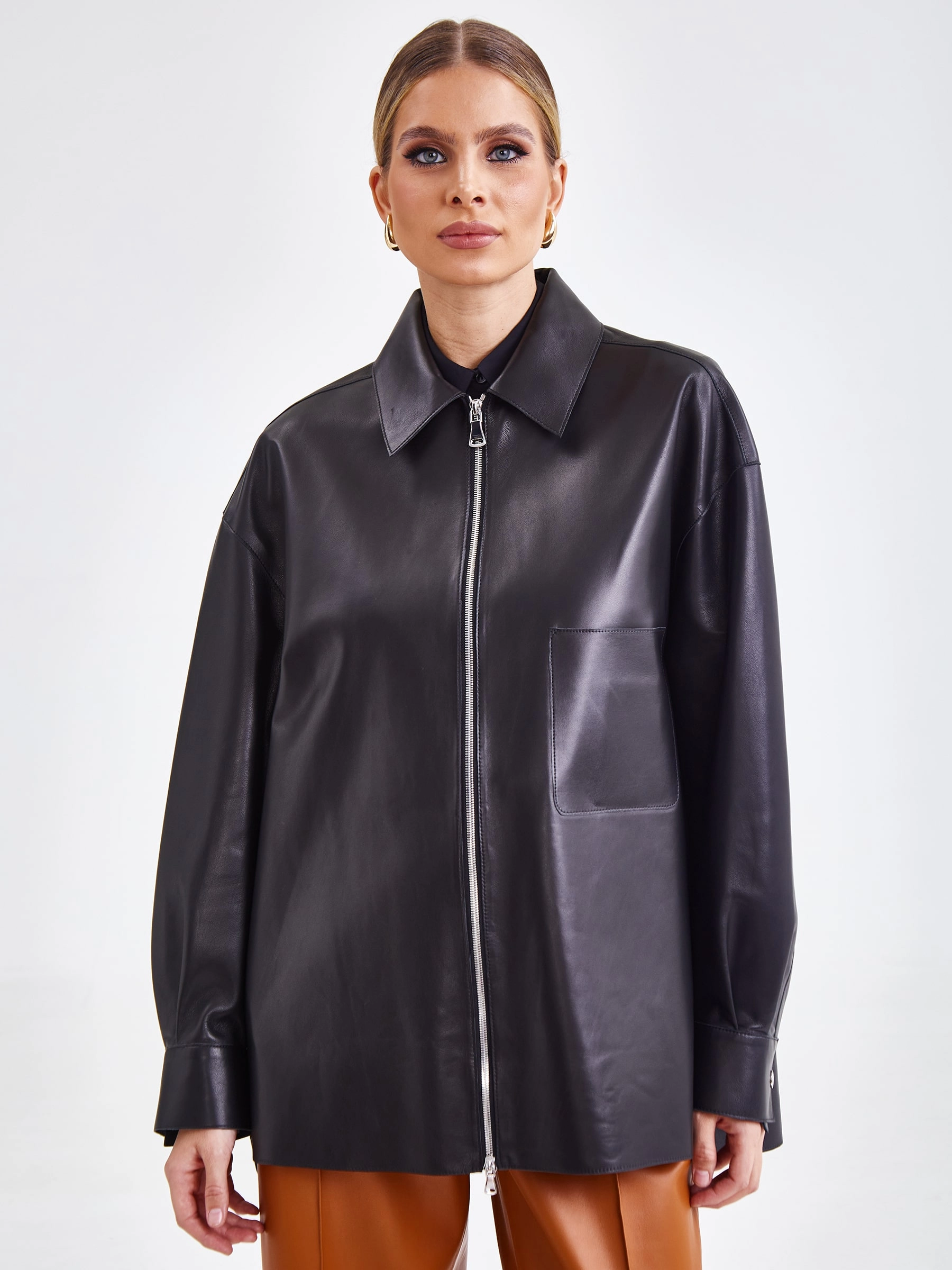 Куртка прямого кроя, с отложным воротником и длинными рукавами. Это альтернатива легкой куртки в прохладные дни. Модель выполнили из тонкой натуральной кожи премиум класса, дополнив боковыми разрезами на молниях.
