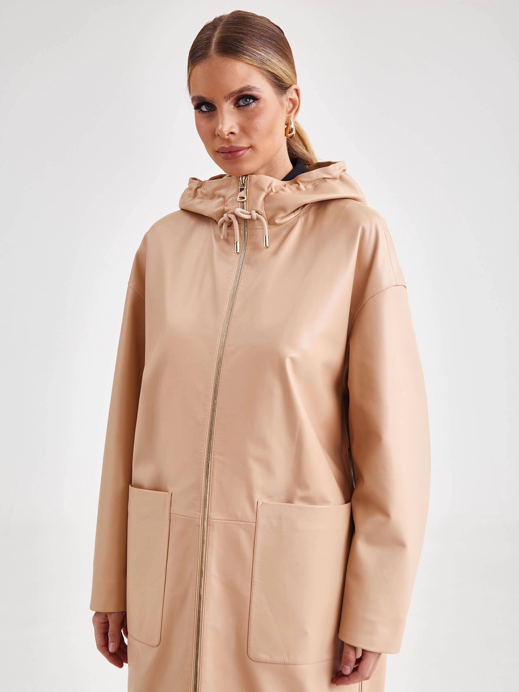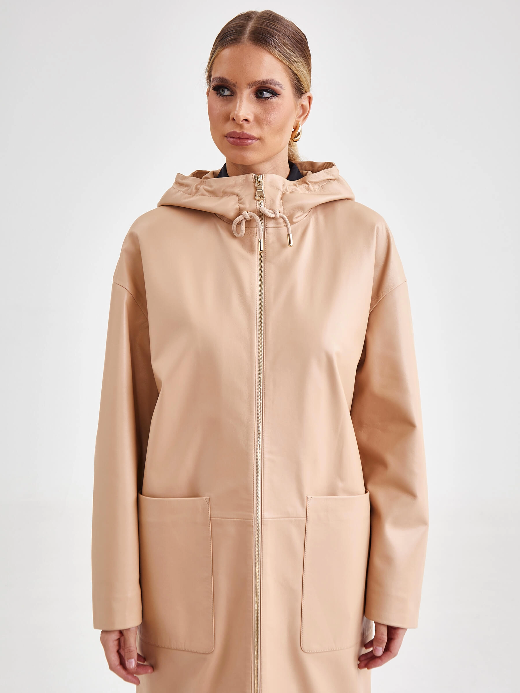 Товар кожаное женское пальто с капюшоном на молнии премиум класса 3034, бежевое, размер 48, артикул 63420 выполнен из натуральной кожи с застежкой молния. Рассчитан на сезон: весна-лето. Длина изделия 100 см, силуэт прямой.
