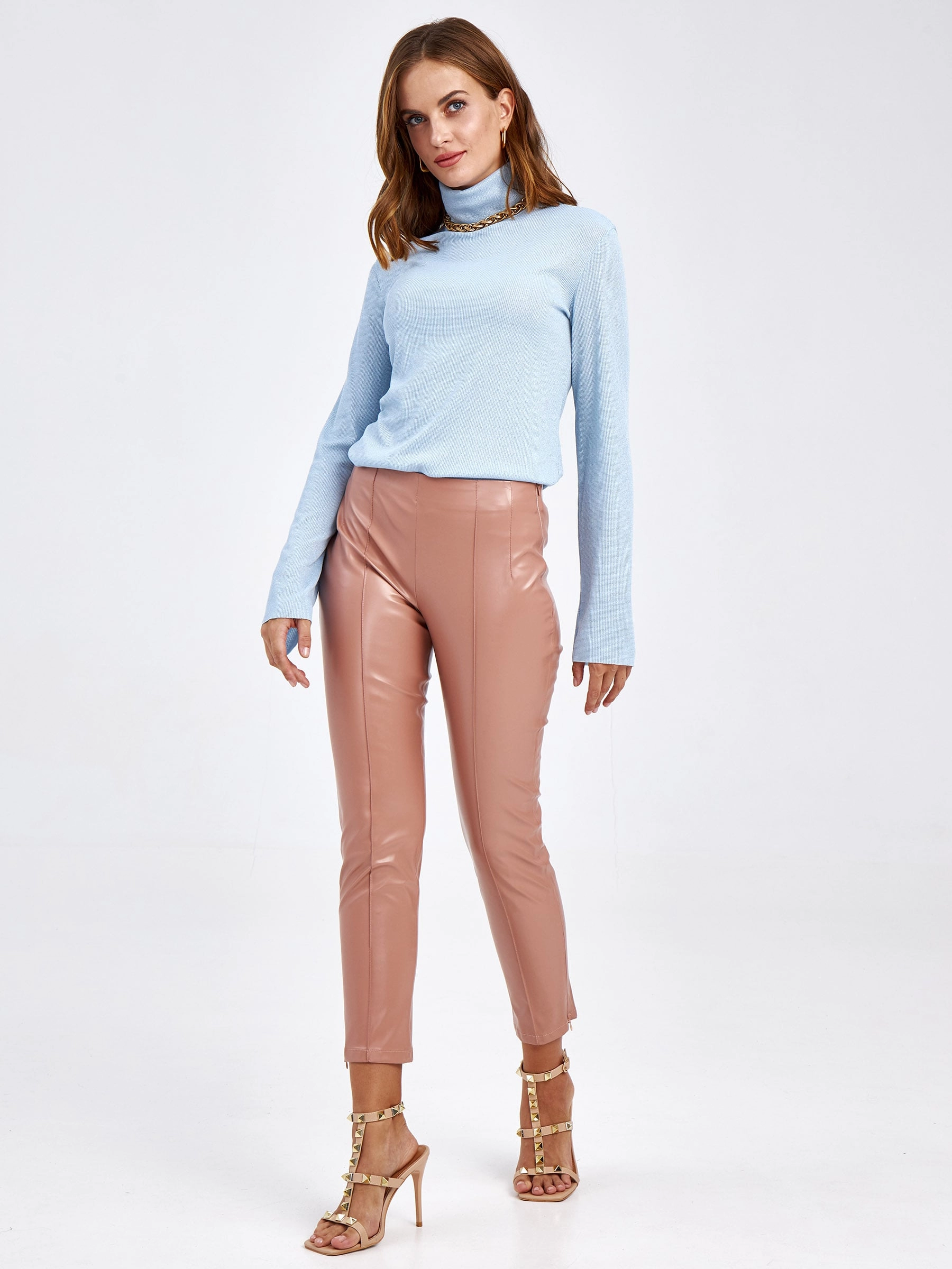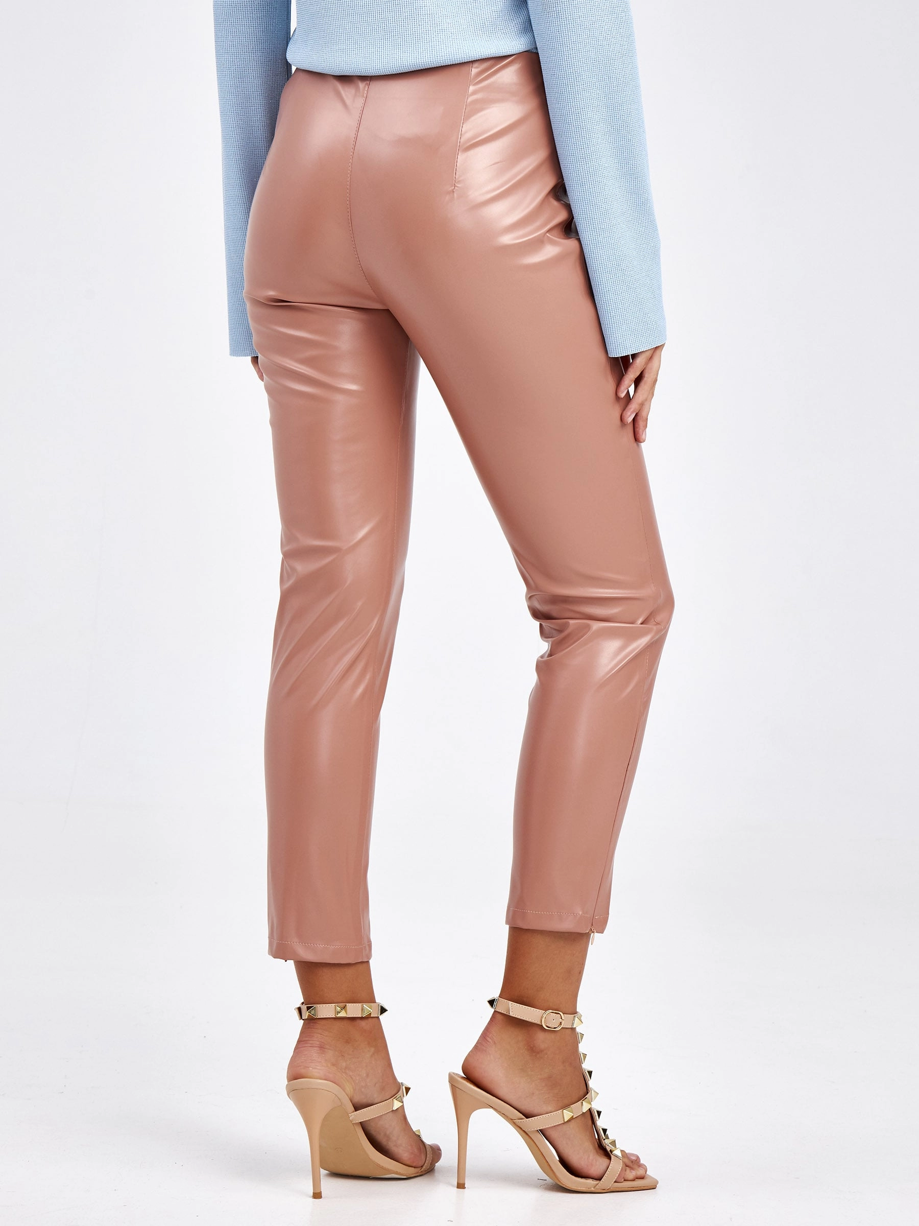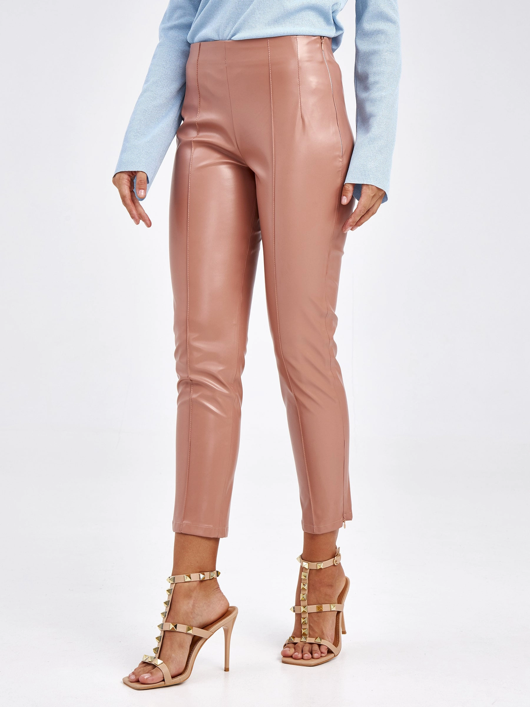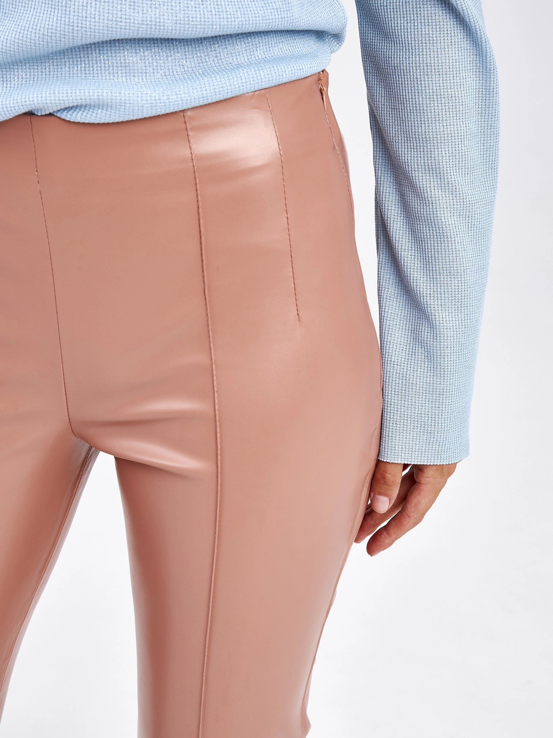 Товар кожаные женские брюки из экокожи 4820734, пудровые, размер 42, артикул 85670 выполнен из экокожи с застежкой молния. Рассчитан на сезон: демисезон. Длина изделия свыше 90 см, силуэт облегающий.