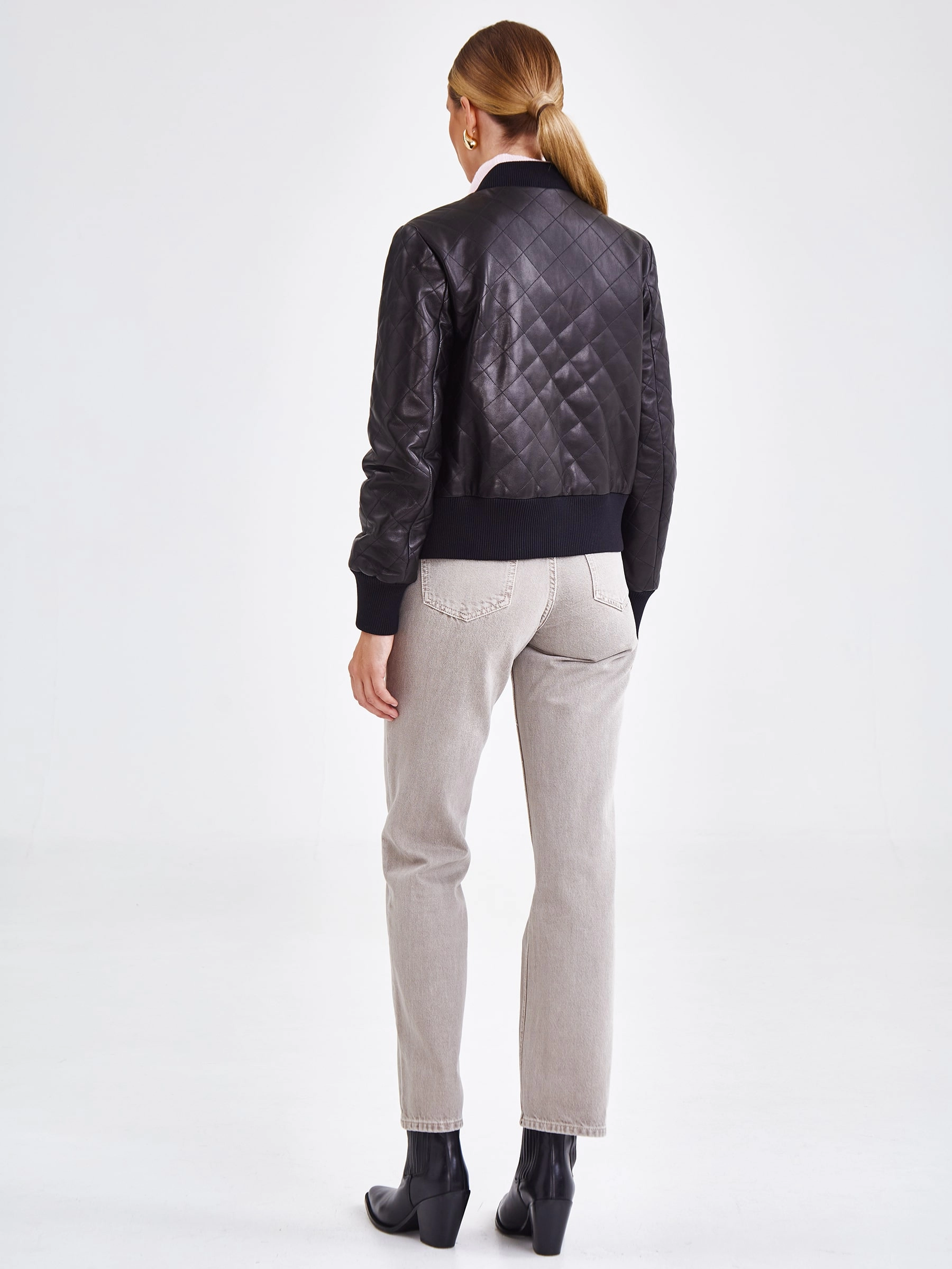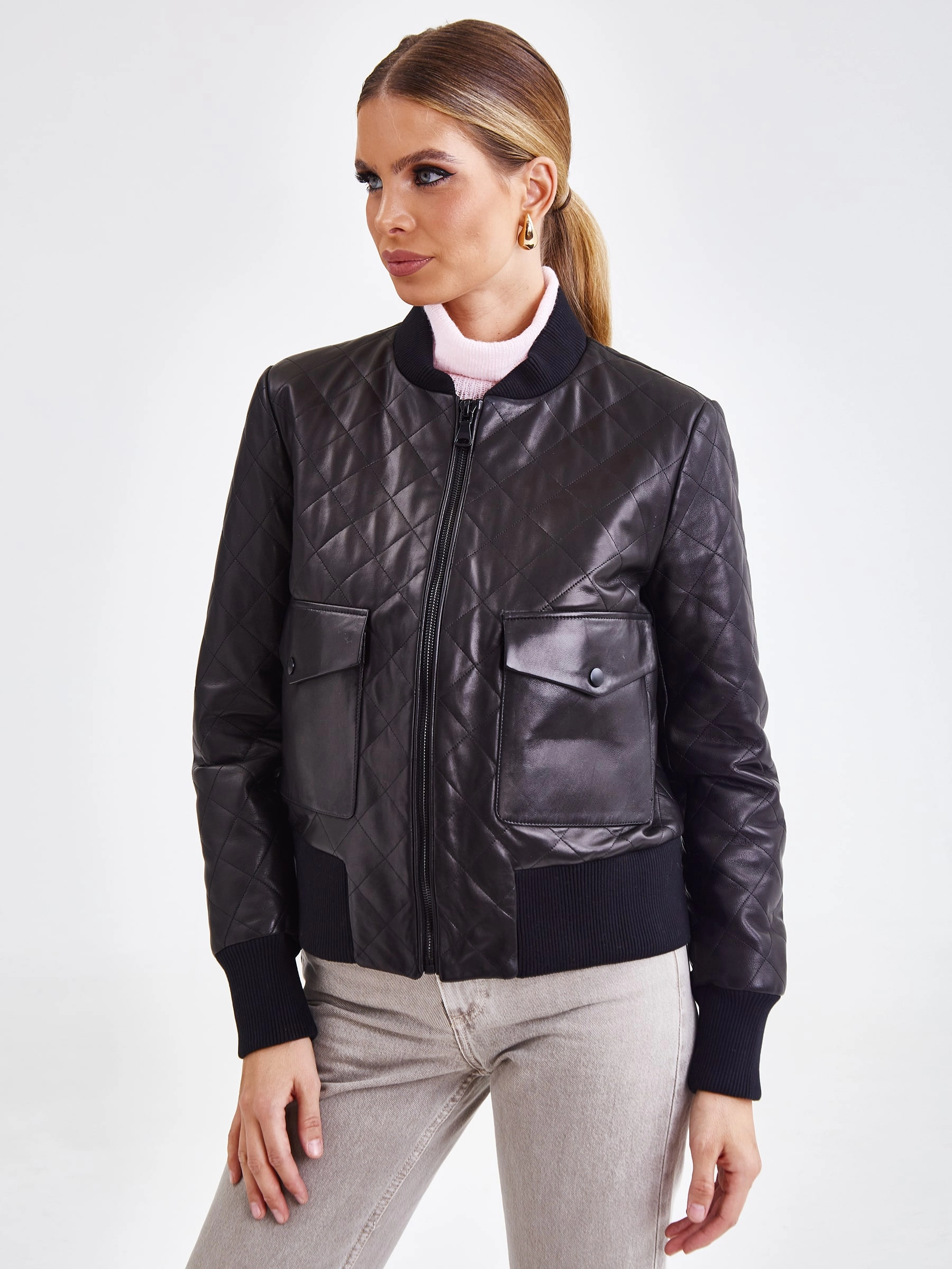 Кожаный стеганый женский бомбер премиум класса 3042, черный, размер 50, артикул 23251