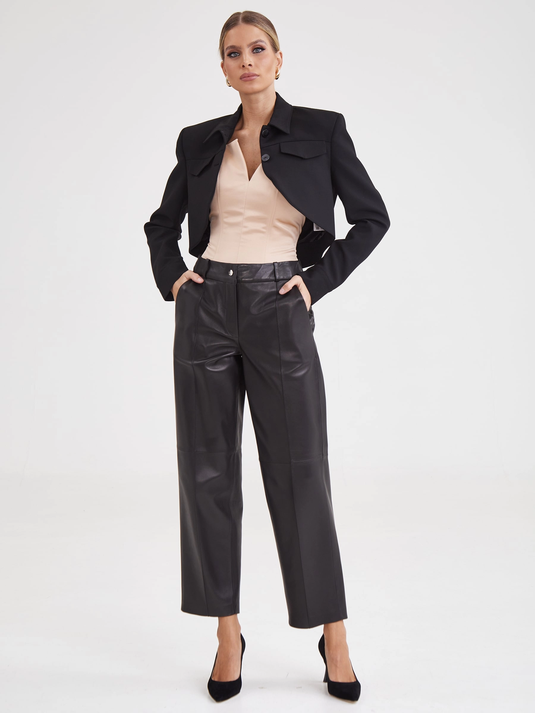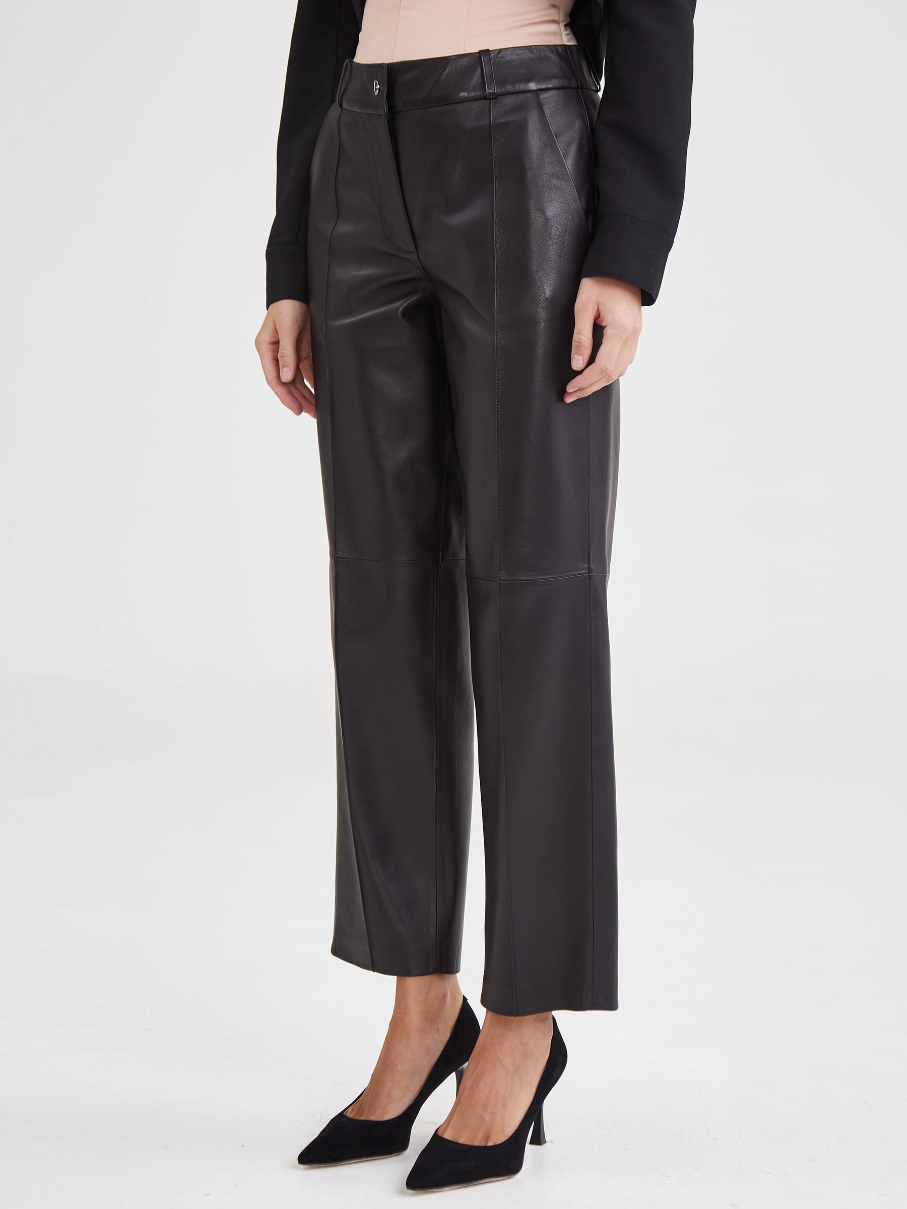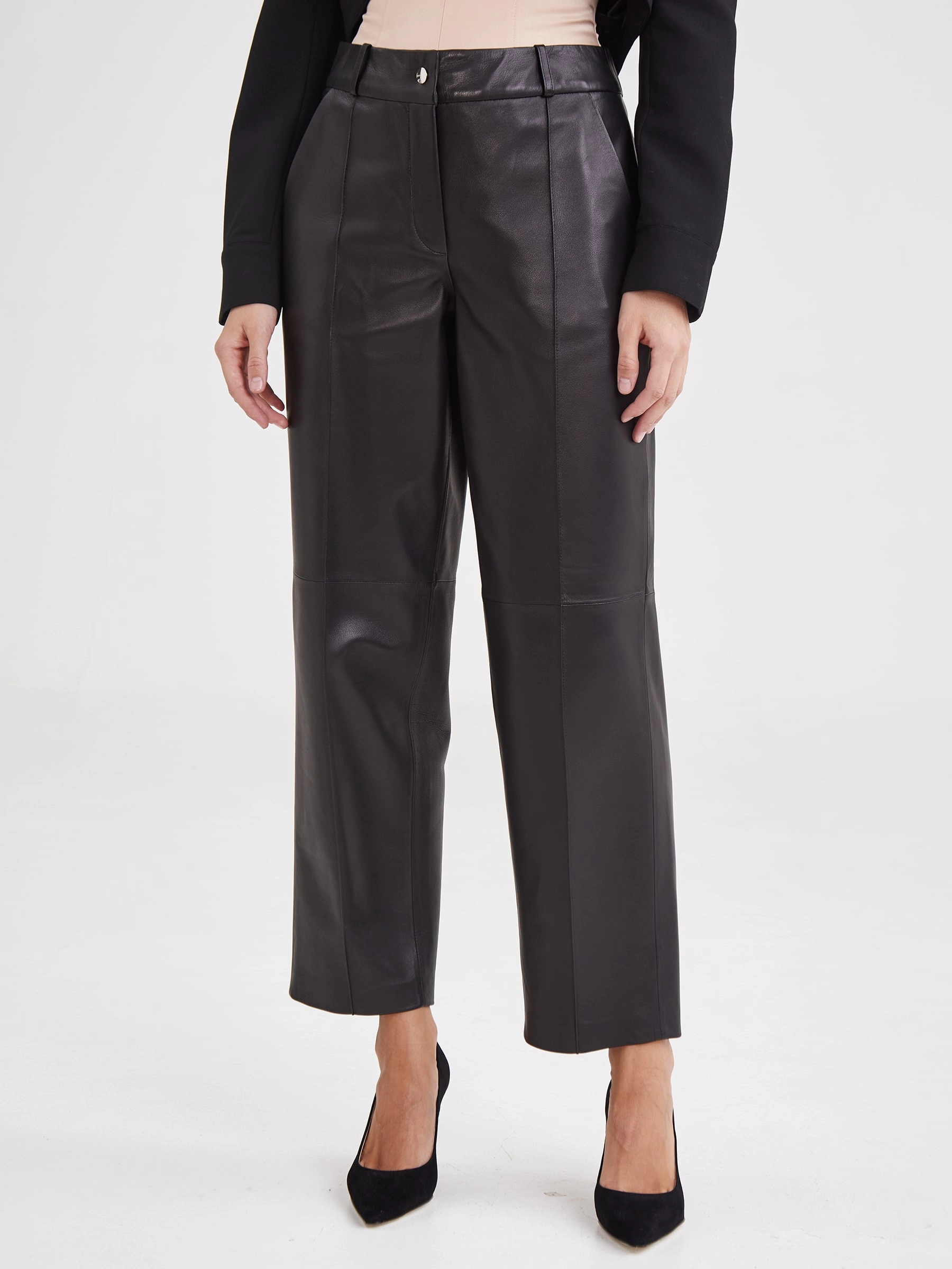 Создать эффектный образ помогут брюки со стрелками из натуральной кожи премиум-класс. Прямой крой, средняя посадка, удобные боковые карманы.