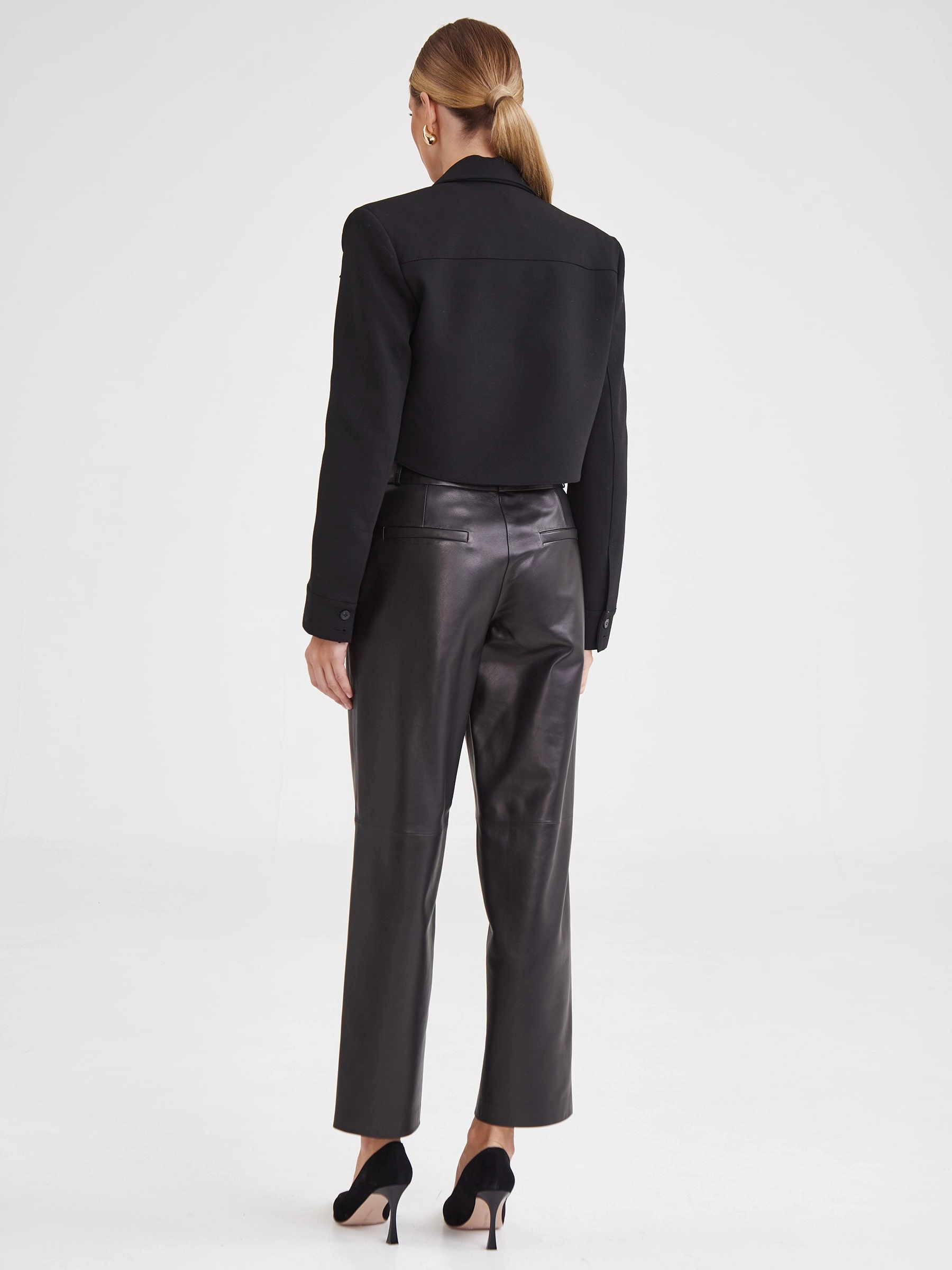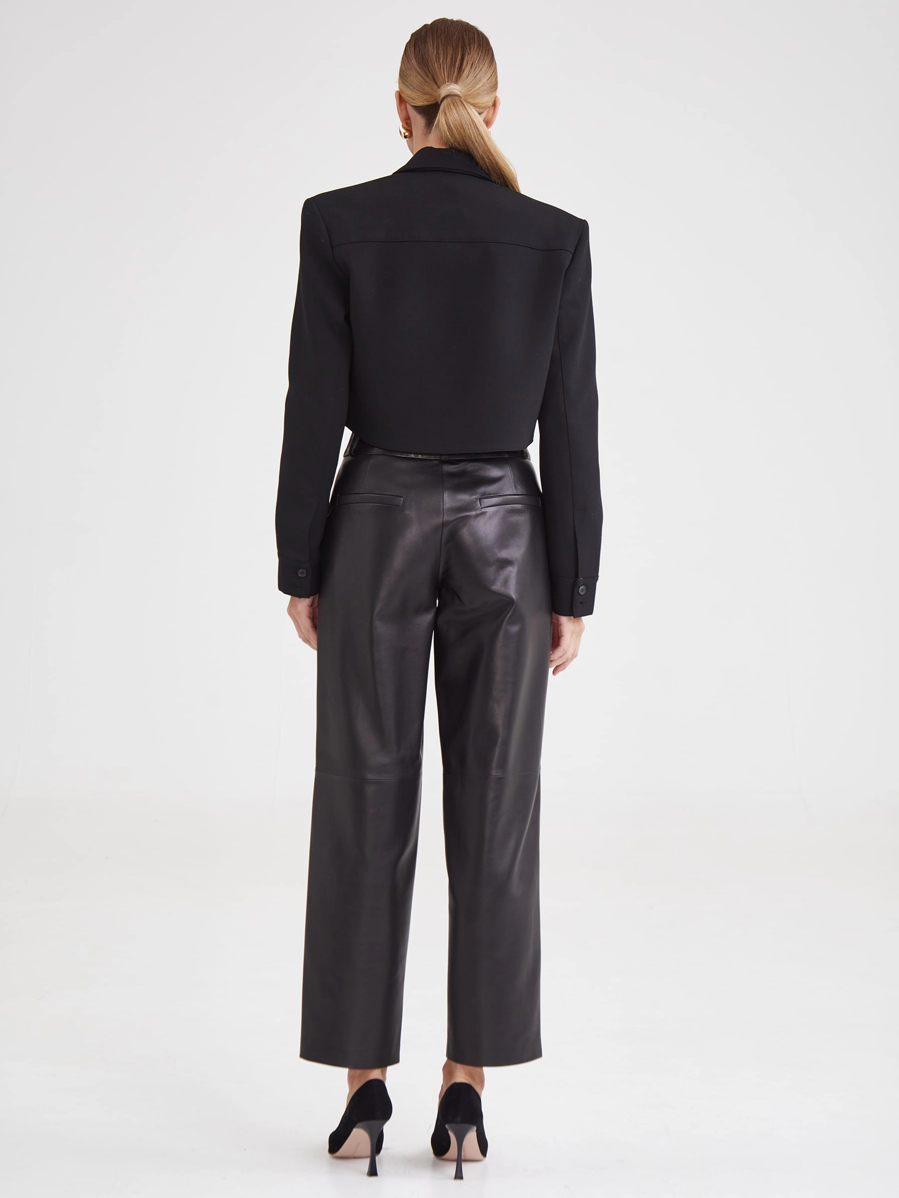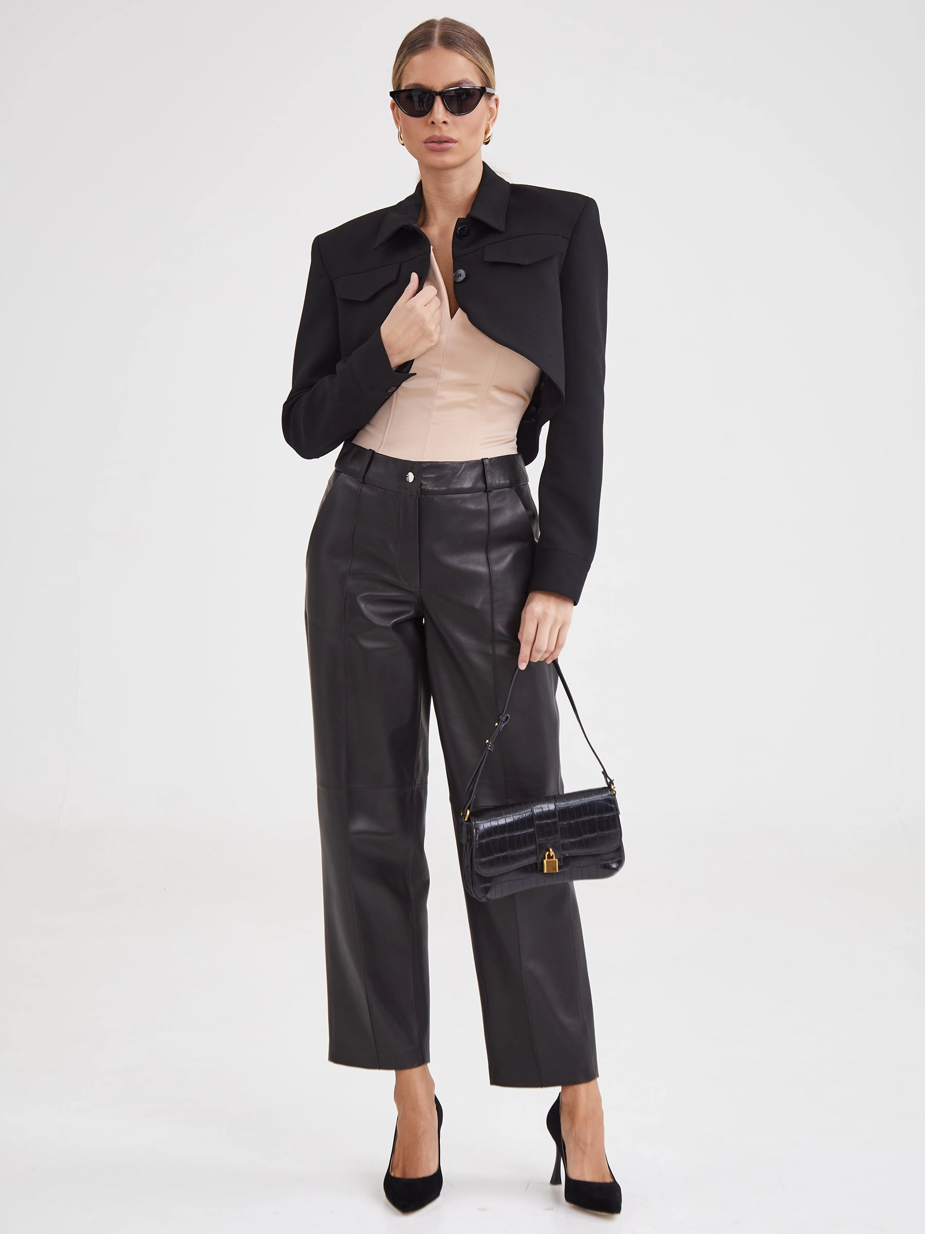 Создать эффектный образ помогут брюки со стрелками из натуральной кожи премиум-класс. Прямой крой, средняя посадка, удобные боковые карманы.