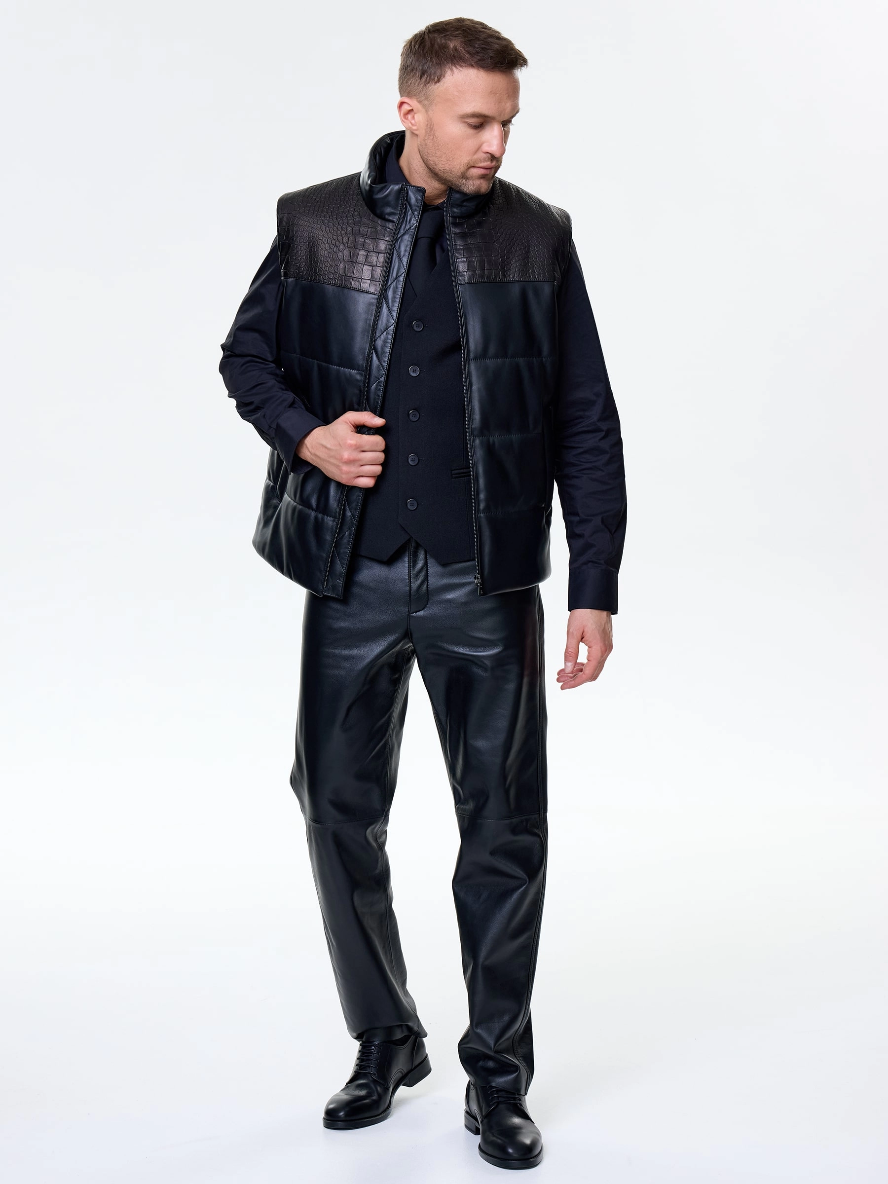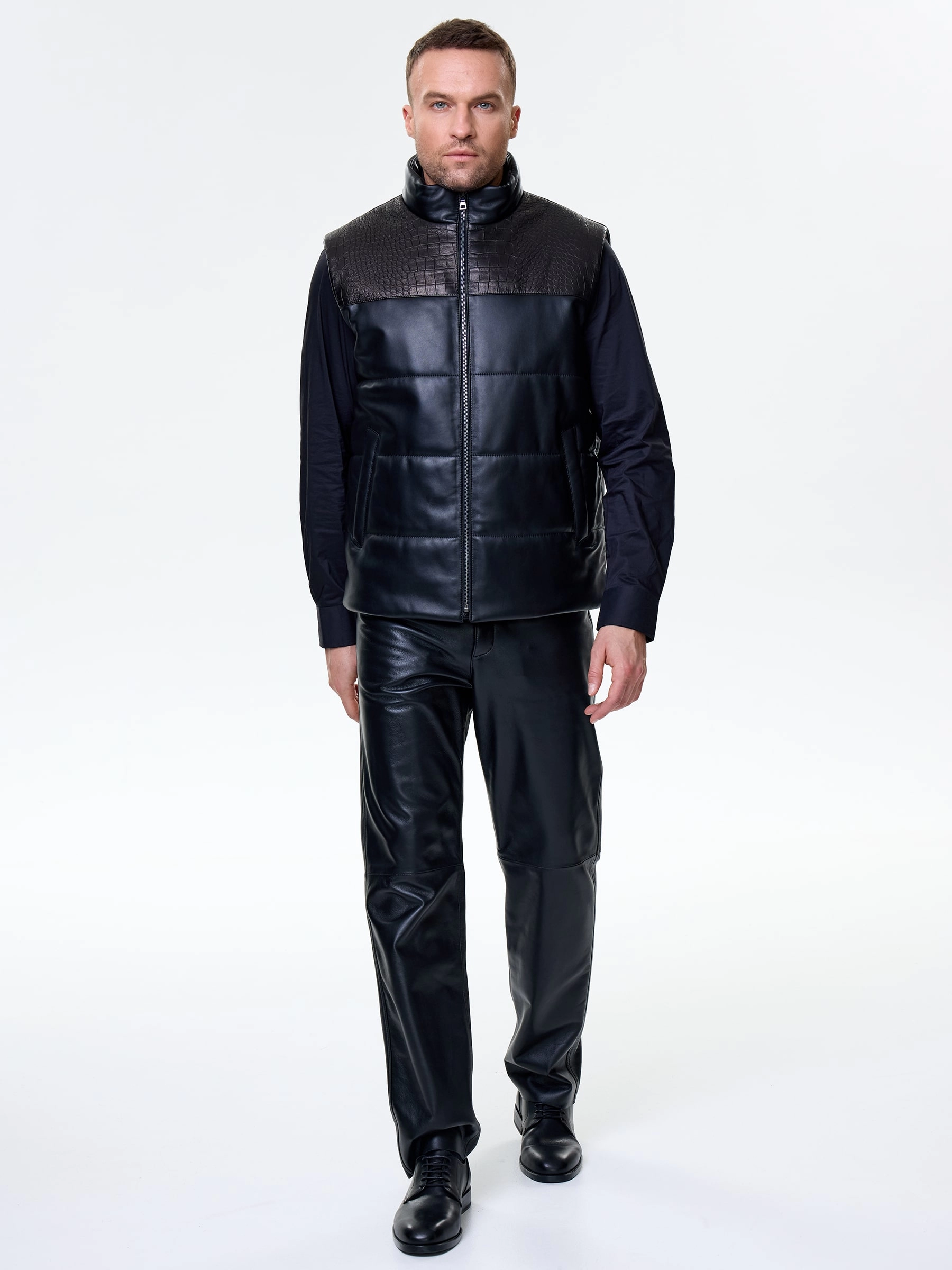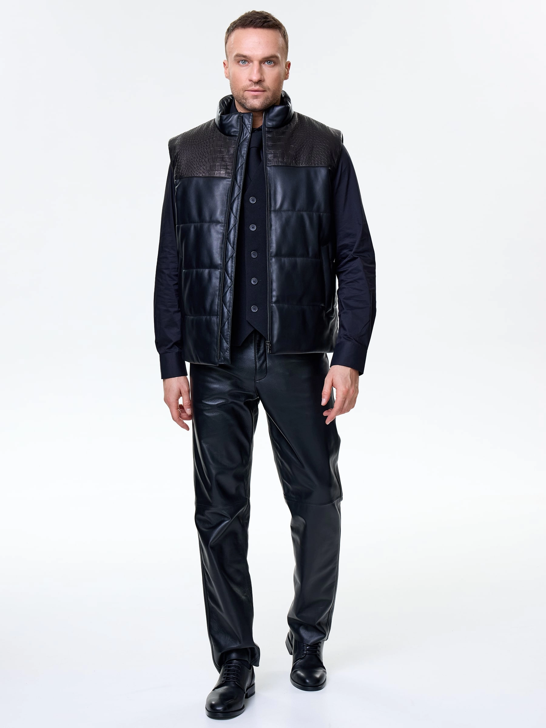 Кожаный комбинированный мужской жилет премиум класса 02, черный, размер 48, артикул 41160