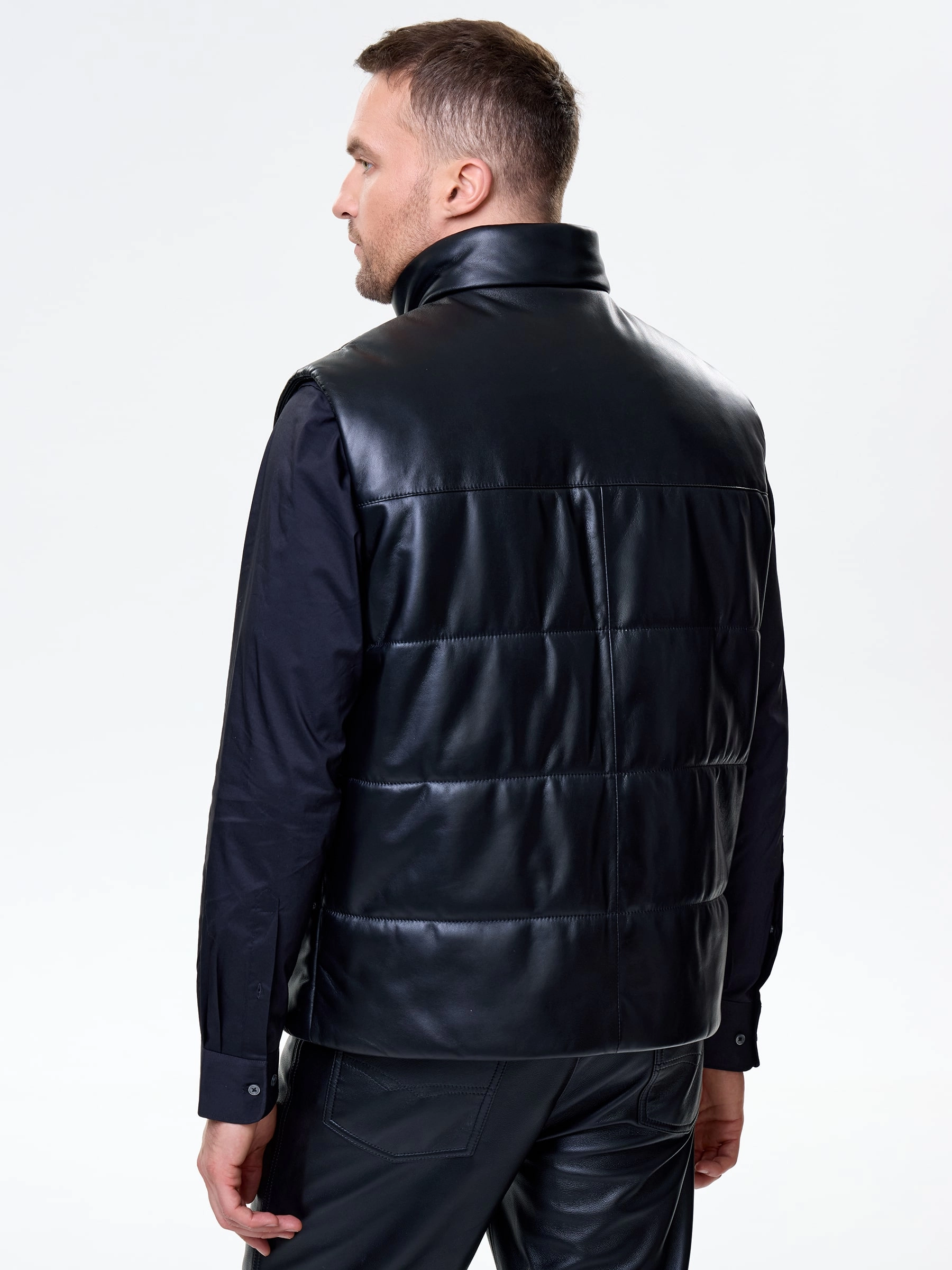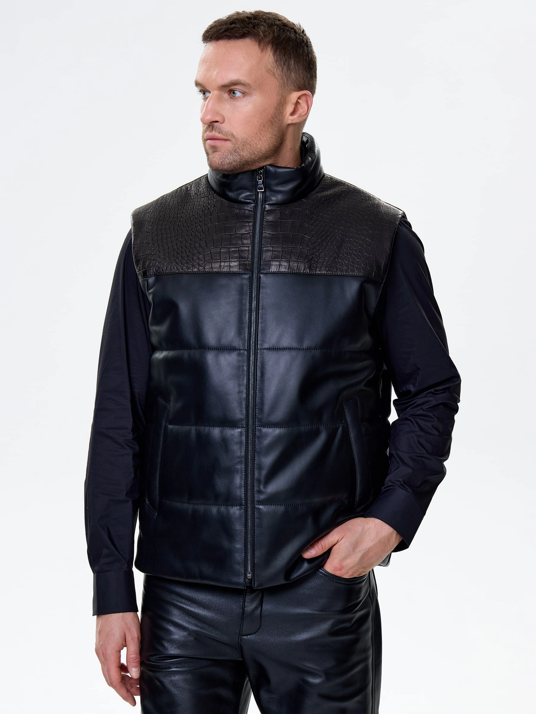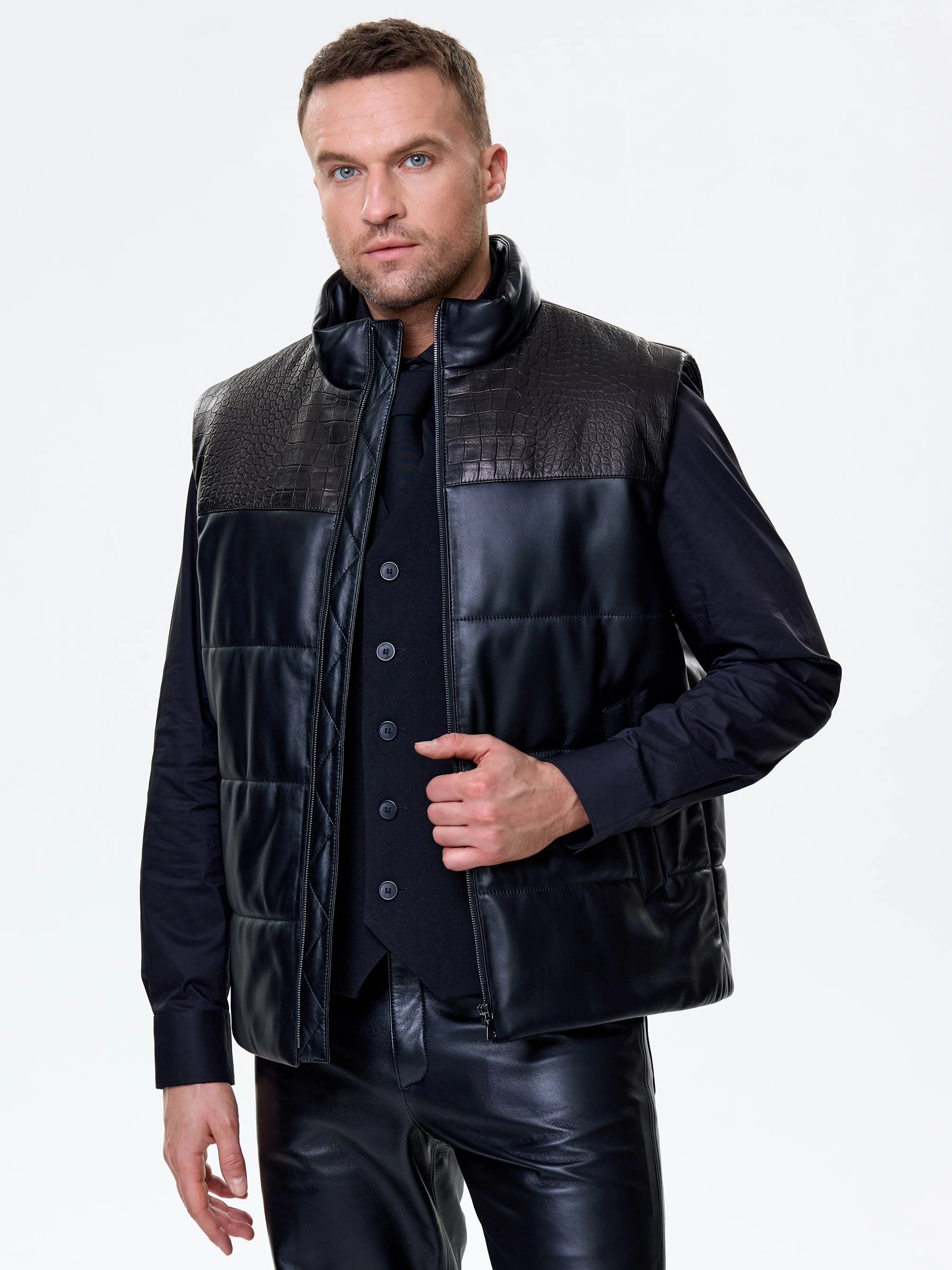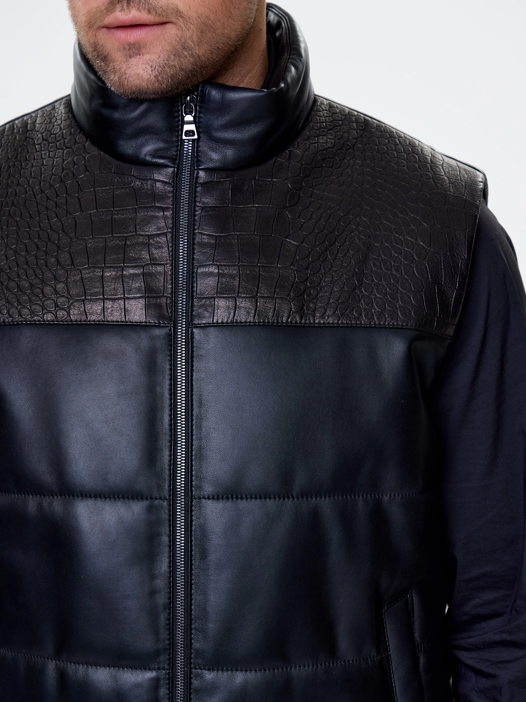 Кожаный комбинированный мужской жилет премиум класса 02, черный, размер 48, артикул 41160