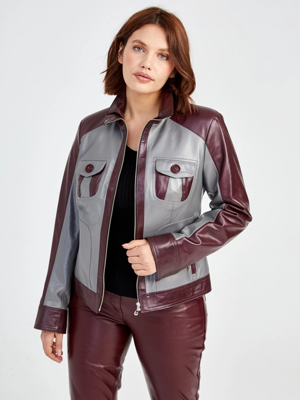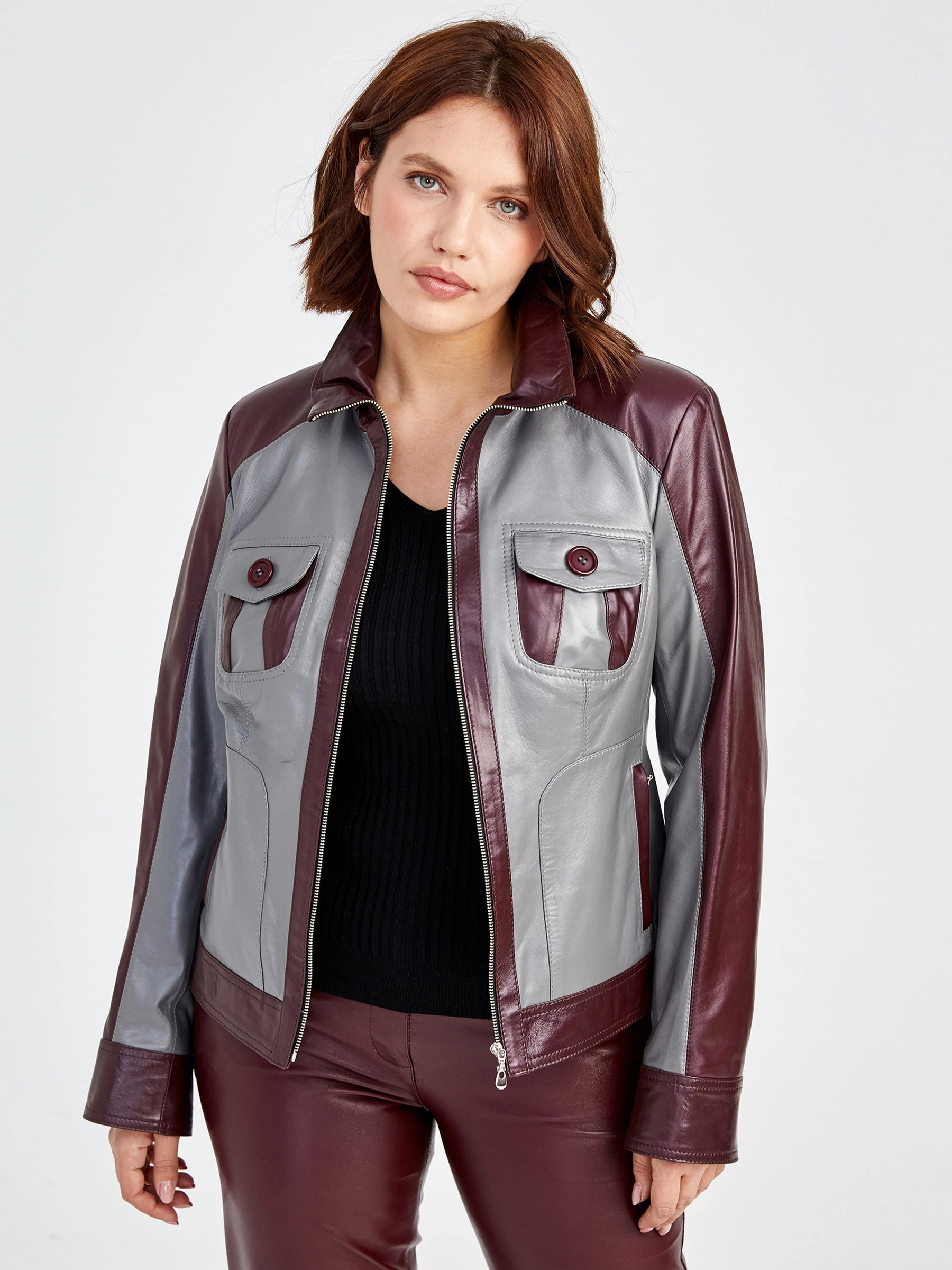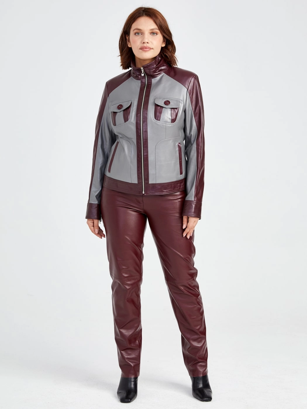 Кожаный комплект женский: Куртка 341 + Брюки 02, серый/бордовый, р. 42, арт. 111170
