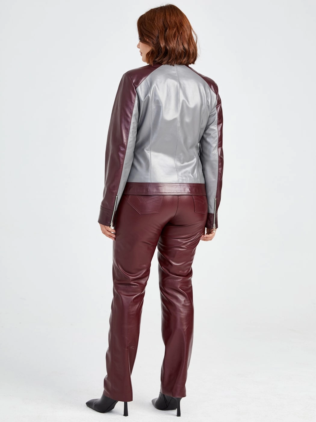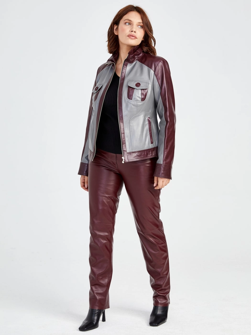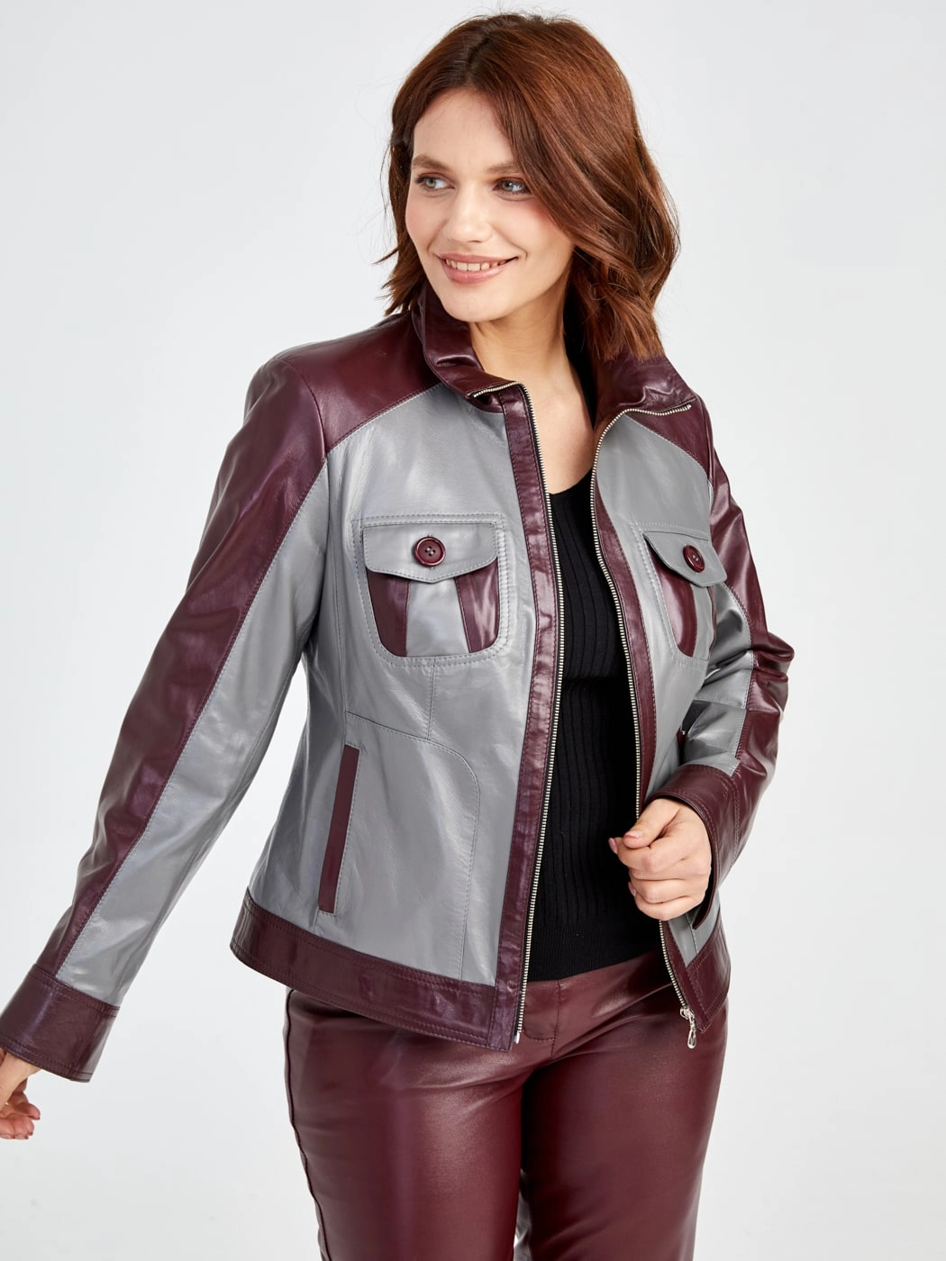 Кожаный комплект женский: Куртка 341 + Брюки 02, серый/бордовый, р. 42, арт. 111170