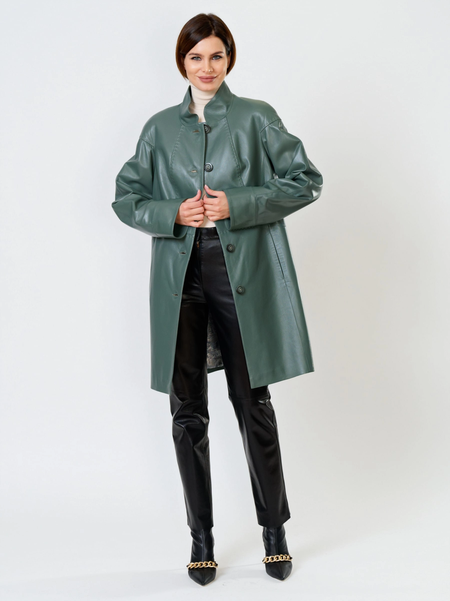 Кожаное пальто с воротником-стойкой в благородном цвете олива и кожаные брюки черного цвета. Отличный комплект для весны и осени. Пальто украшено настоящим ручным стежком. Премиальное качество материалов. Возможно индивидуальное исполнение в любых базовых размерах, в любом цвете.