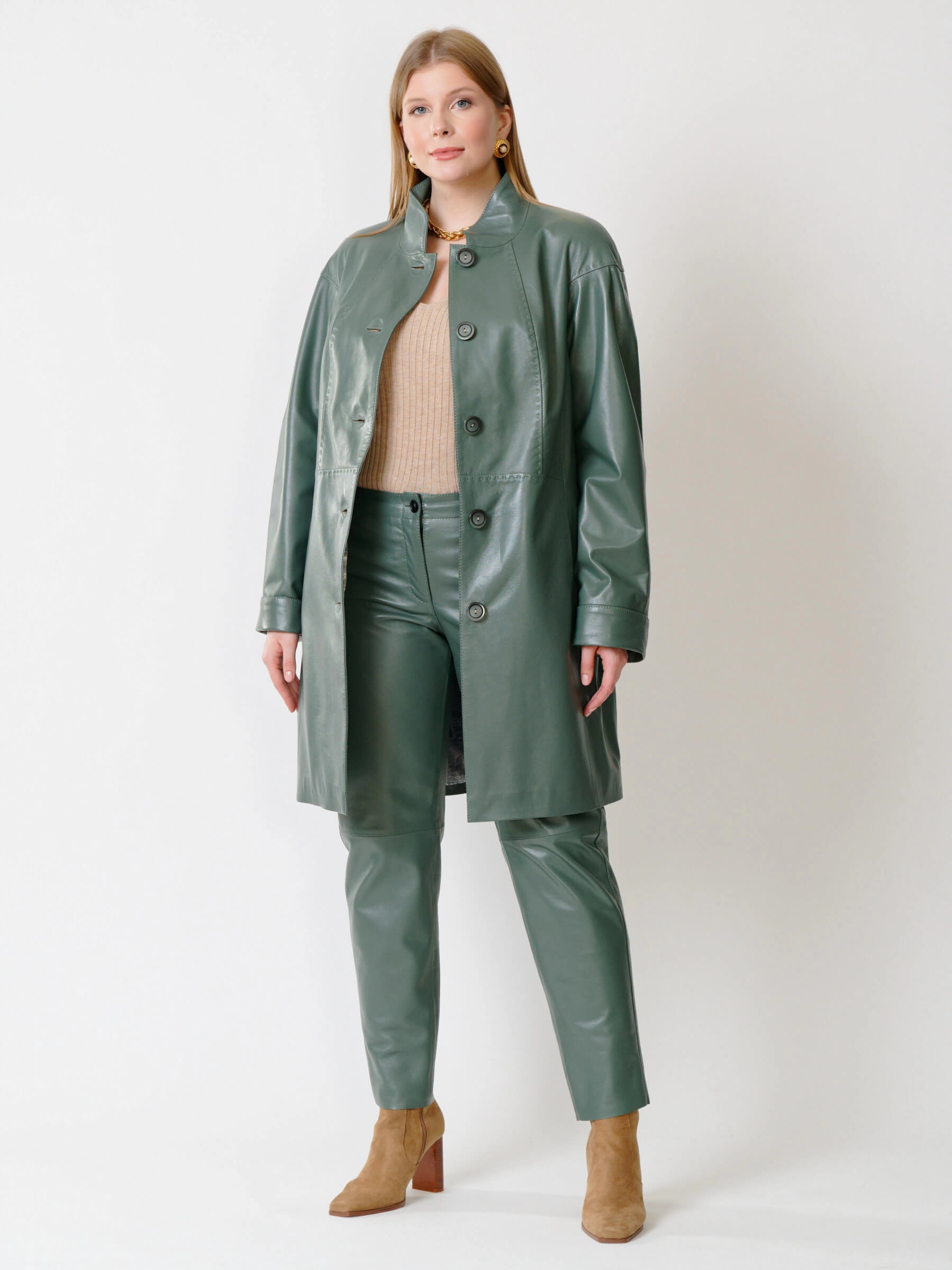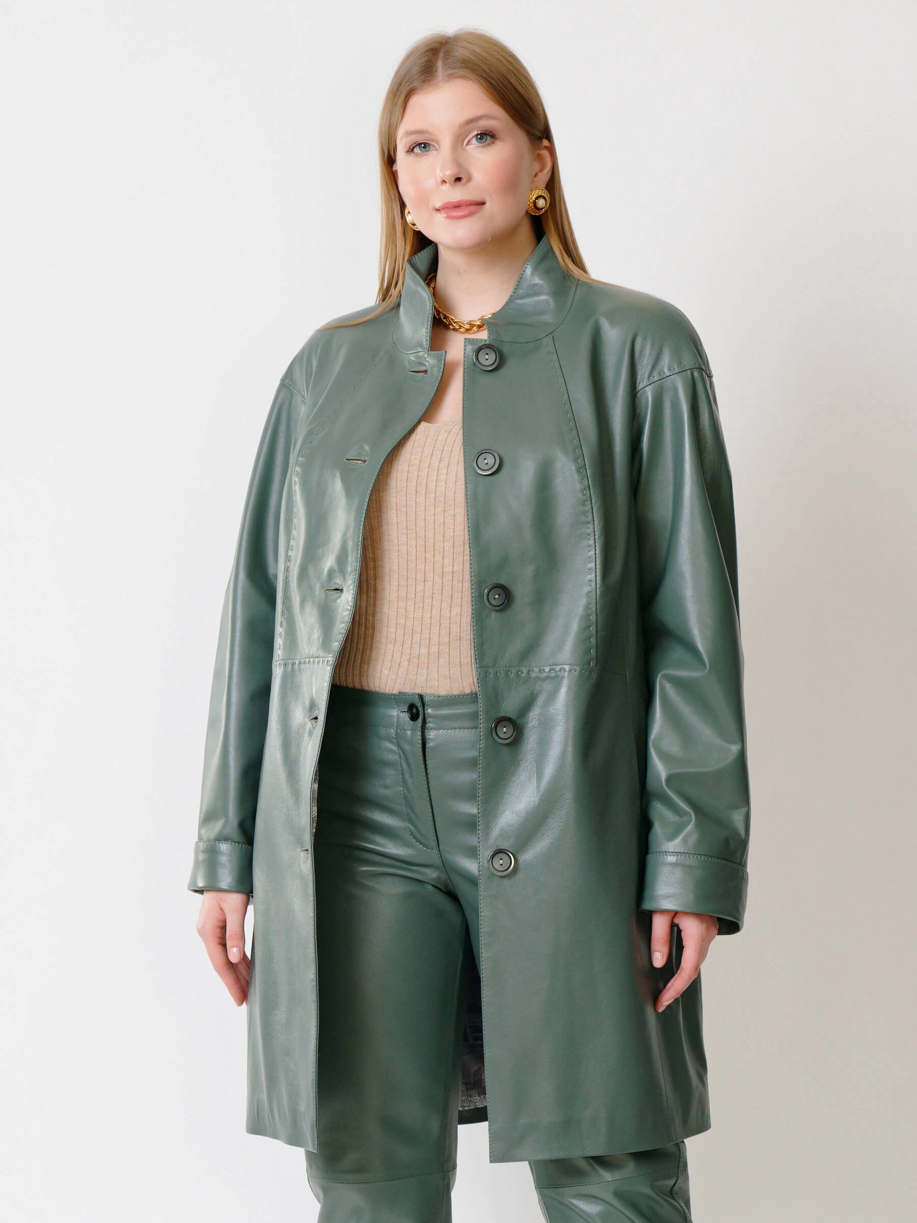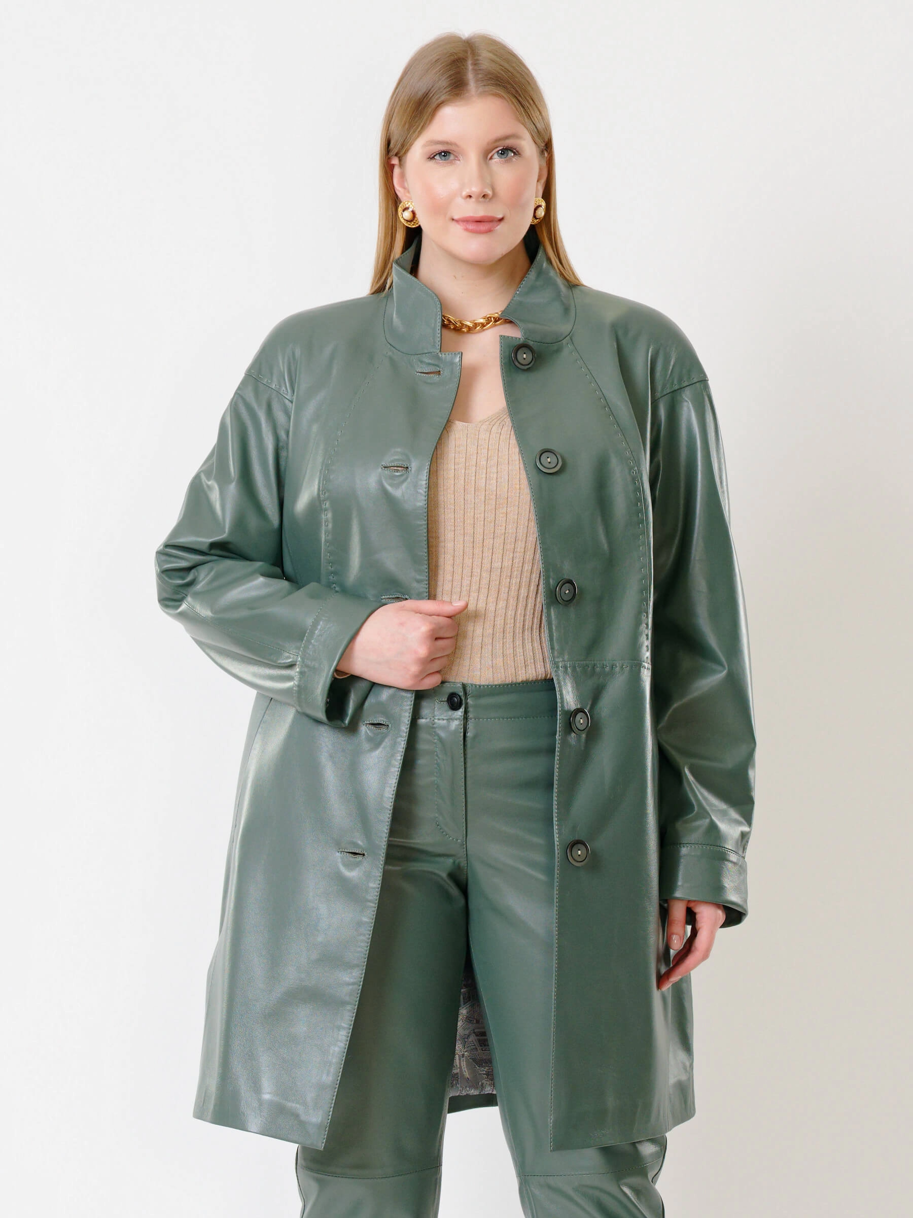 Кожаное пальто с воротником-стойкой в благородном цвете олива и кожаные брюки черного цвета. Отличный комплект для весны и осени. Пальто украшено настоящим ручным стежком. Премиальное качество материалов. Возможно индивидуальное исполнение в любых базовых размерах, в любом цвете.