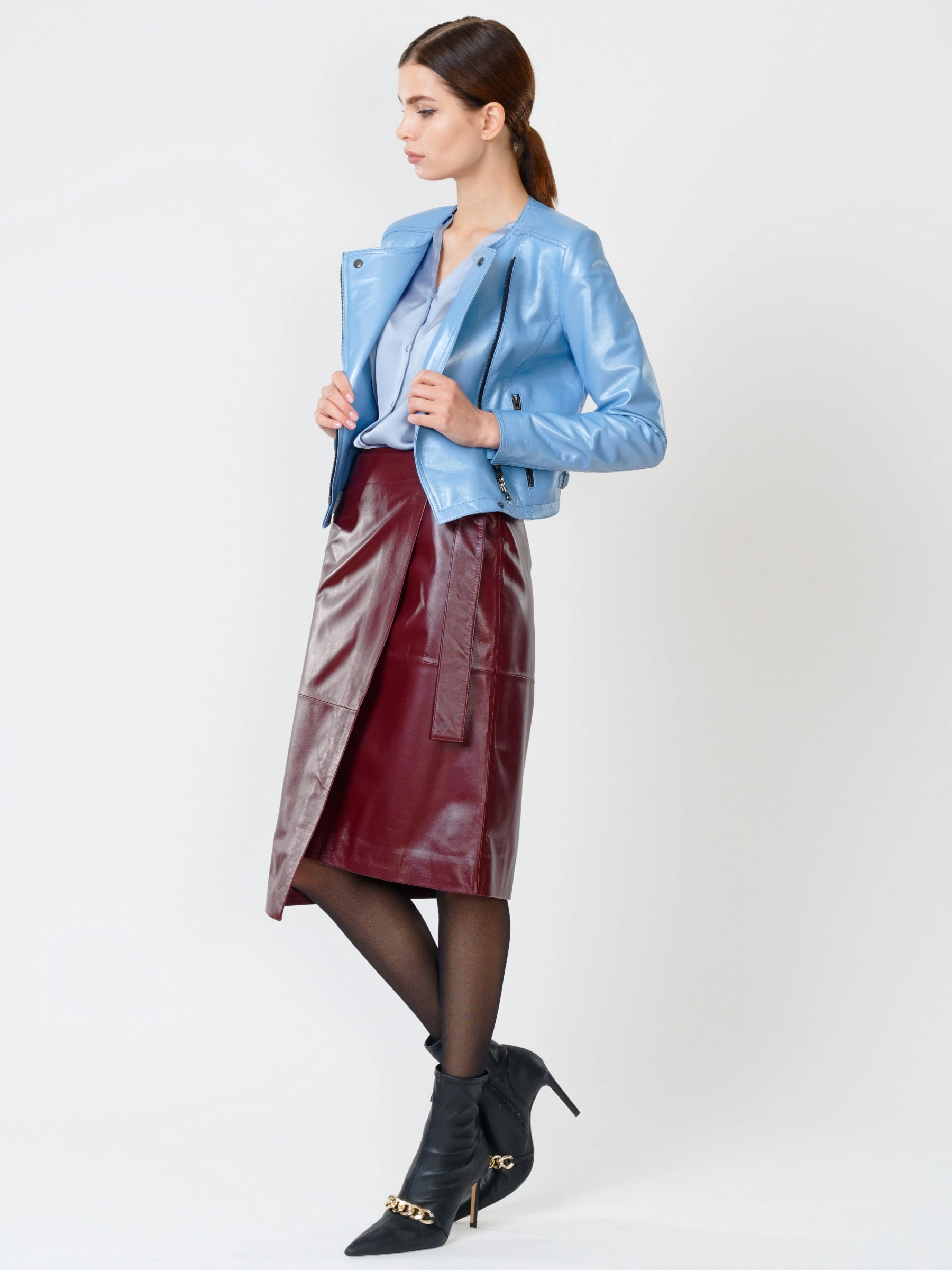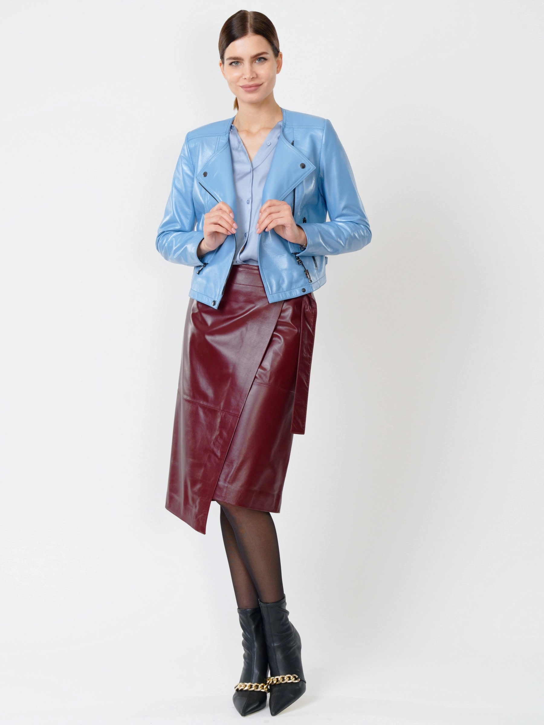 Товар кожаный комплект женский: куртка 389 + юбка-миди 07, голубой/бордовый, р. 42, арт. 111112. Рассчитан на сезон: весна-лето.
