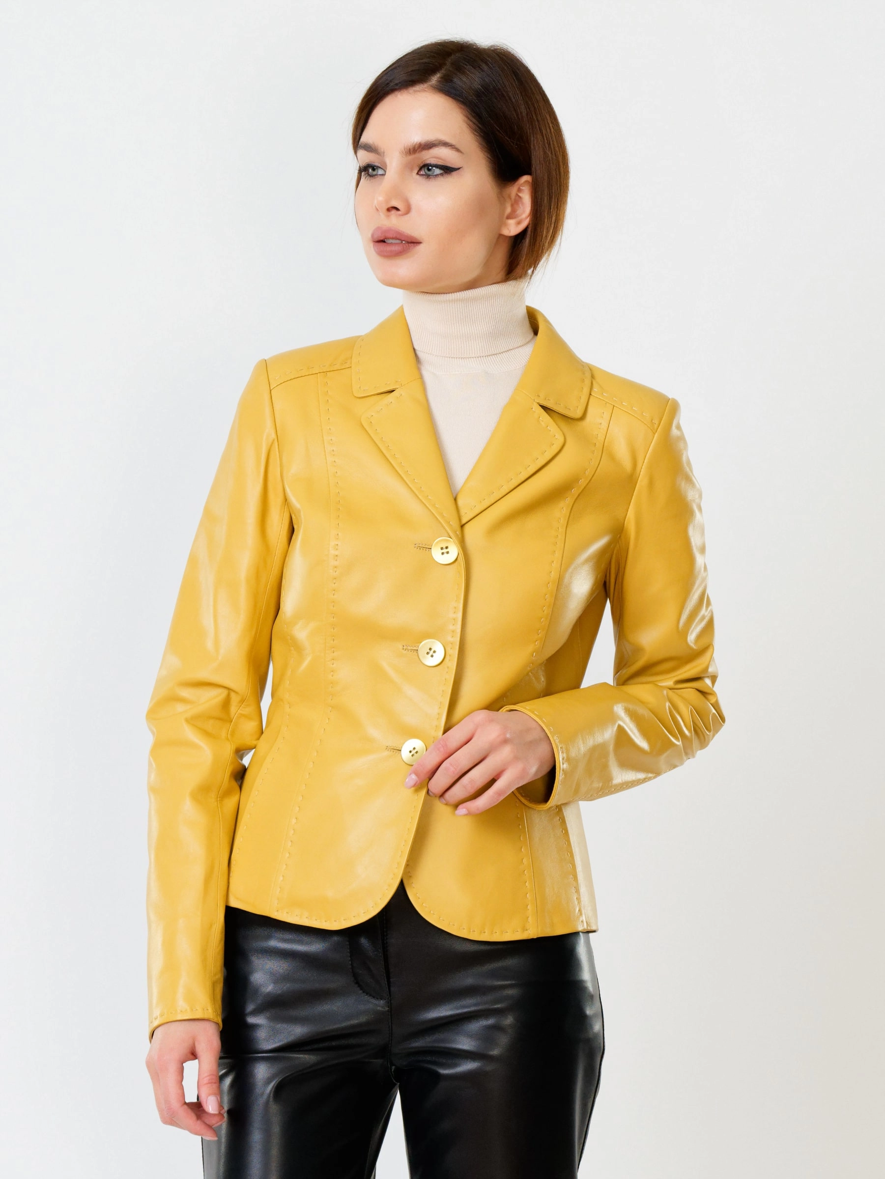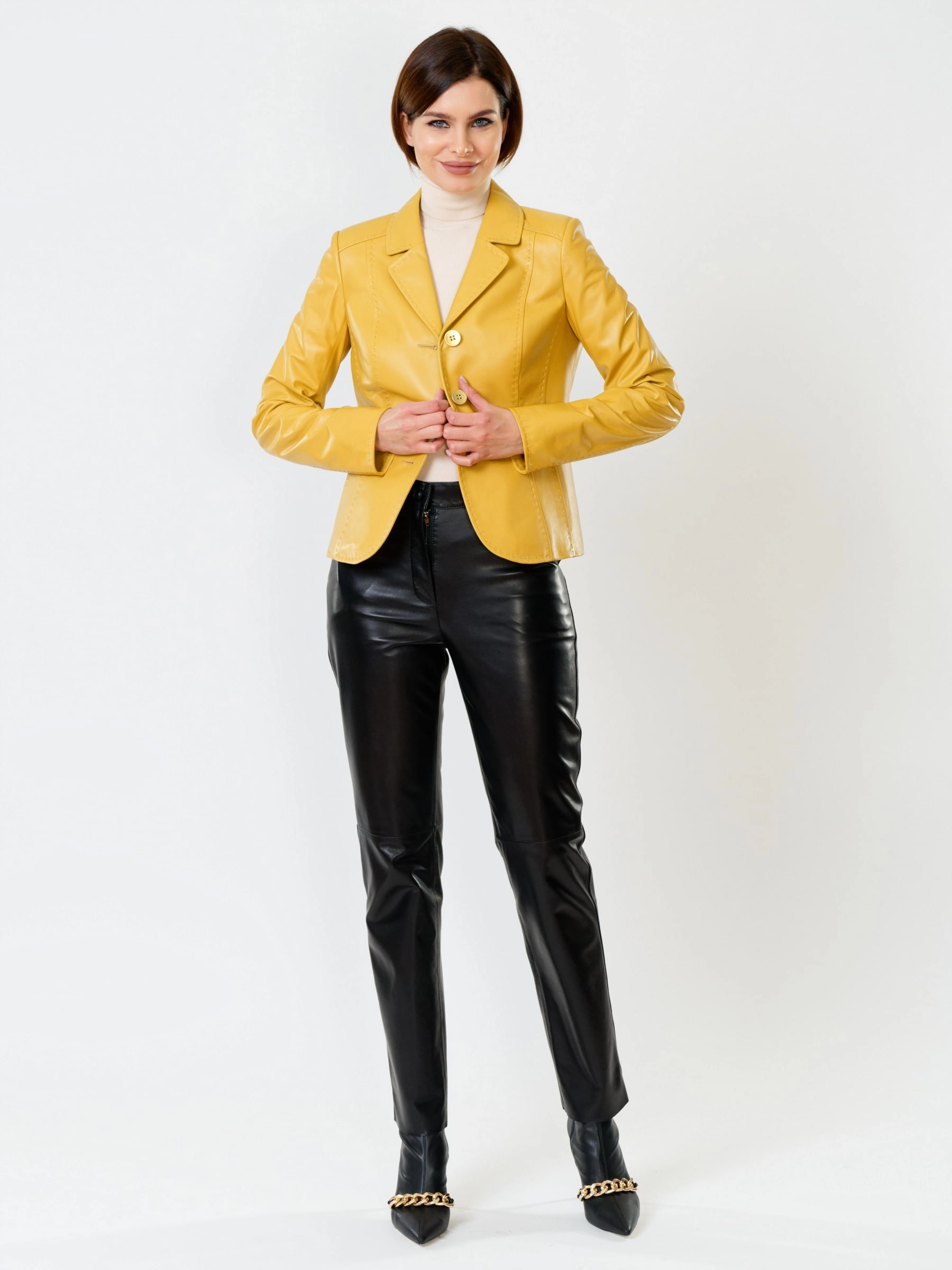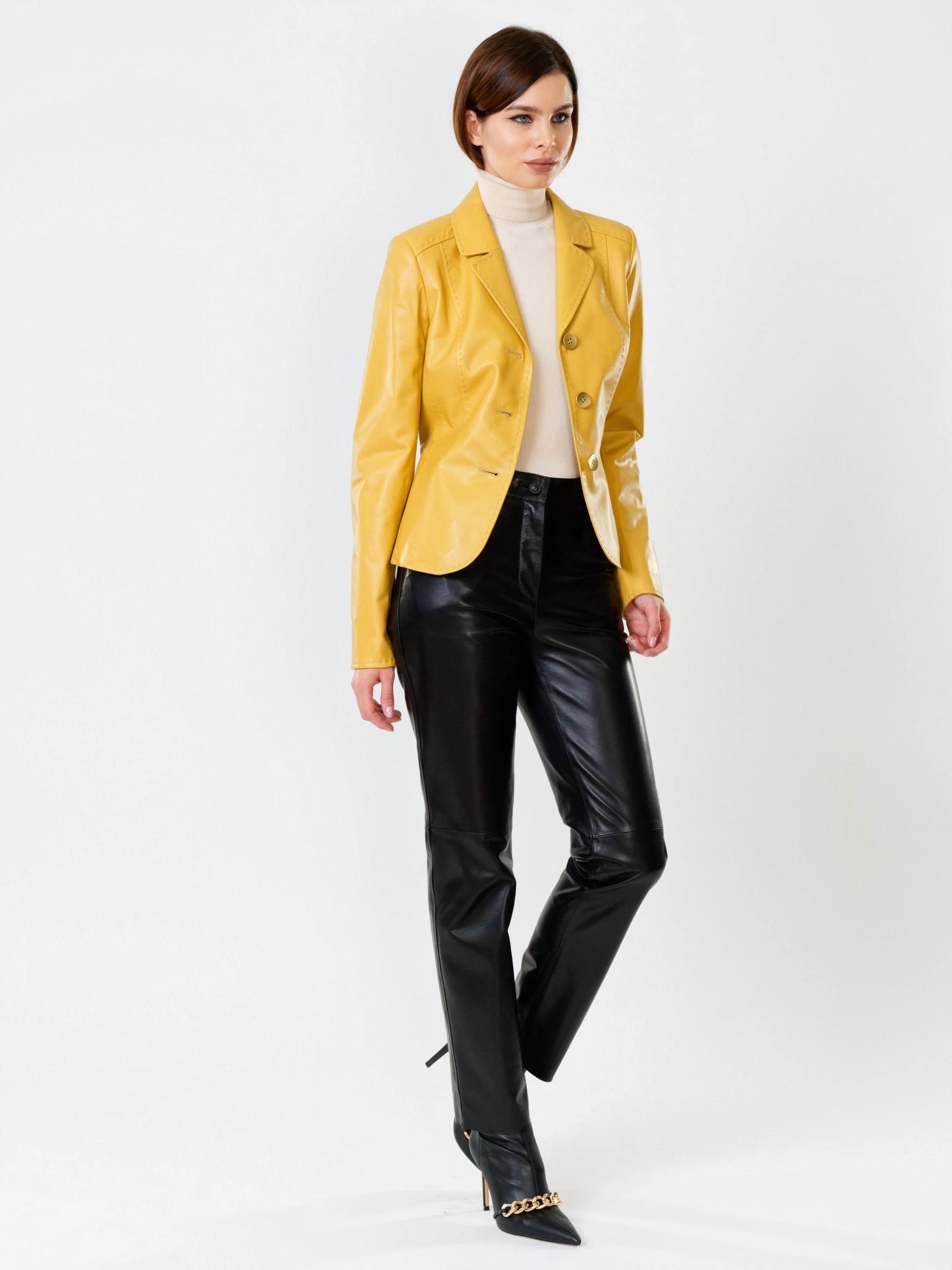 Товар кожаный костюм женский: пиджак 316рс + брюки 03, желтый/черный, р. 44, арт. 111152. Рассчитан на сезон: весна-лето.