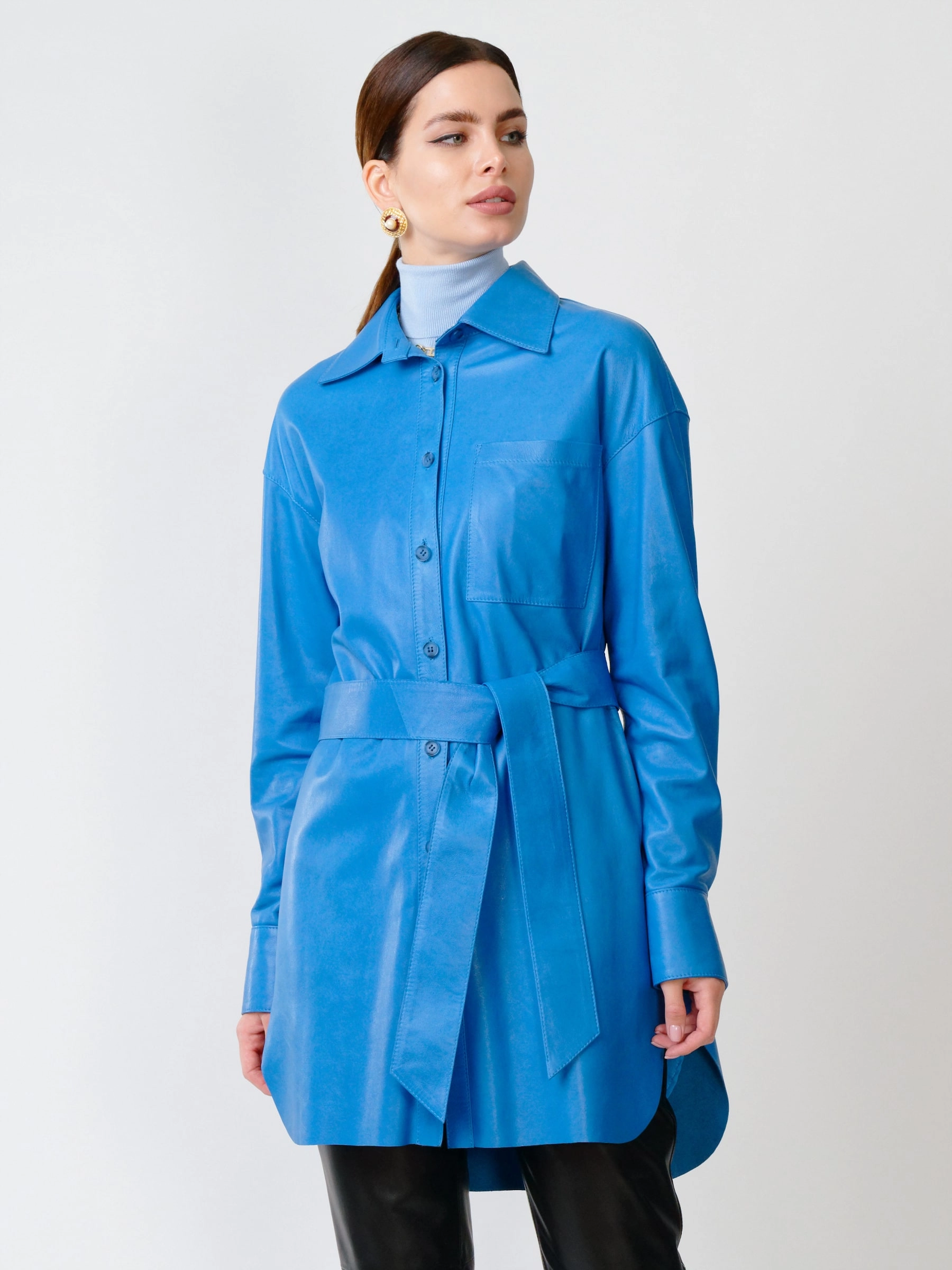 Товар кожаный костюм женский: рубашка 01_1 + брюки 02, голубой/черный, р. 46, арт. 111130. Рассчитан на сезон: весна-лето.