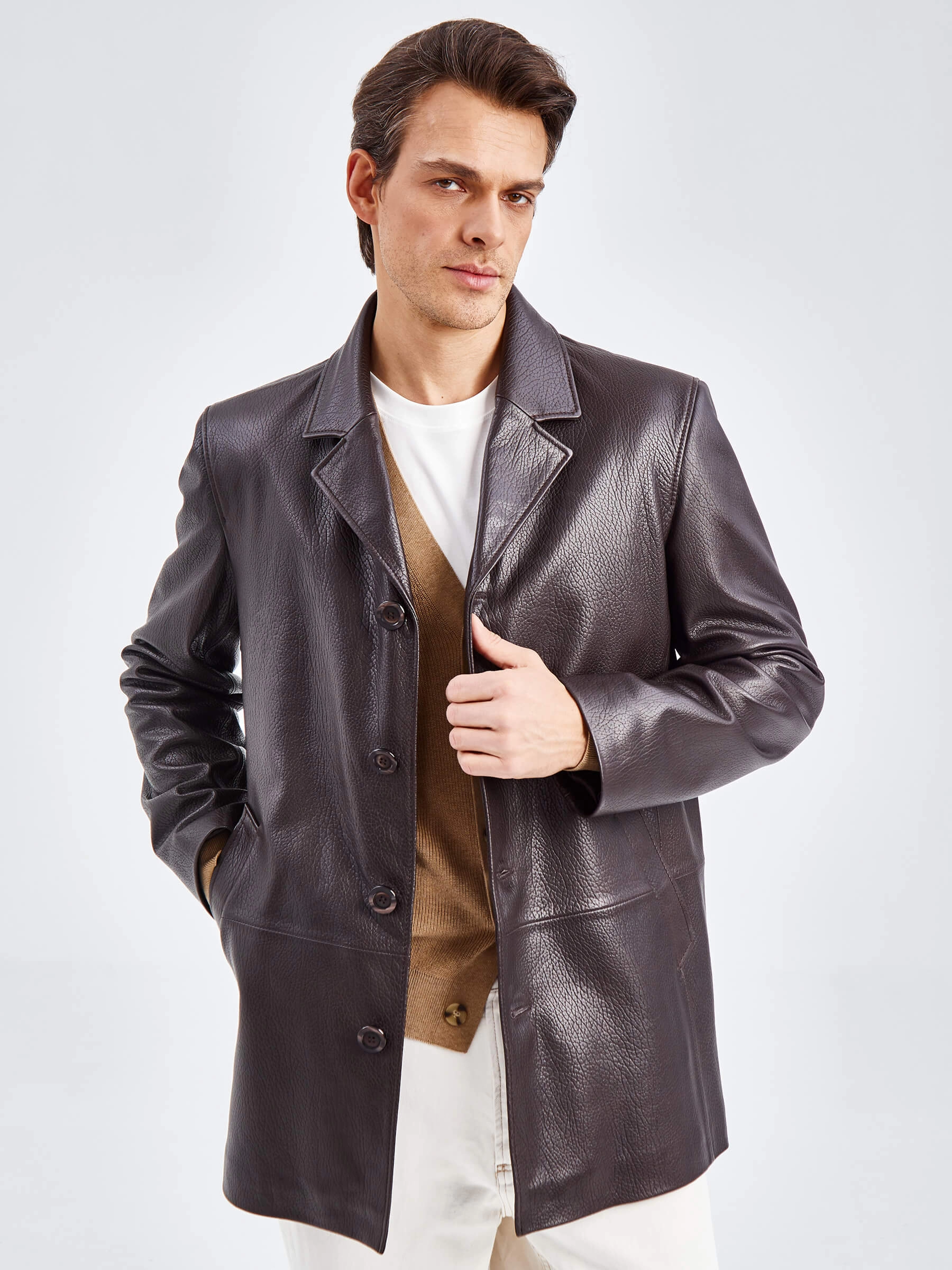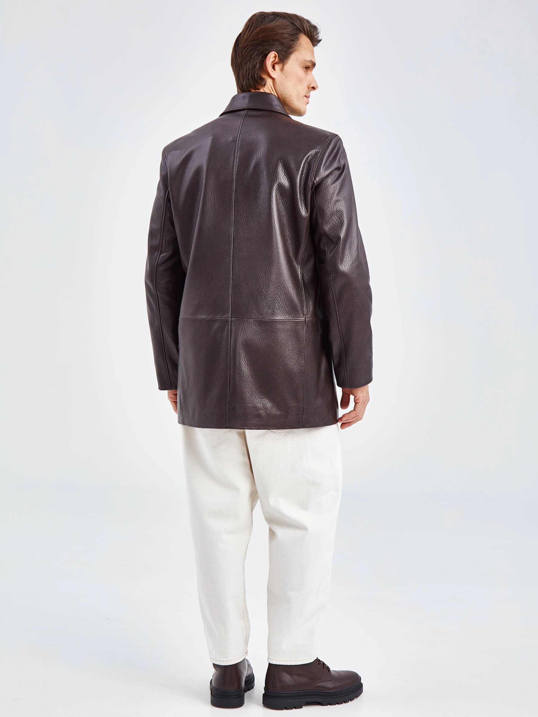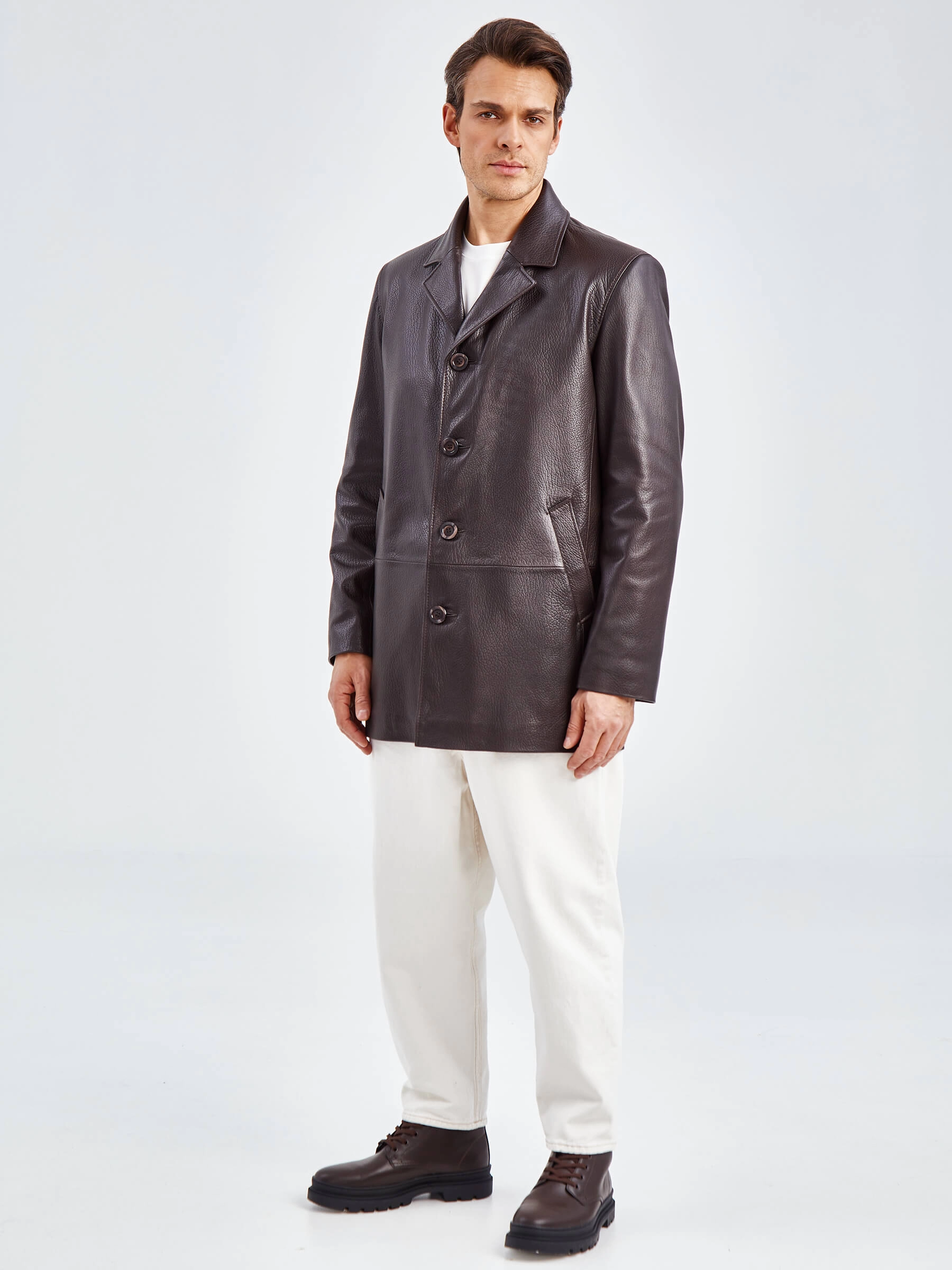 Мужской пиджак в современном исполнении. Черная кожа особой выделки. Прекрасное сочетание как с джинсами, так и с классическим костюмом. Модель комфортно садится по фигуре поверх пиджака. Прямой силуэт. Английский воротник. Рукав втачной двухшовный. Ширина рукавов и специальное построение плечевого пояса, обеспечивают комфортную посадку на любой тип фигур. Широкий усиленный подборт предотвращает деформацию. Эргономичные усиленные листочки наружных карманов. Предусмотрены внутренние застёгивающиеся карманы для документов. Особая обработка петель под пуговицы предотвращает их изнашивание.