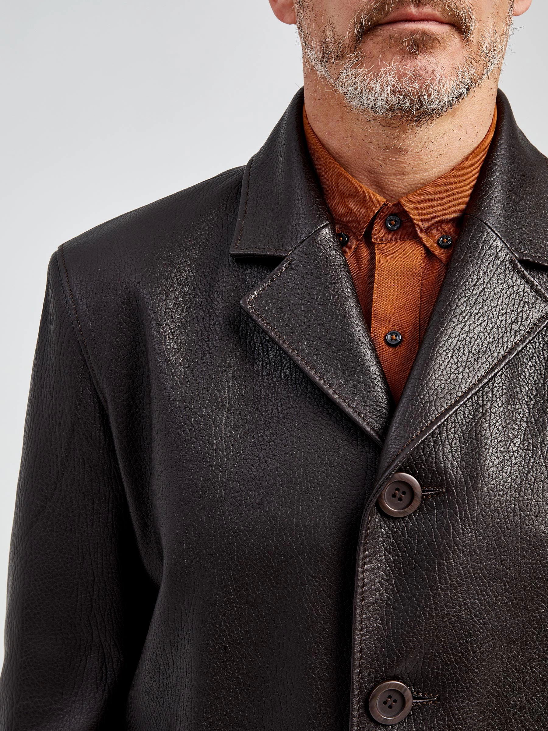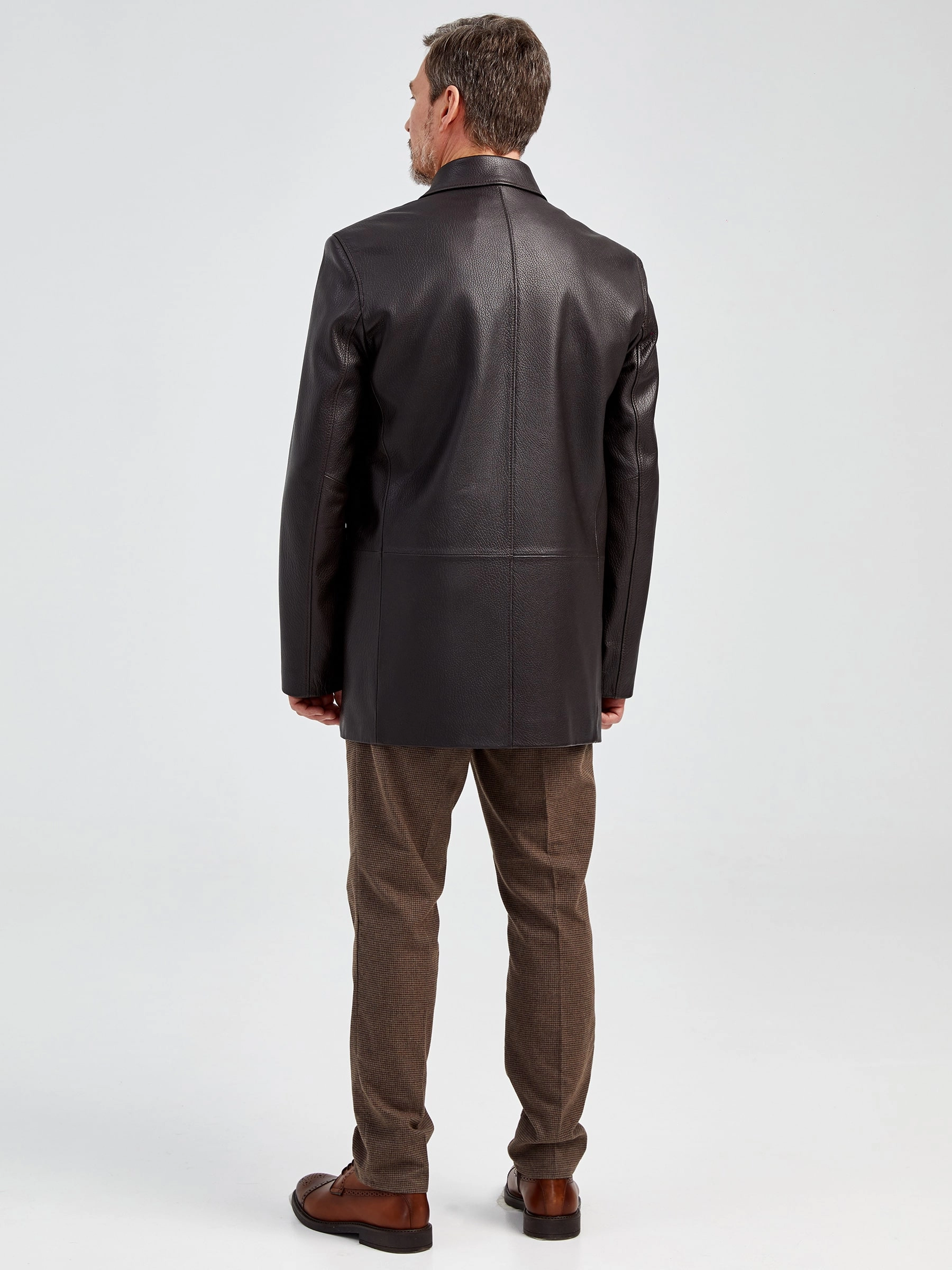 Мужской пиджак в современном исполнении. Черная кожа особой выделки. Прекрасное сочетание как с джинсами, так и с классическим костюмом. Модель комфортно садится по фигуре поверх пиджака. Прямой силуэт. Английский воротник. Рукав втачной двухшовный. Ширина рукавов и специальное построение плечевого пояса, обеспечивают комфортную посадку на любой тип фигур. Широкий усиленный подборт предотвращает деформацию. Эргономичные усиленные листочки наружных карманов. Предусмотрены внутренние застёгивающиеся карманы для документов. Особая обработка петель под пуговицы предотвращает их изнашивание.