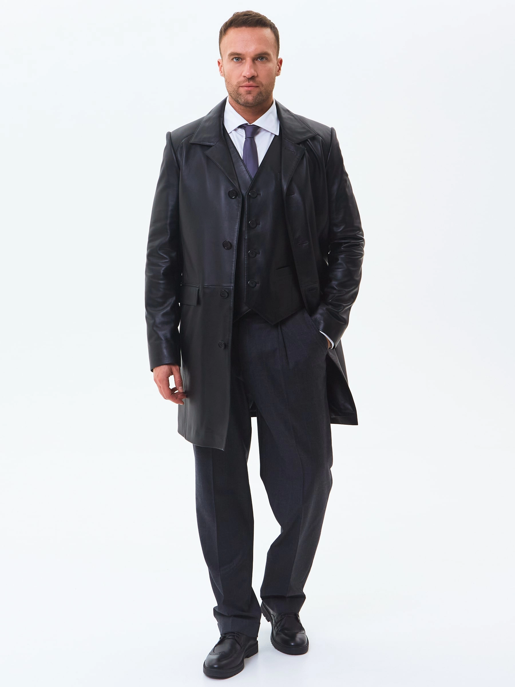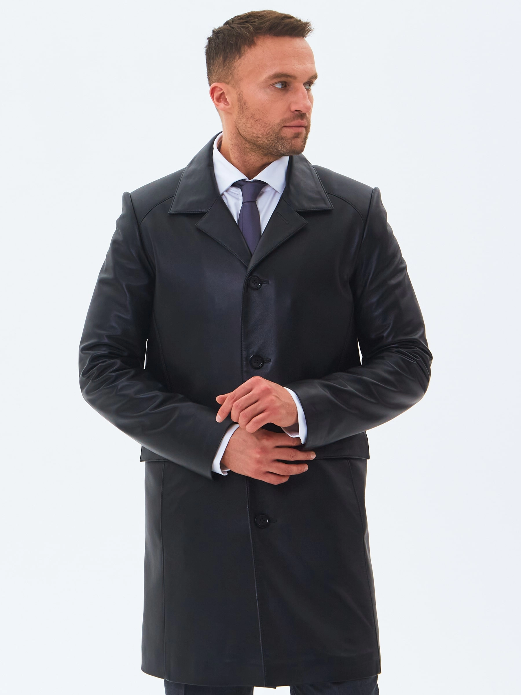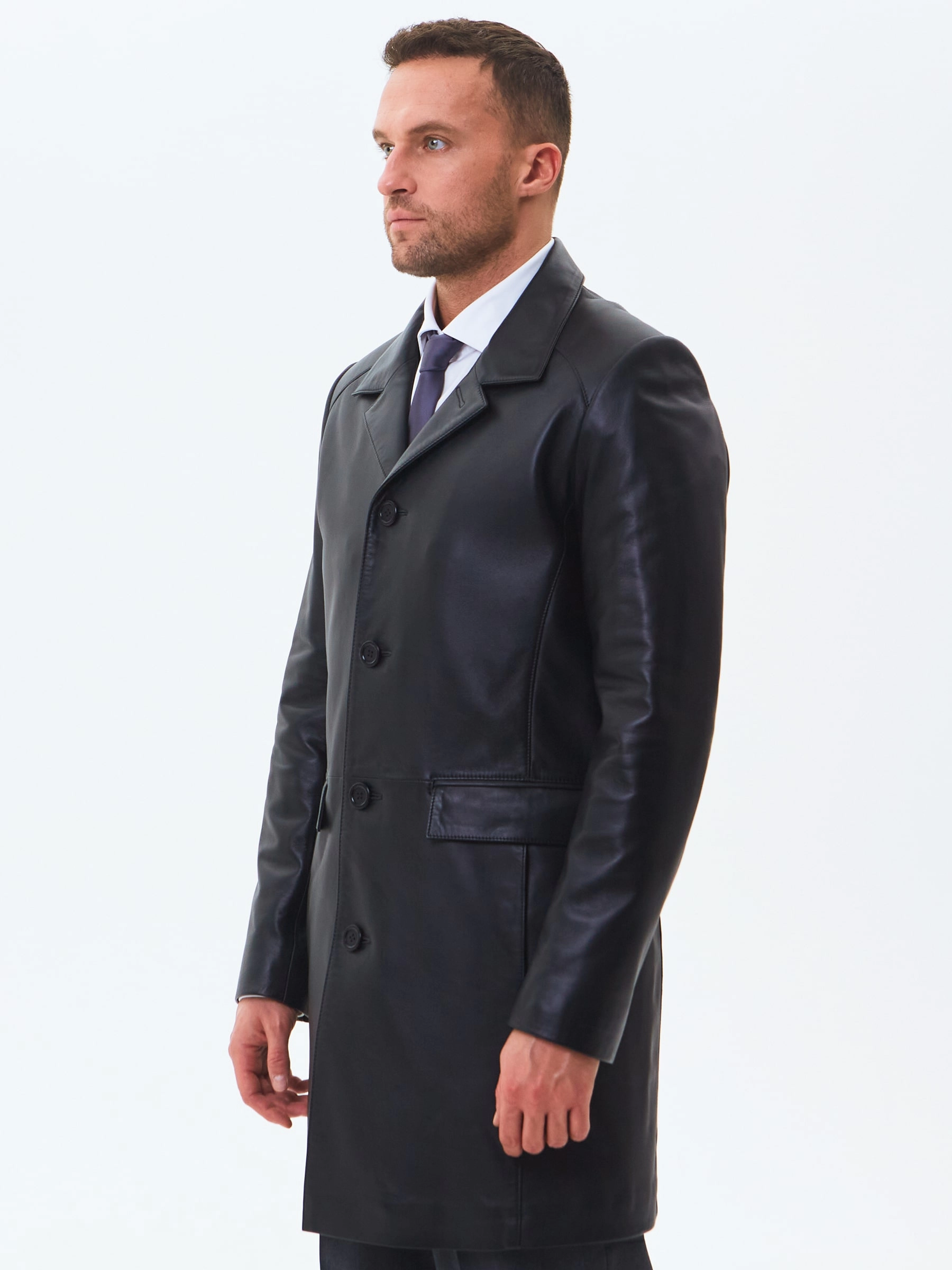 Товар удлиненный кожаный мужской пиджак премиум класса 539, черный, размер 48, артикул 29551 выполнен из натуральной кожи с застежкой пуговицы. Рассчитан на сезон: демисезон. Длина изделия 95 см, силуэт полуприлегающий.