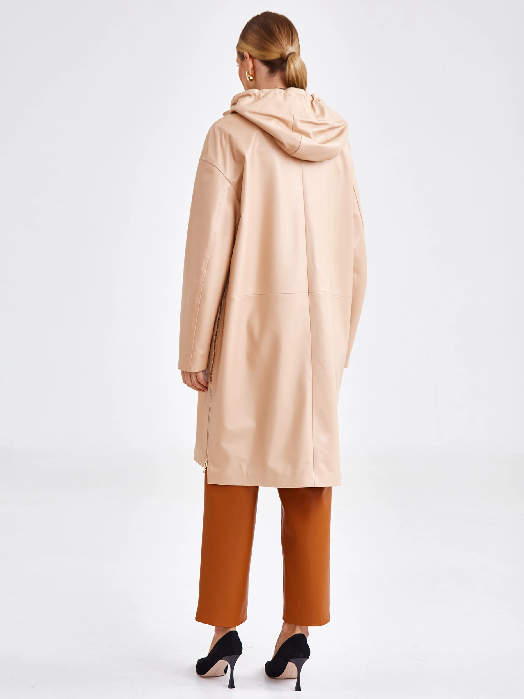 Плащ прямого кроя выполнили из мягкой нутуральной кожи. Модель дополнили двумя накладными карманами и боковыми разрезами на молниях. За дополнительную защиту от ветра отвечает объемный капюшон.