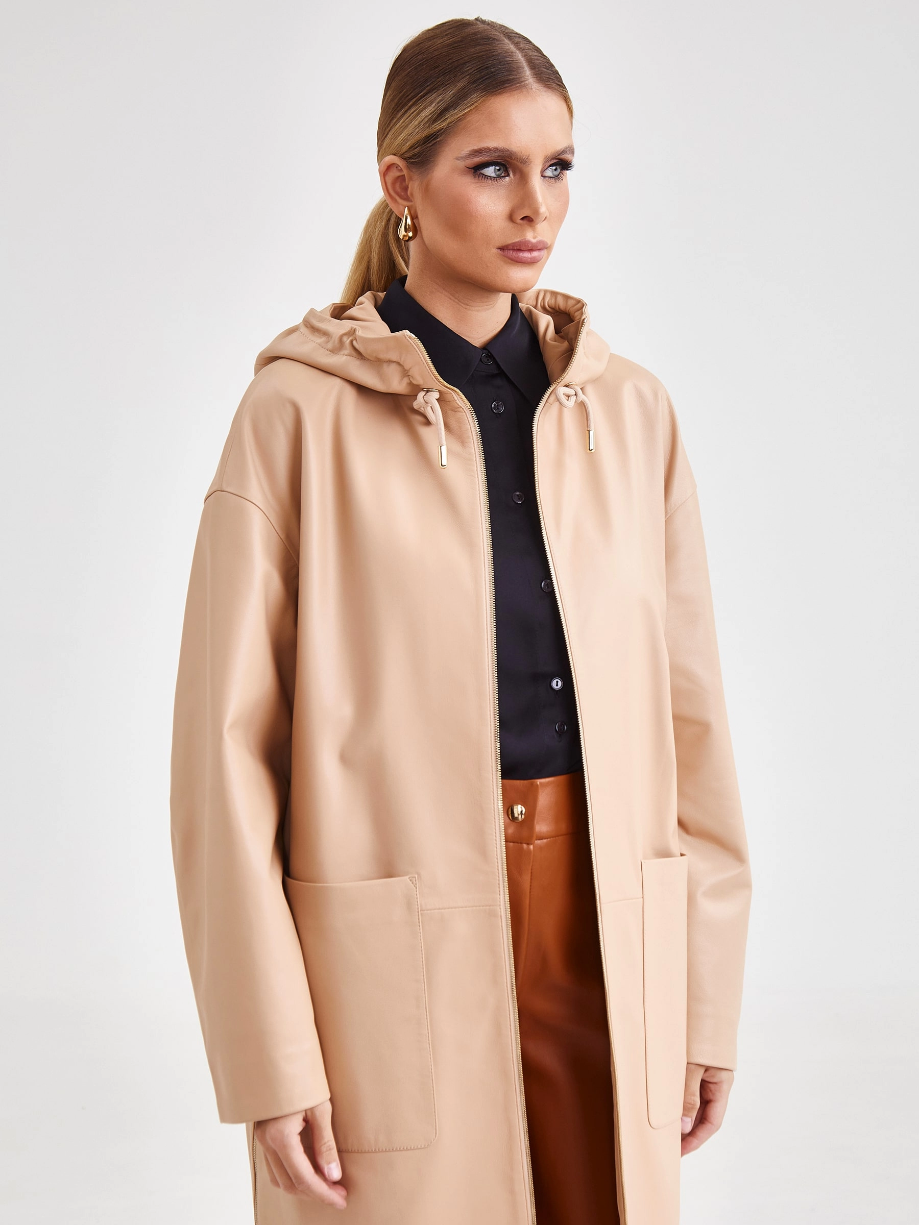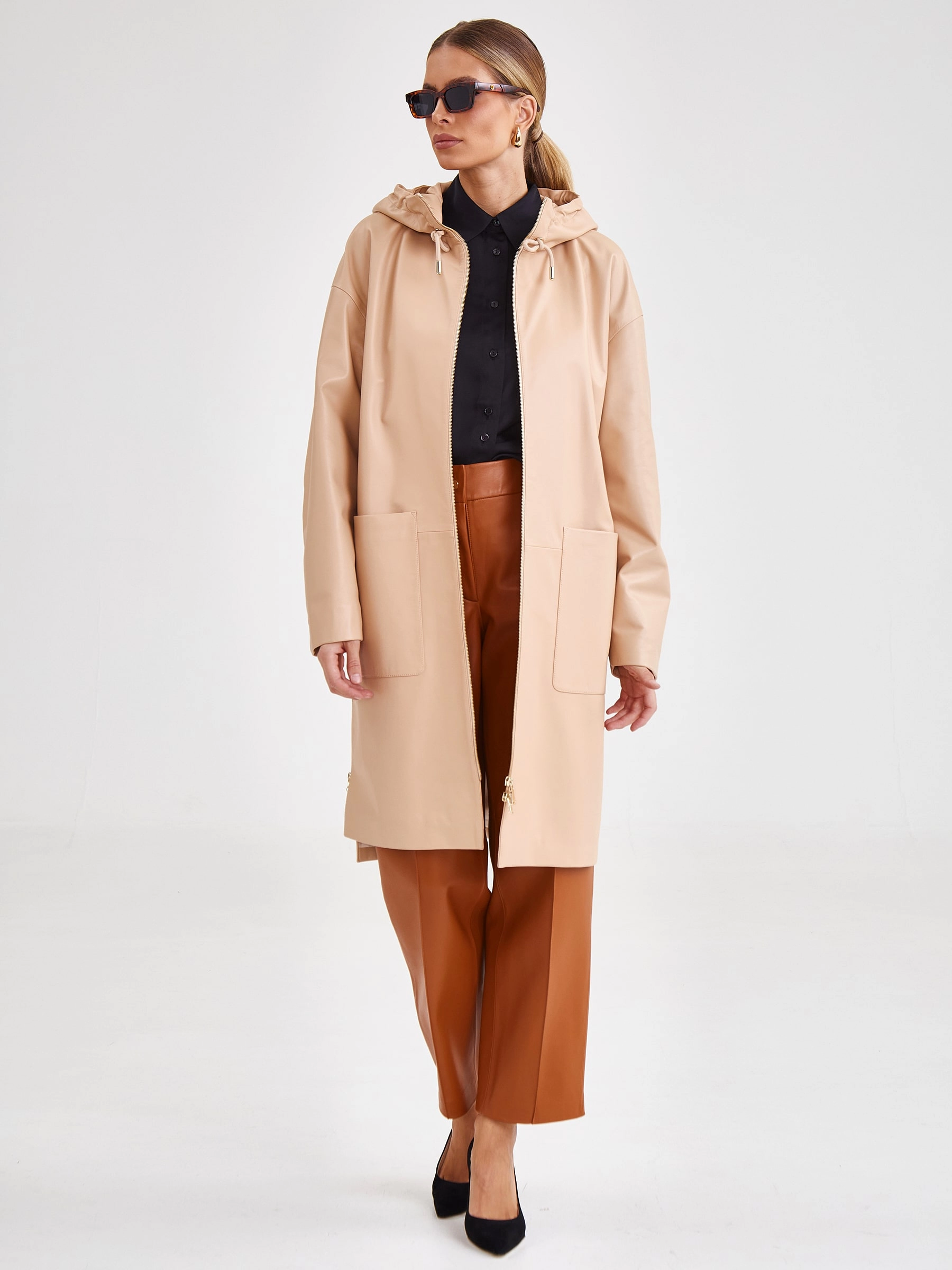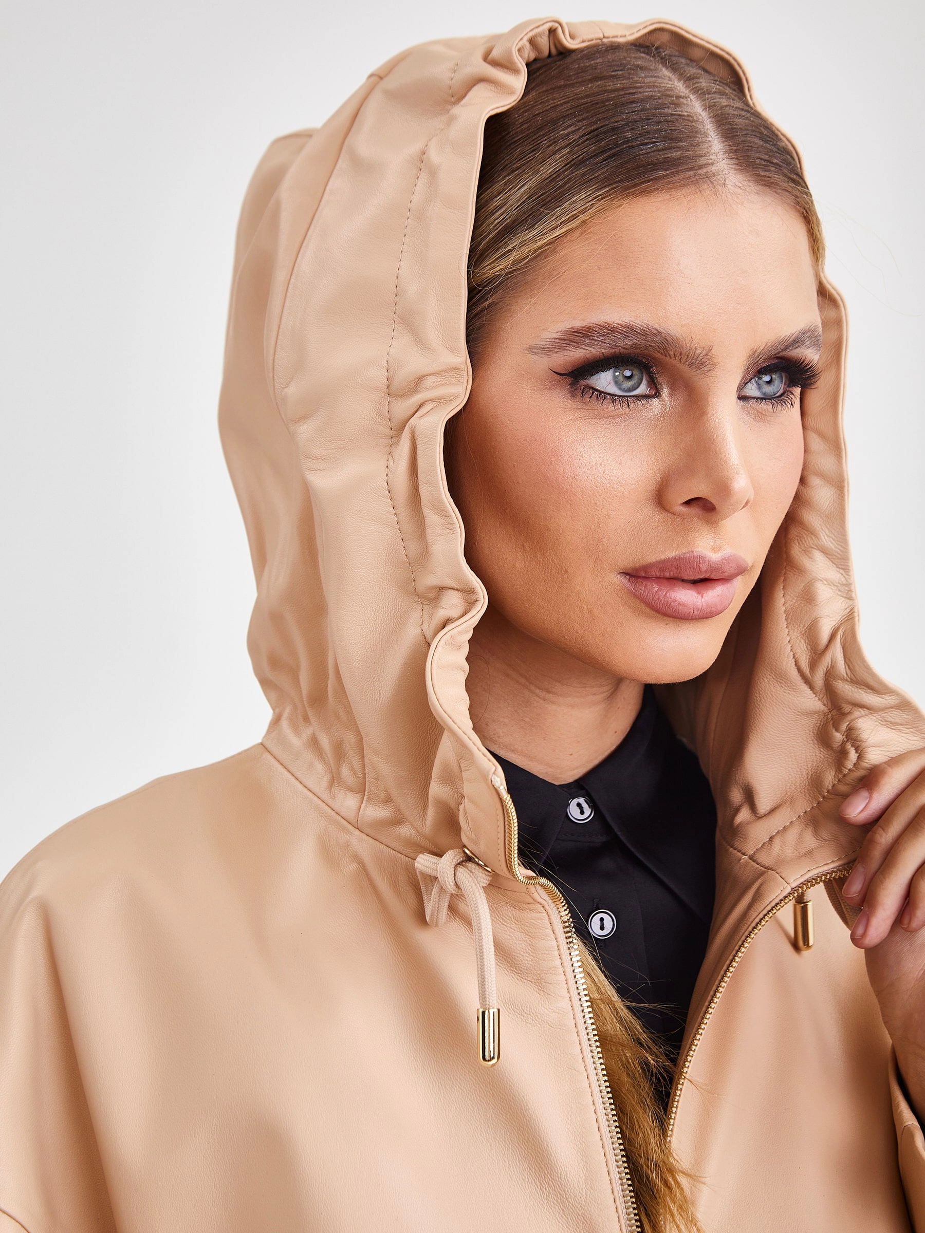 Кожаный женский плащ с капюшоном на молнии премиум класса 3034, бежевый, размер 48, артикул 91941