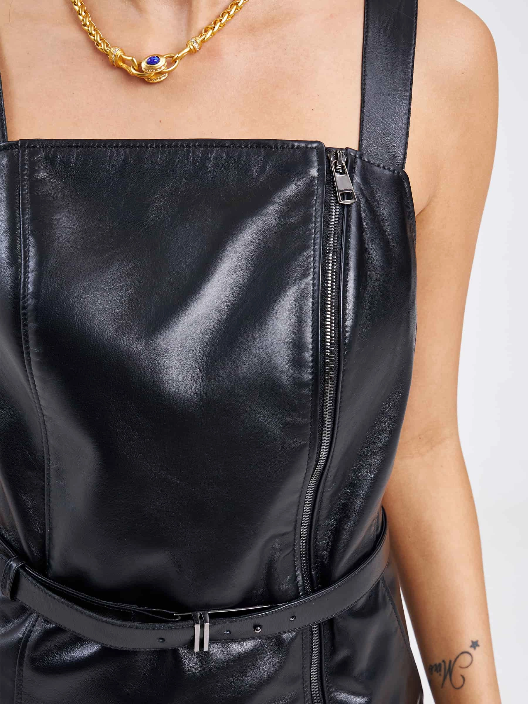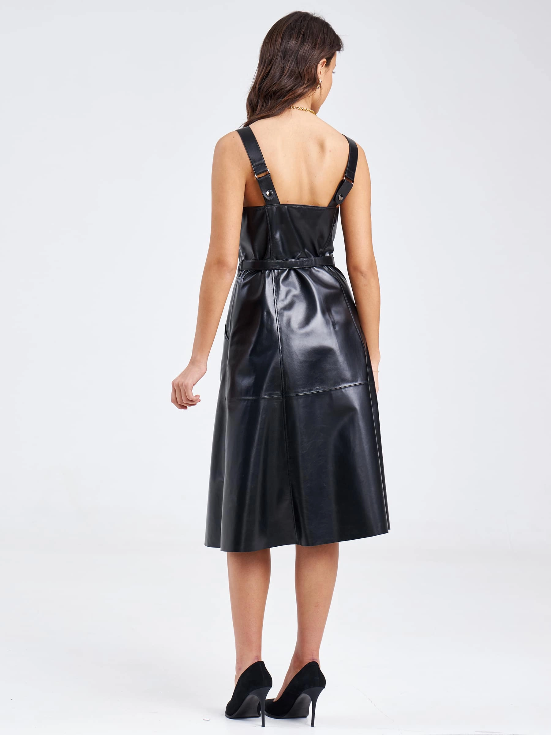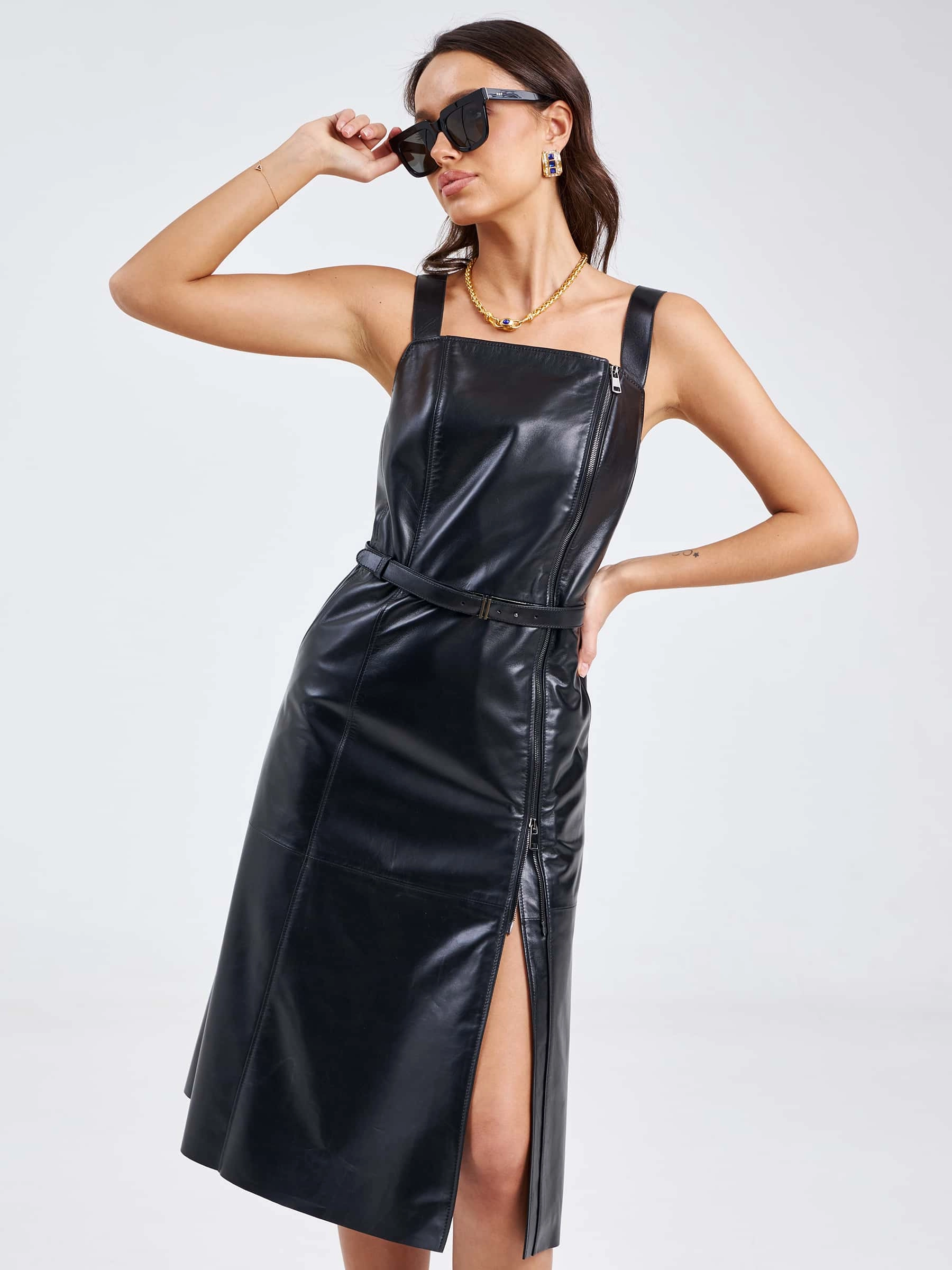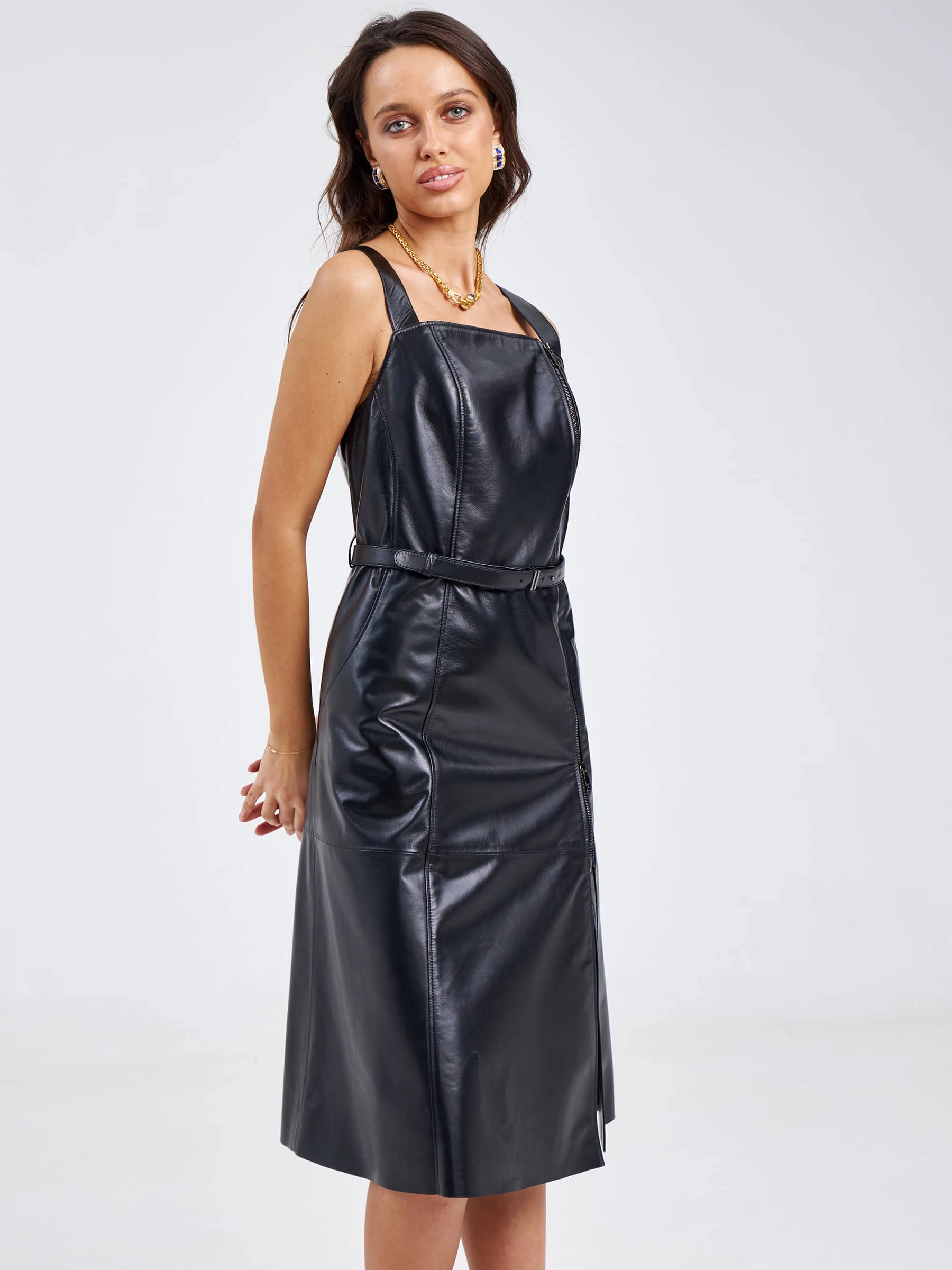 Товар женский сарафан из натуральной кожи 03, черный, размер 50, артикул 85200 выполнен из натуральной кожи с застежкой бретели. Рассчитан на сезон: весна-лето. Длина изделия 86 см, силуэт приталенный .
