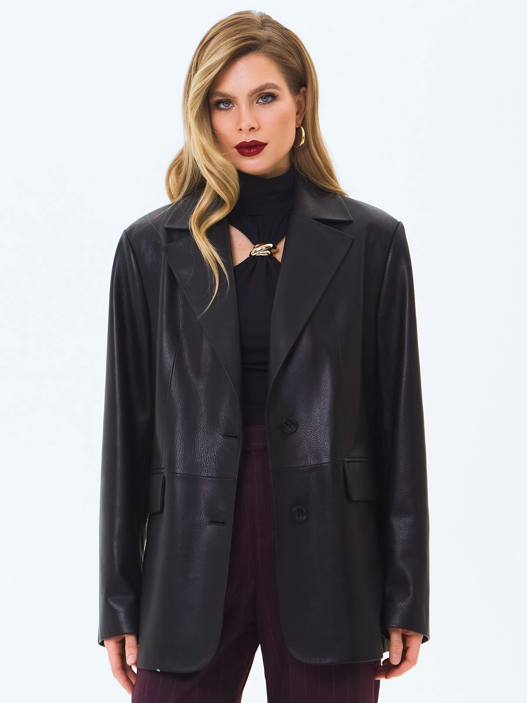 Пиджак с широкими лацканами выполнили из мягкой мелкозернистой кожи премиум класса. Прямой силуэт модели дополнили боковыми карманами с клапанами и шлицей сзади. Изделие застегивается двумя пуговицами.