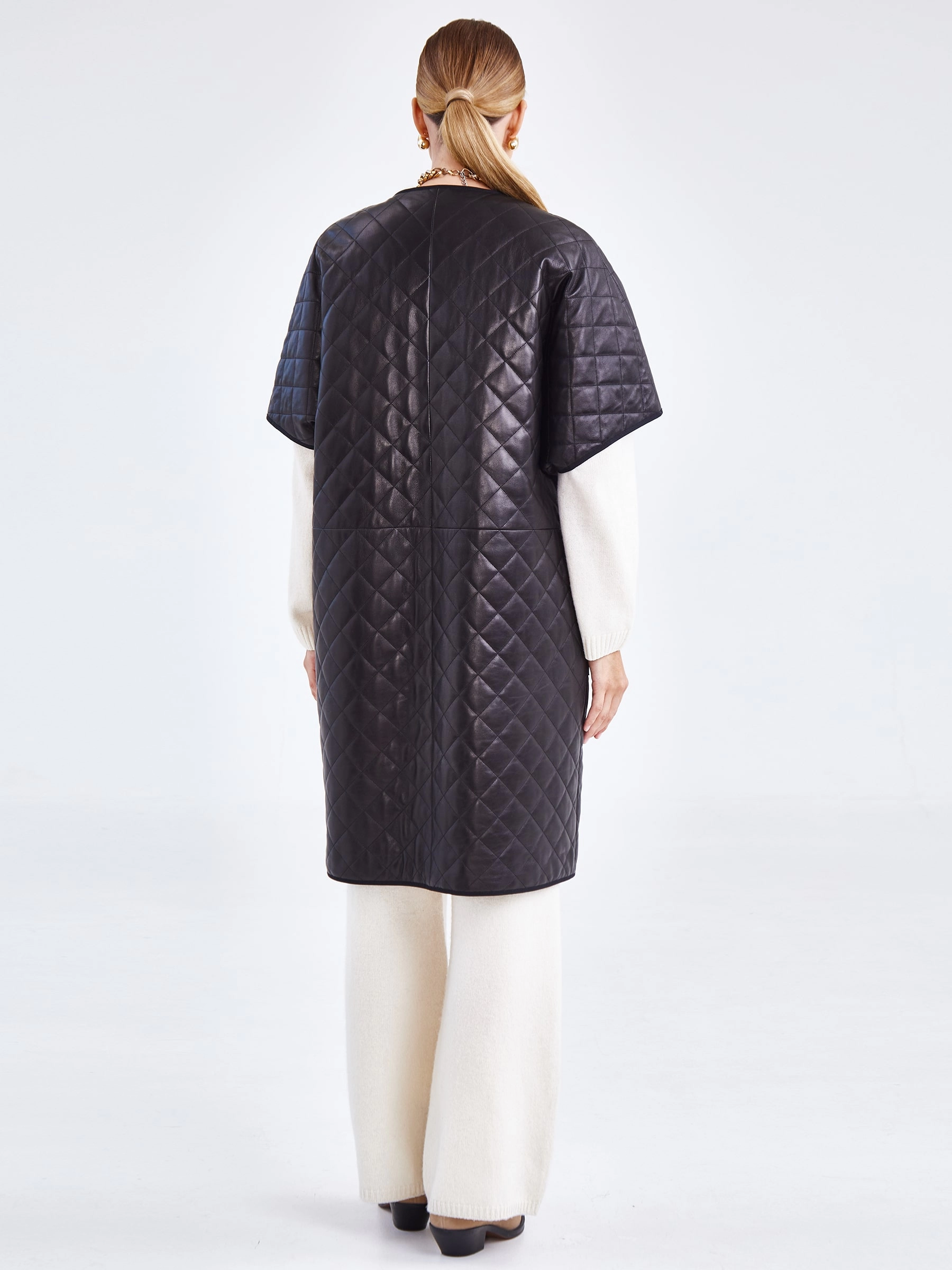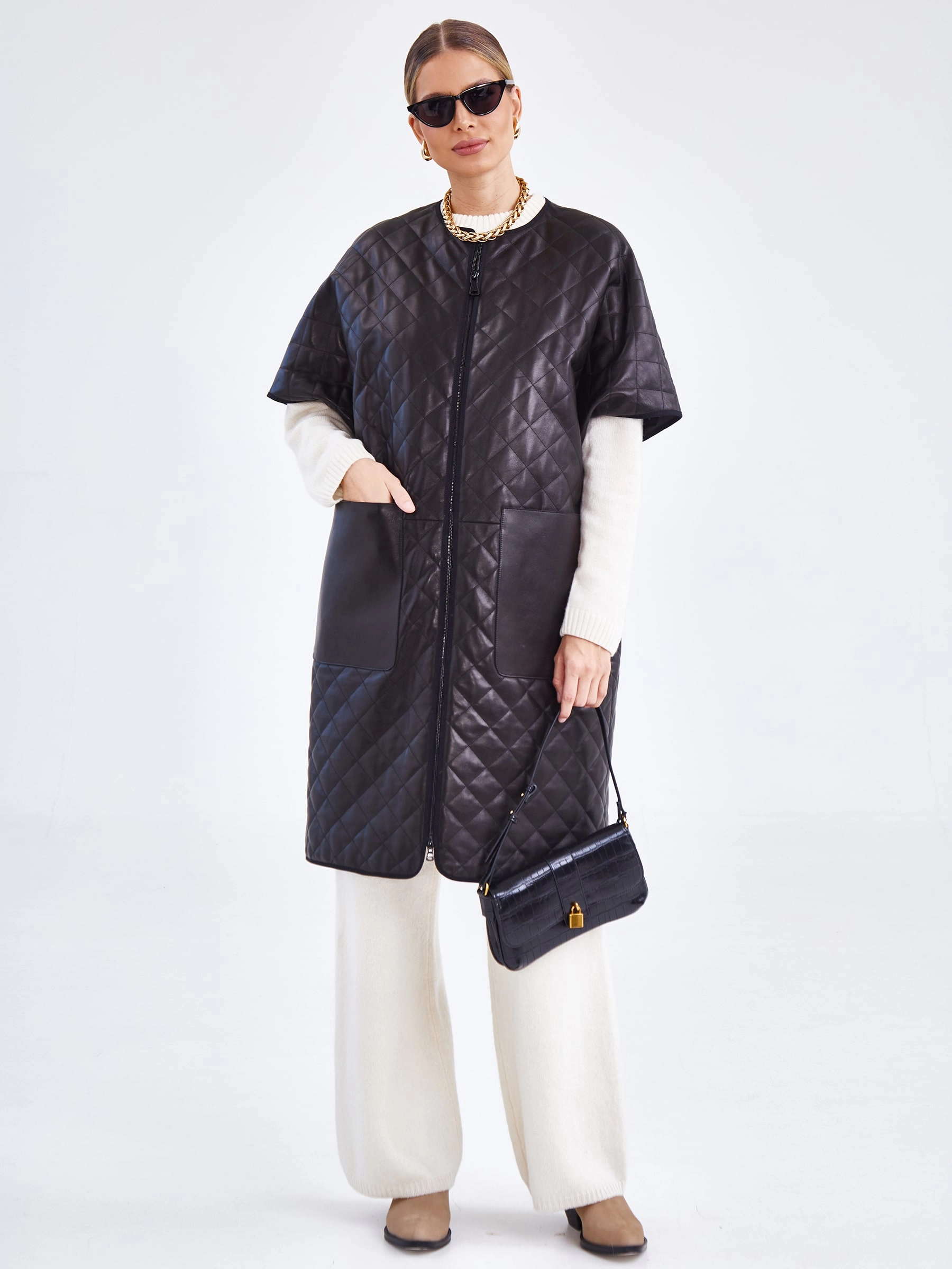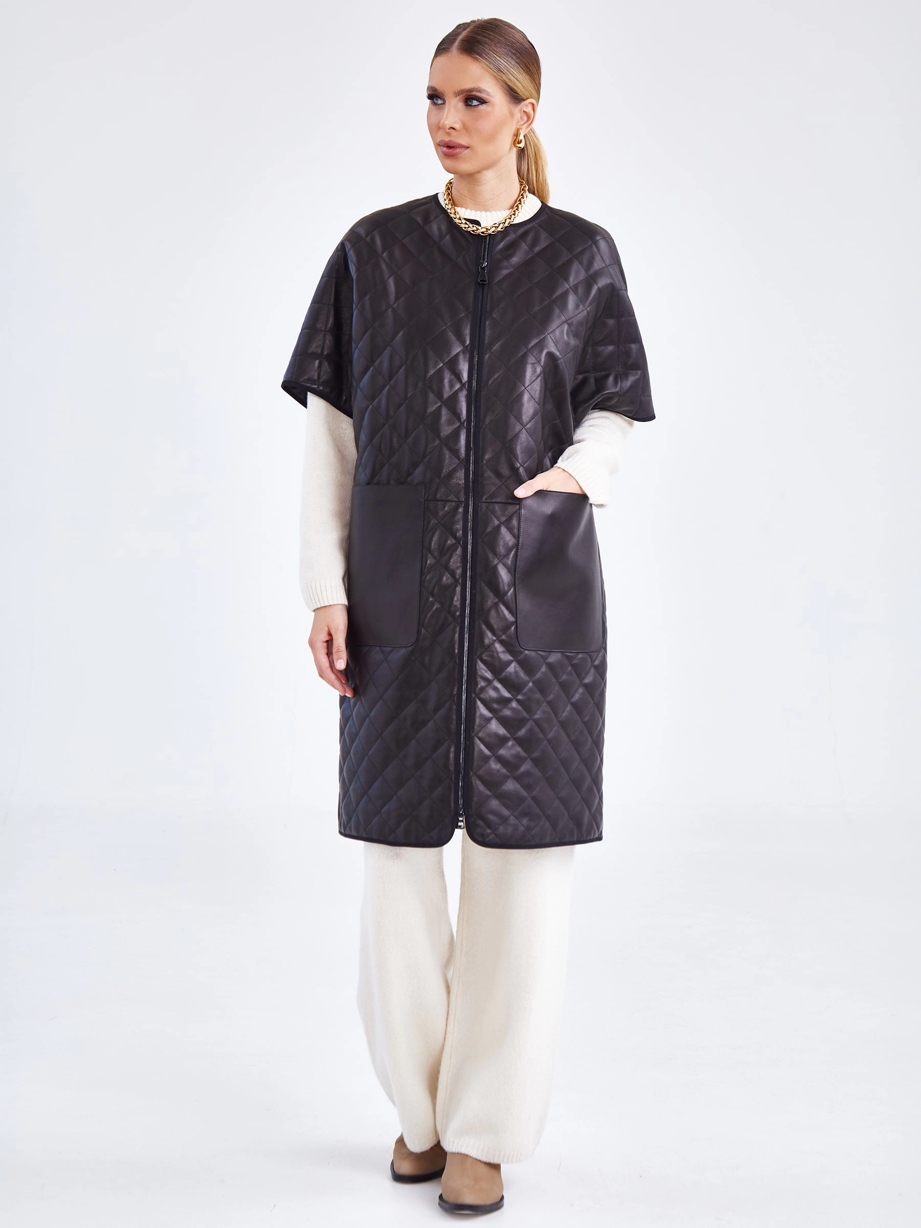 Удлиненный кожаный стеганый жилет удачно дополнит образ с облегающими брюками, джинсами, юбкой. Модель выполнили из натуральной кожи премиум класс. Дополнением послужили два объемных накладных кармана. Детали кроя подчеркнули тонким кантом из гладкой кожи.