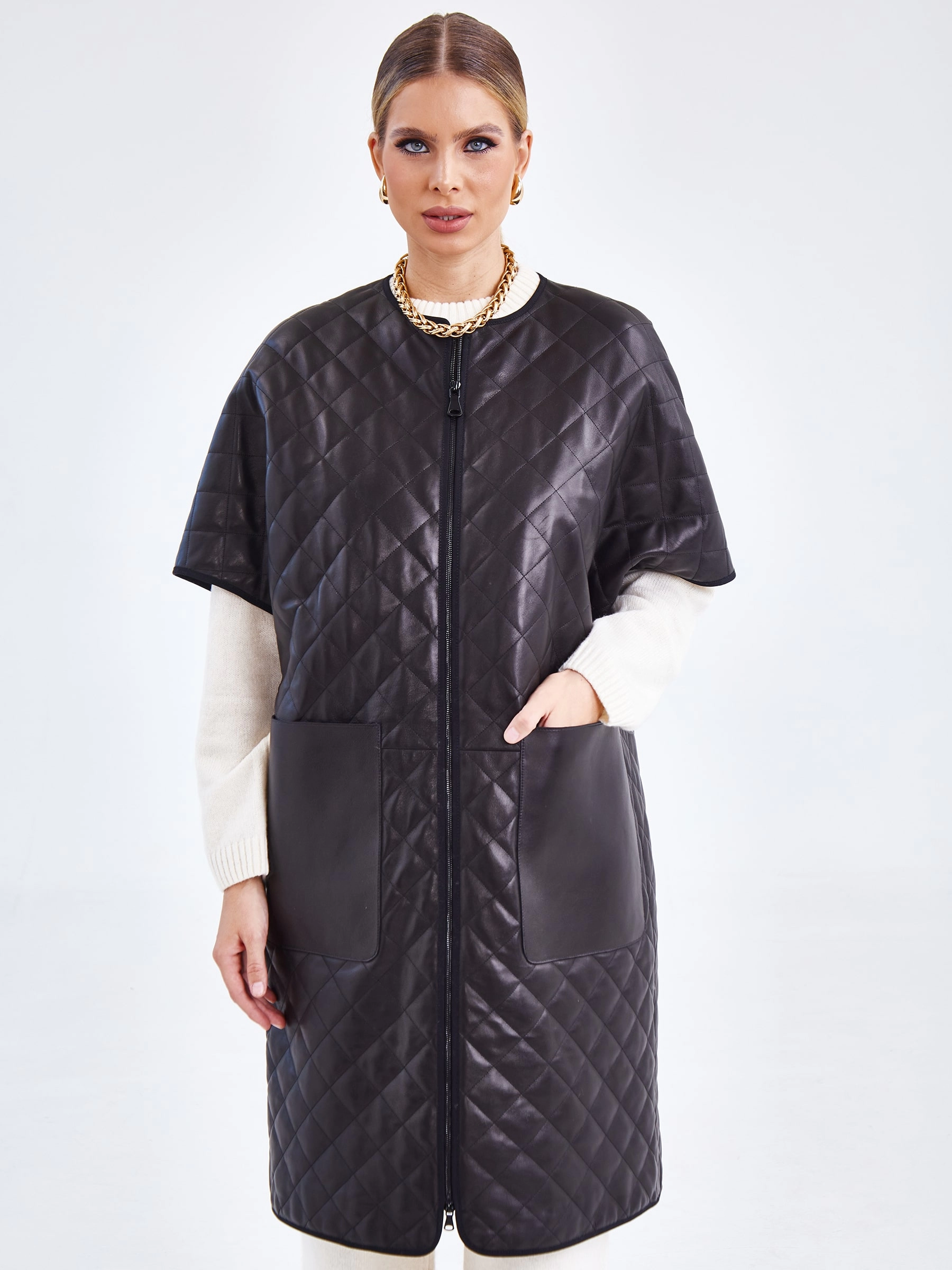 Товар кожаный женский стеганый жилет премиум класса 07, черный, размер 44, артикул 91971 выполнен из натуральной кожи с застежкой молния. Рассчитан на сезон: весна-лето. Длина изделия 100 см, силуэт прямой.