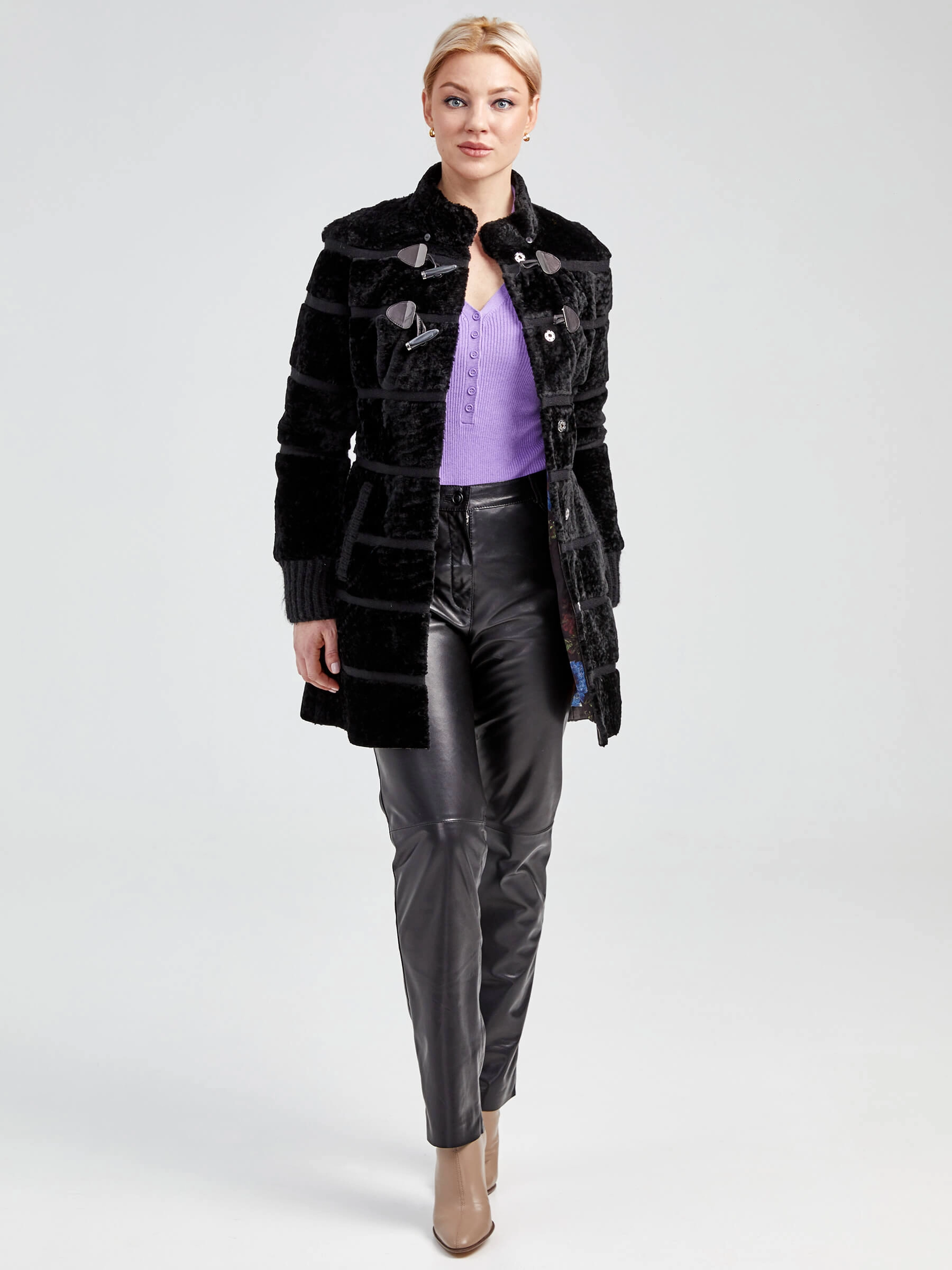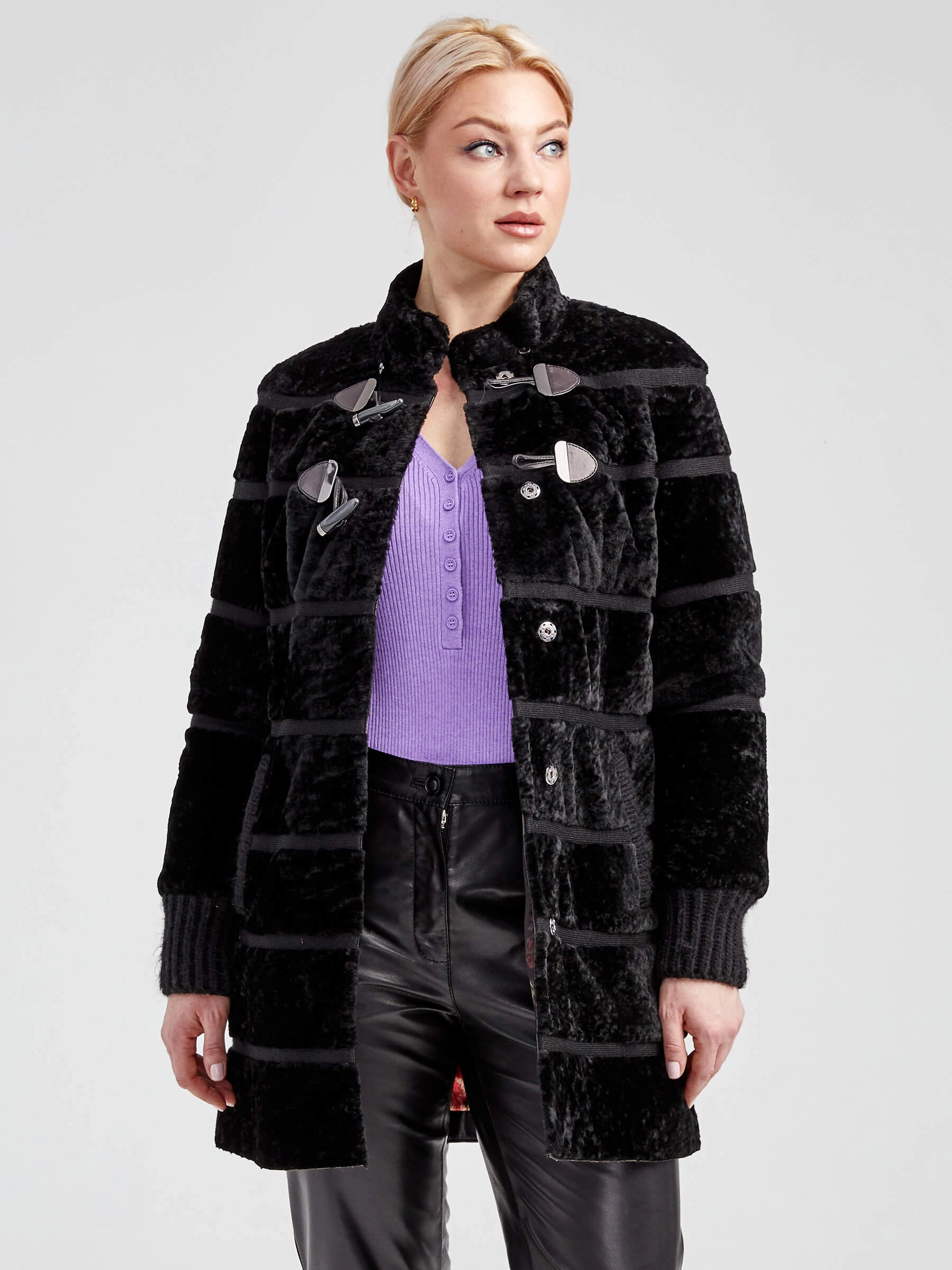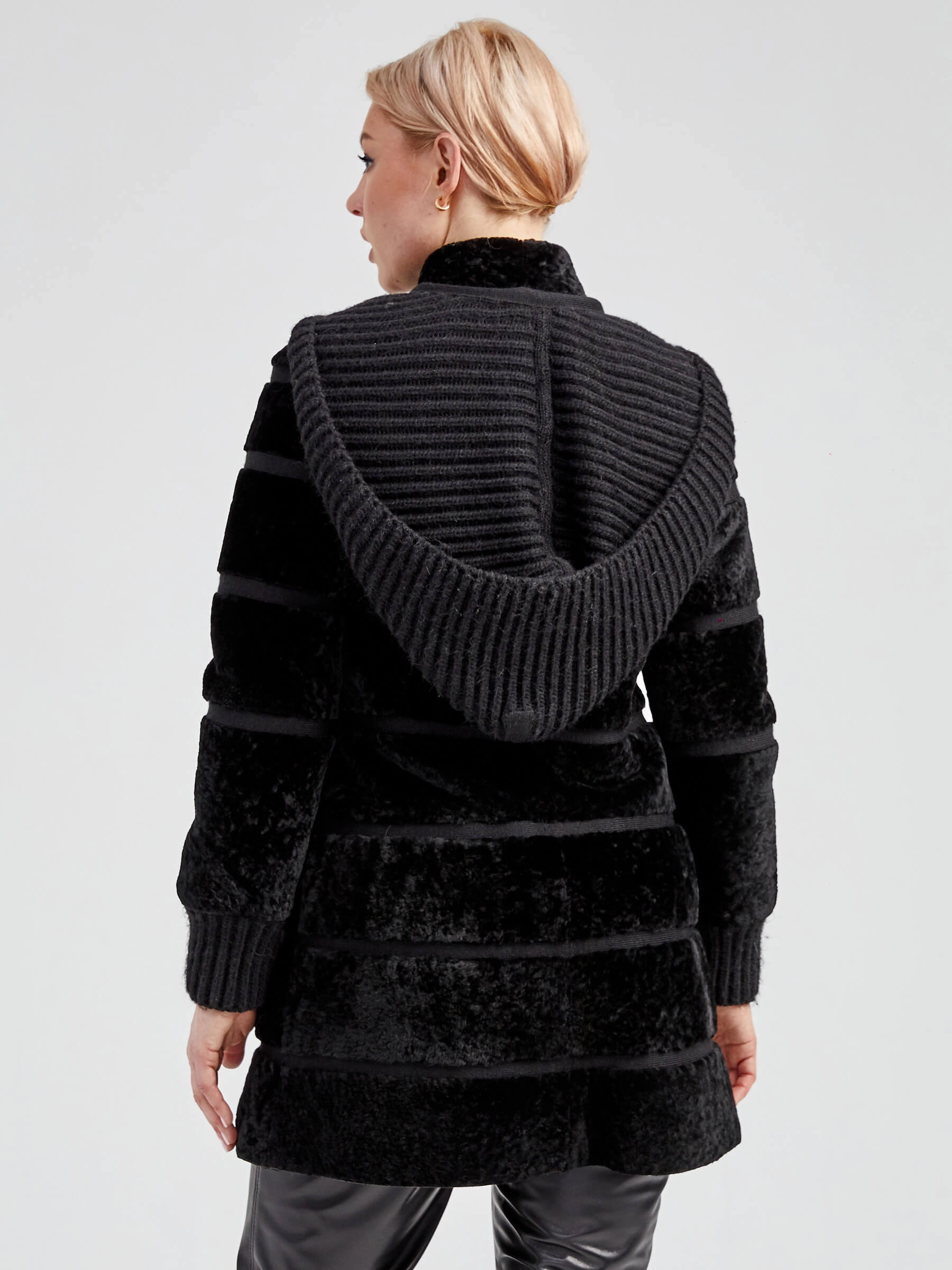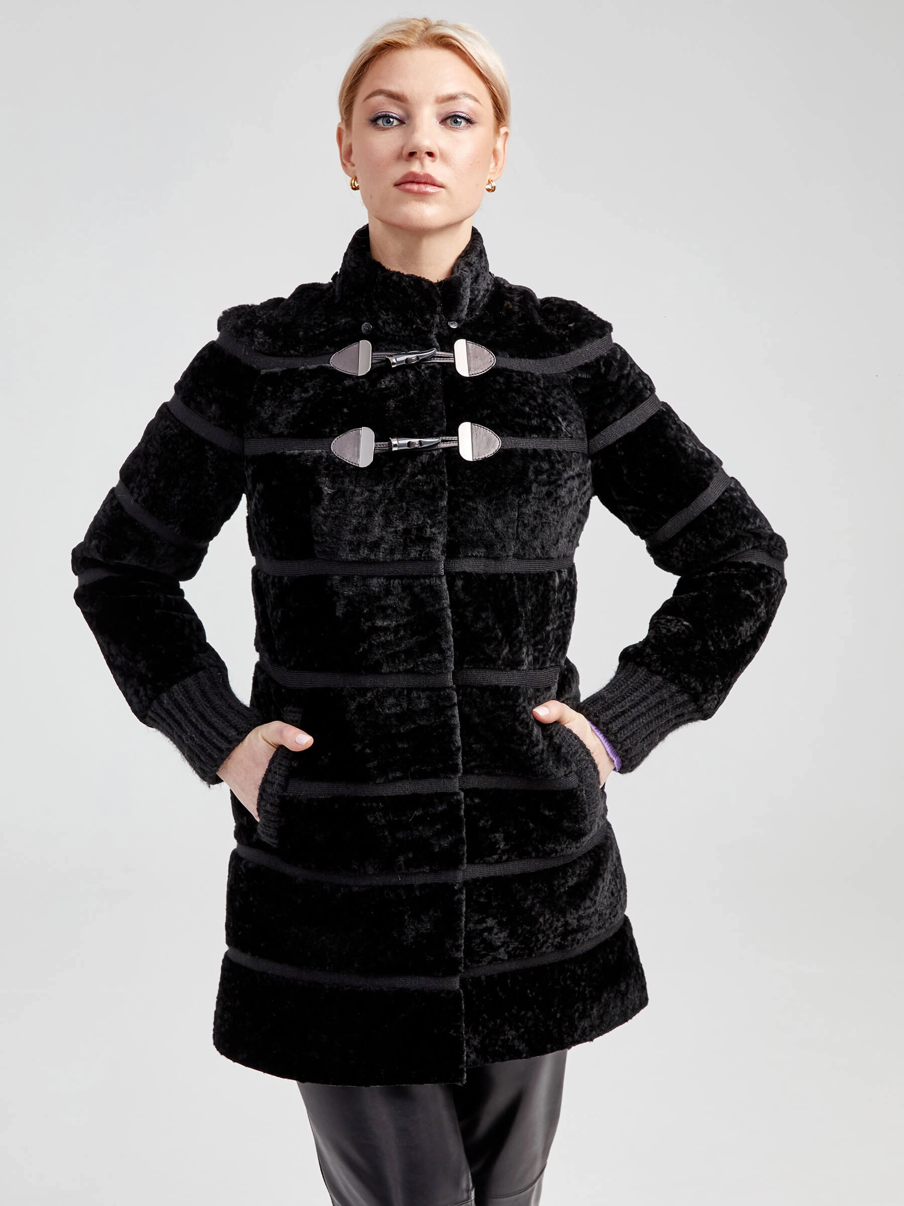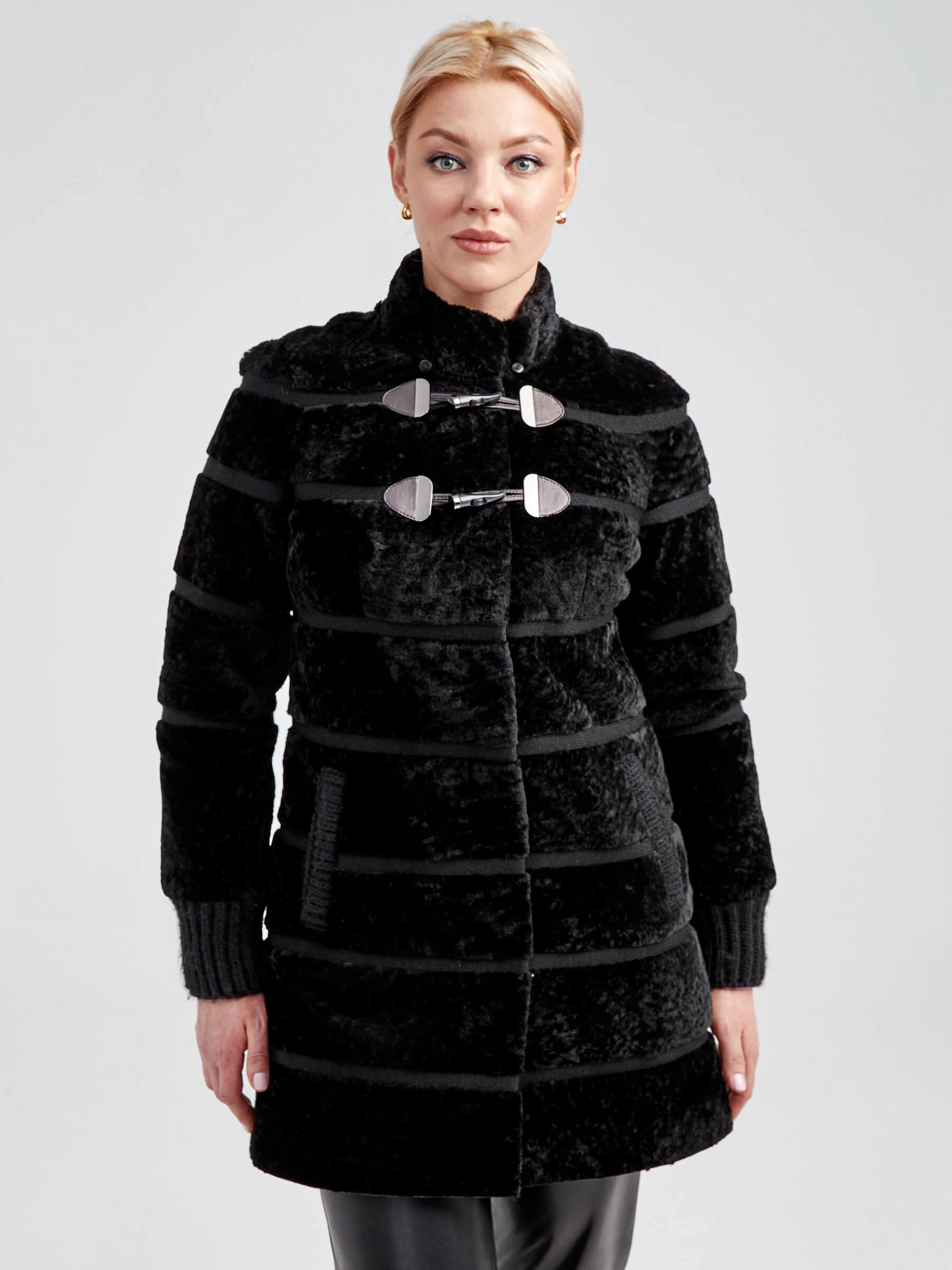 Дубленка из астрагана поперечка с капюшоном для женщин 20мех, черная, размер 42, артикул 17590