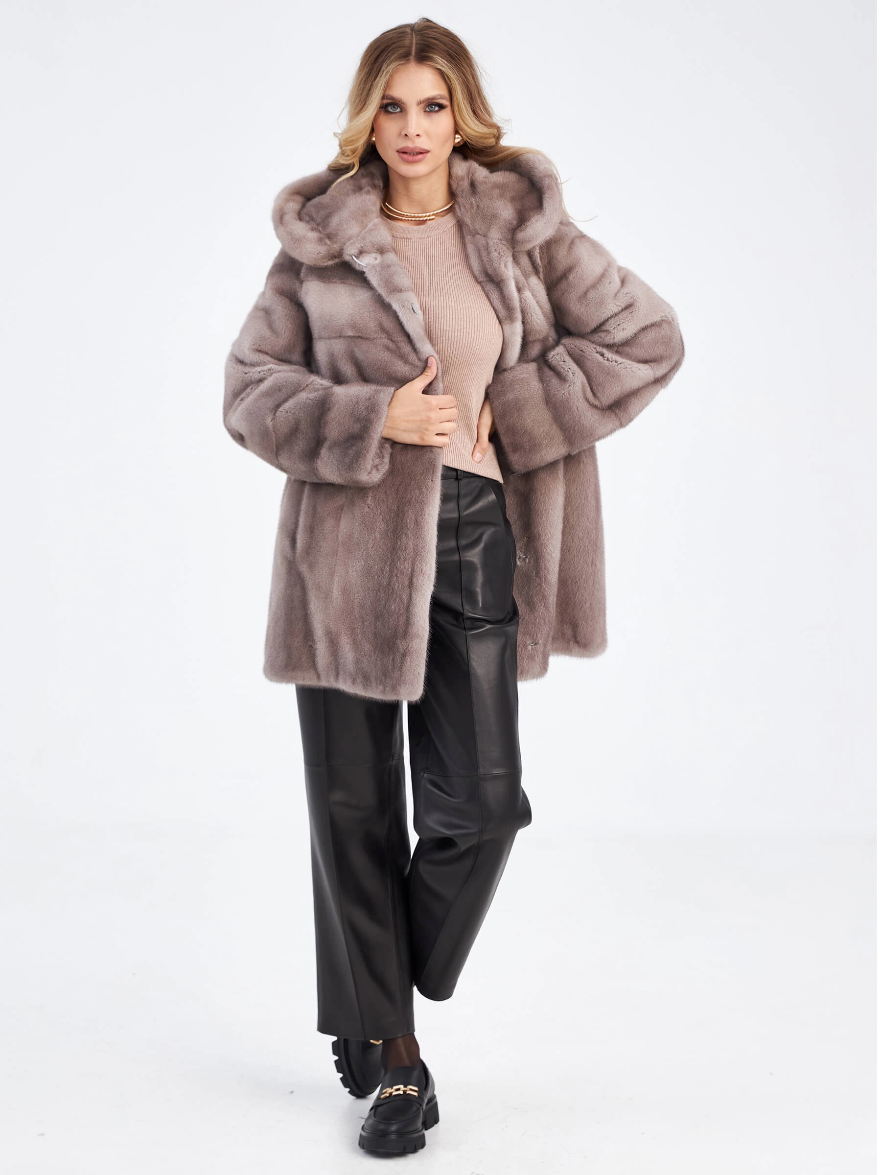 В холодную зиму не обойтись без уютной и теплой куртки в цвете жемчуг. Великолепный густой шелковистой мех норки завораживает своей красотой, создавая зимние настроение. Прямой крой модели не сковывает движения. Дополнительный комфорт добавит глубокий капюшон.
