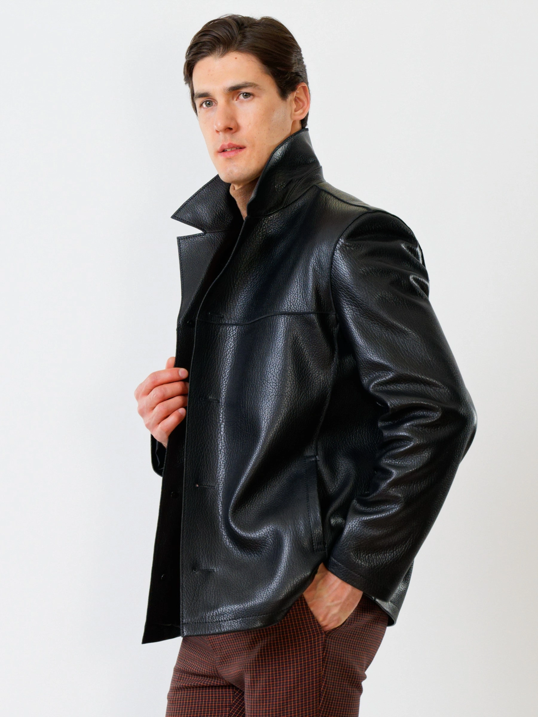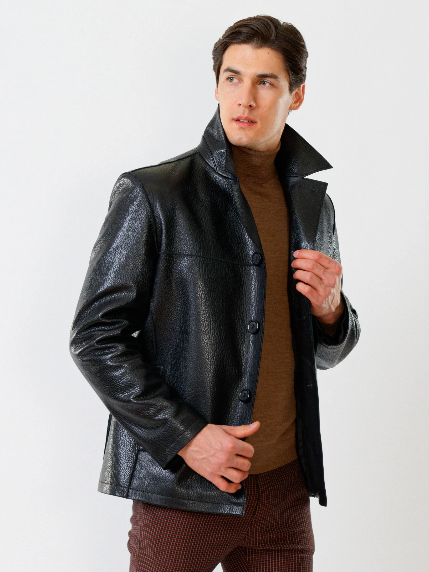 Стильная мужская куртка выполнена из мелкозернистой кожи премиального качества. Безупречная работа наших портных. Обеспечена идеальная посадка по фигуре, прекрасная свобода движений.