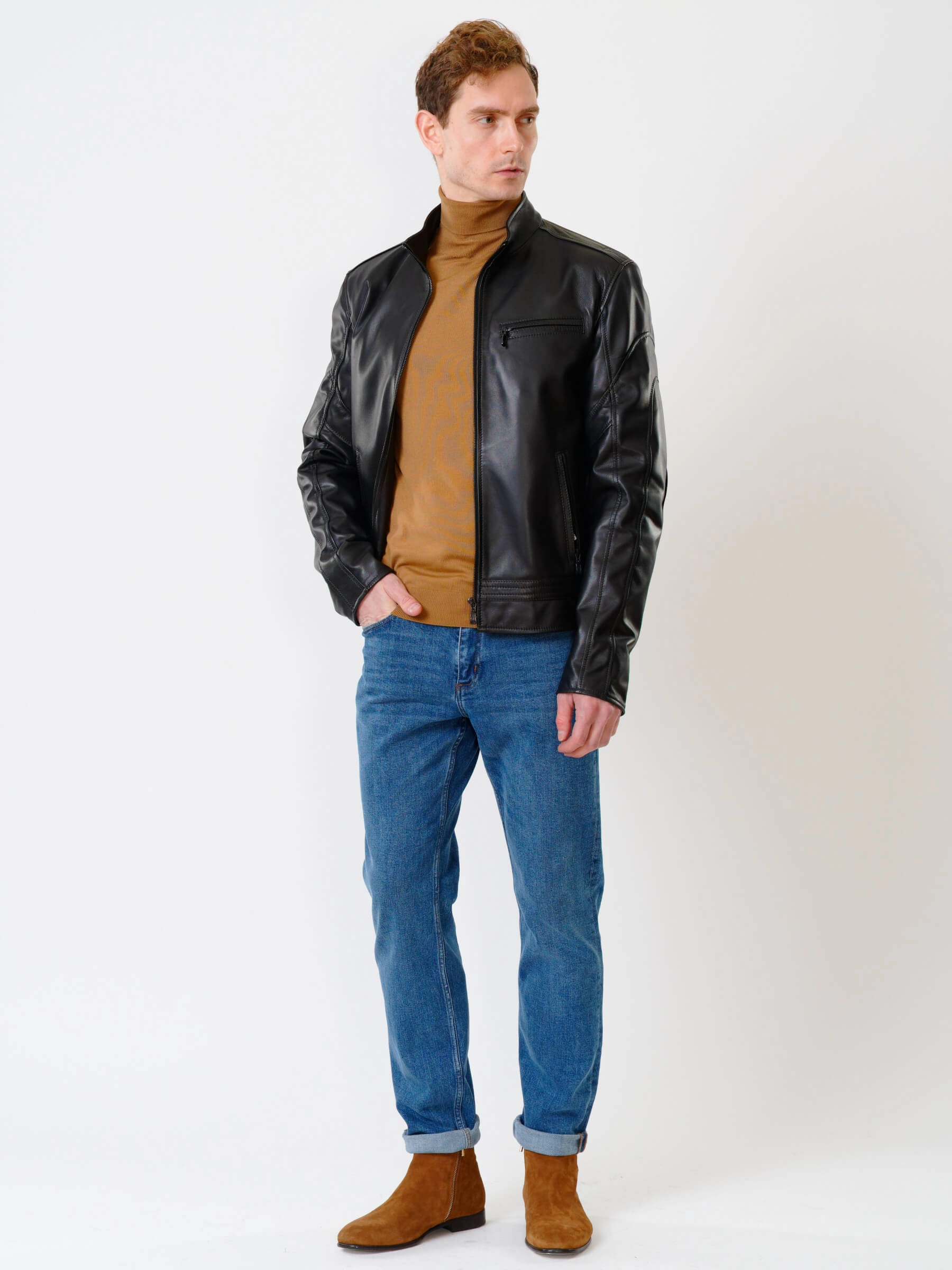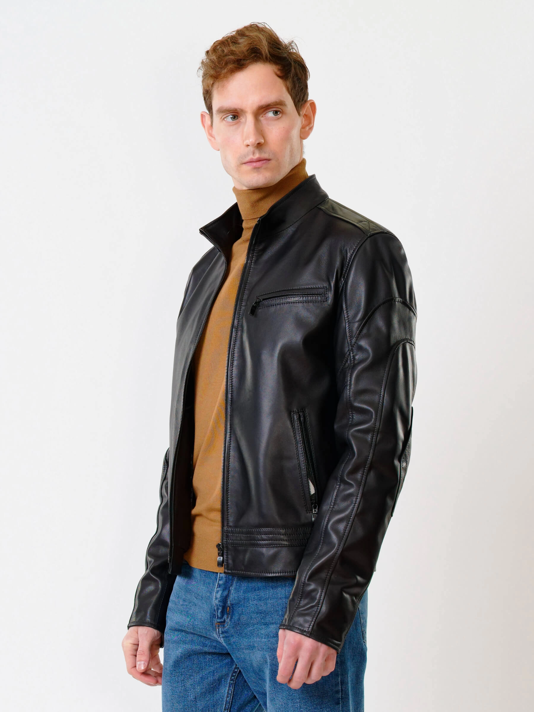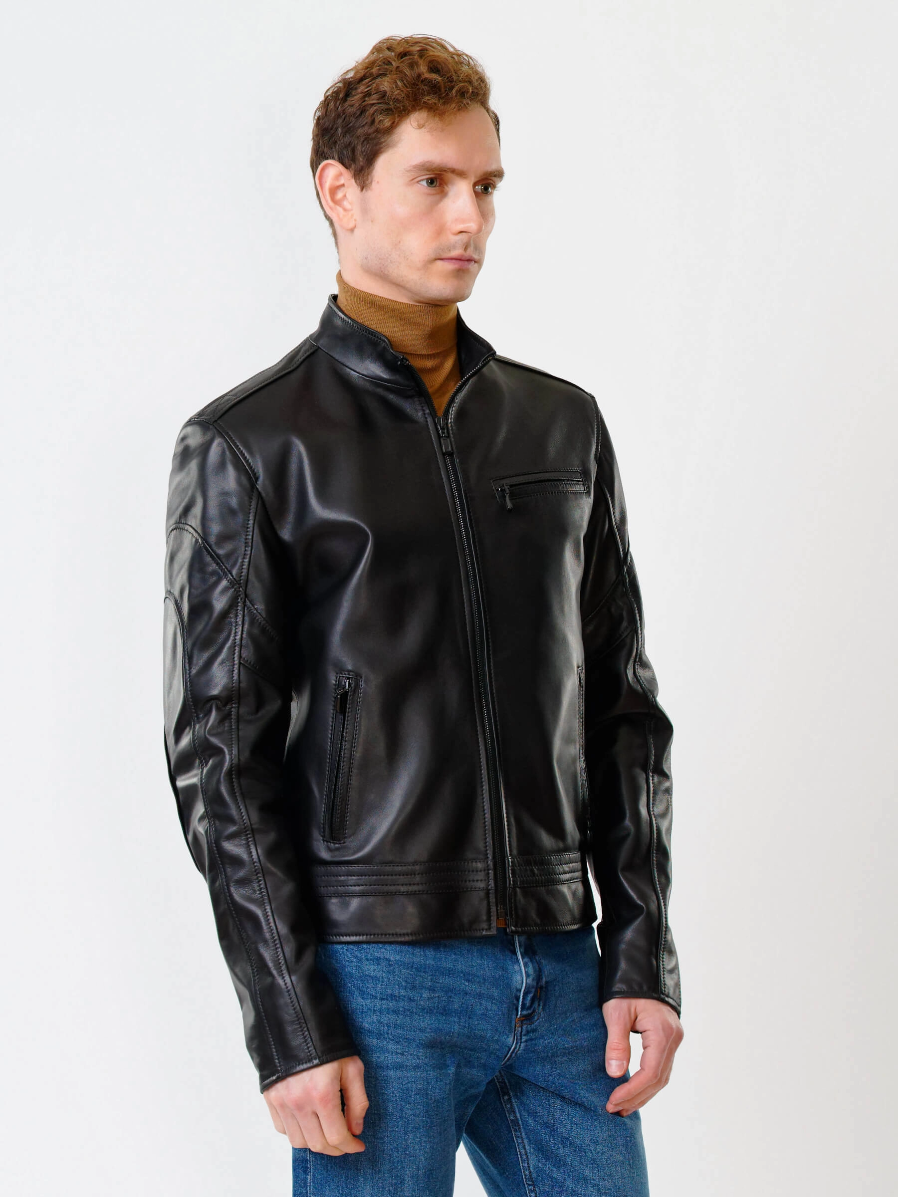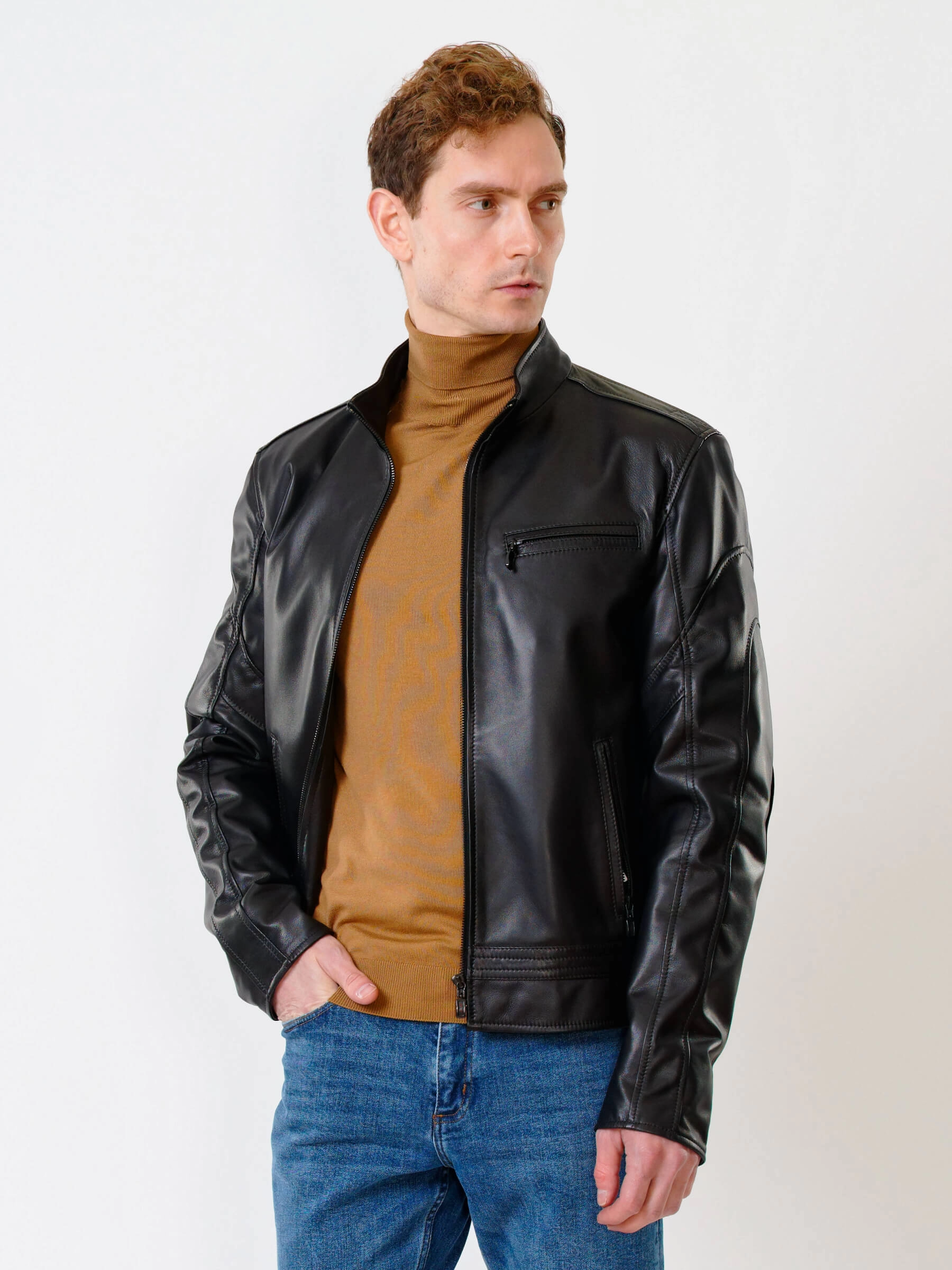 Для пошива куртки полуприлегающего силуэта выбрали мягкую кожу премиального качества. Модель из такого материала комфортно садится по фигуре и не ограничивает движения. Воротник-стойка. Боковые и нагрудные карманы как и само изделие застегиваются молниями.