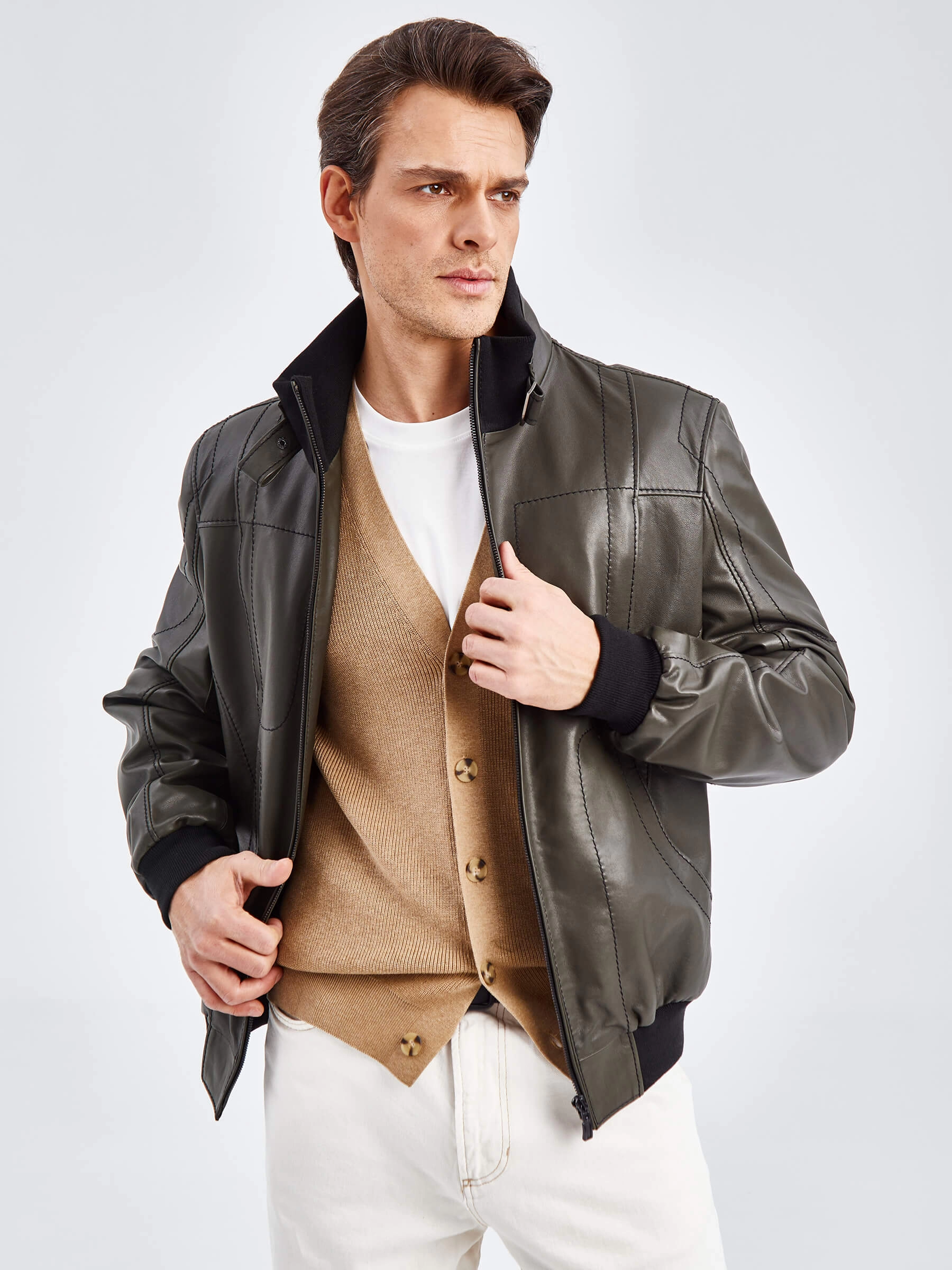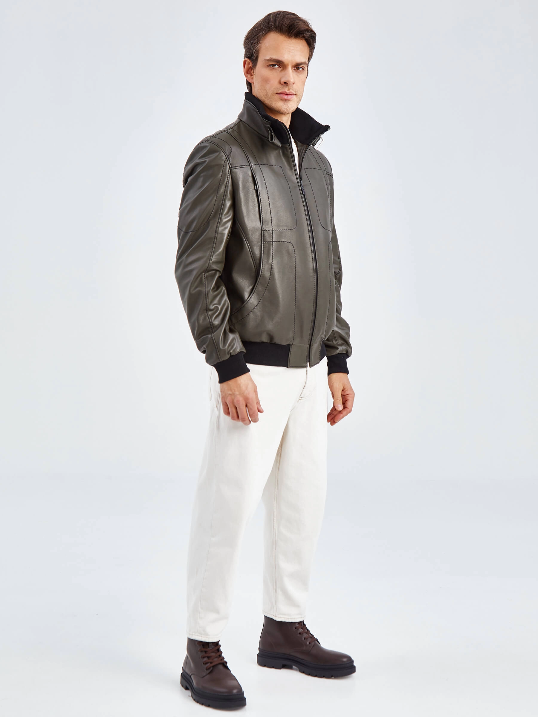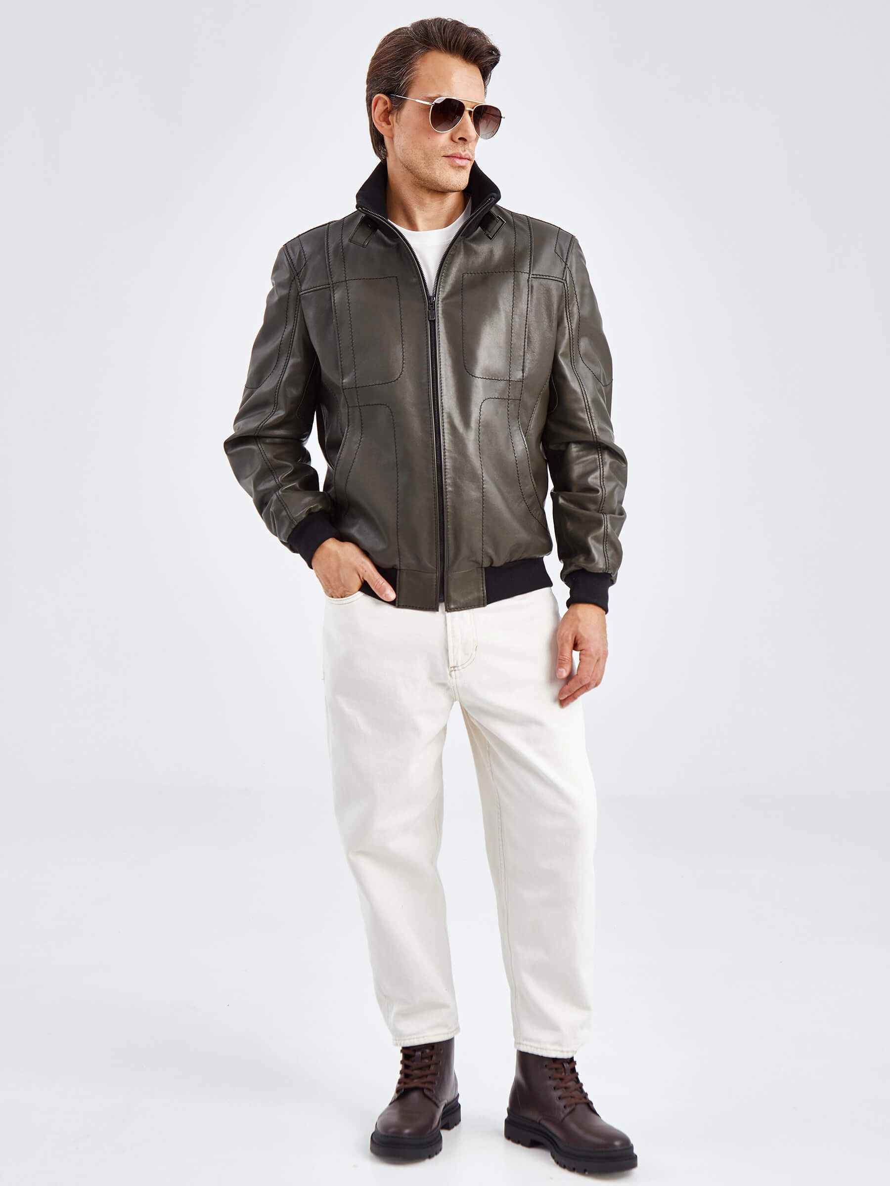 Кожаная куртка бомбер мужская премиум класса 521, оливковая, размер 50, артикул 29030