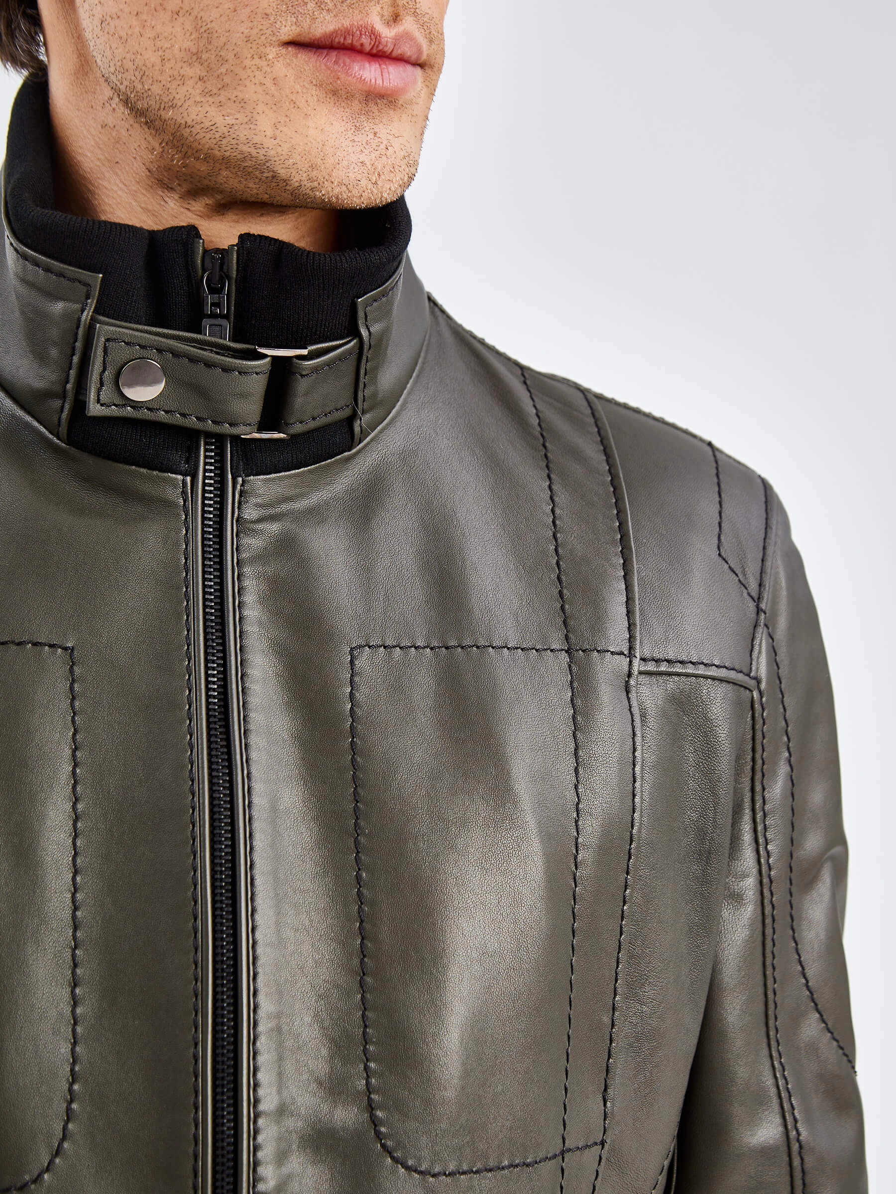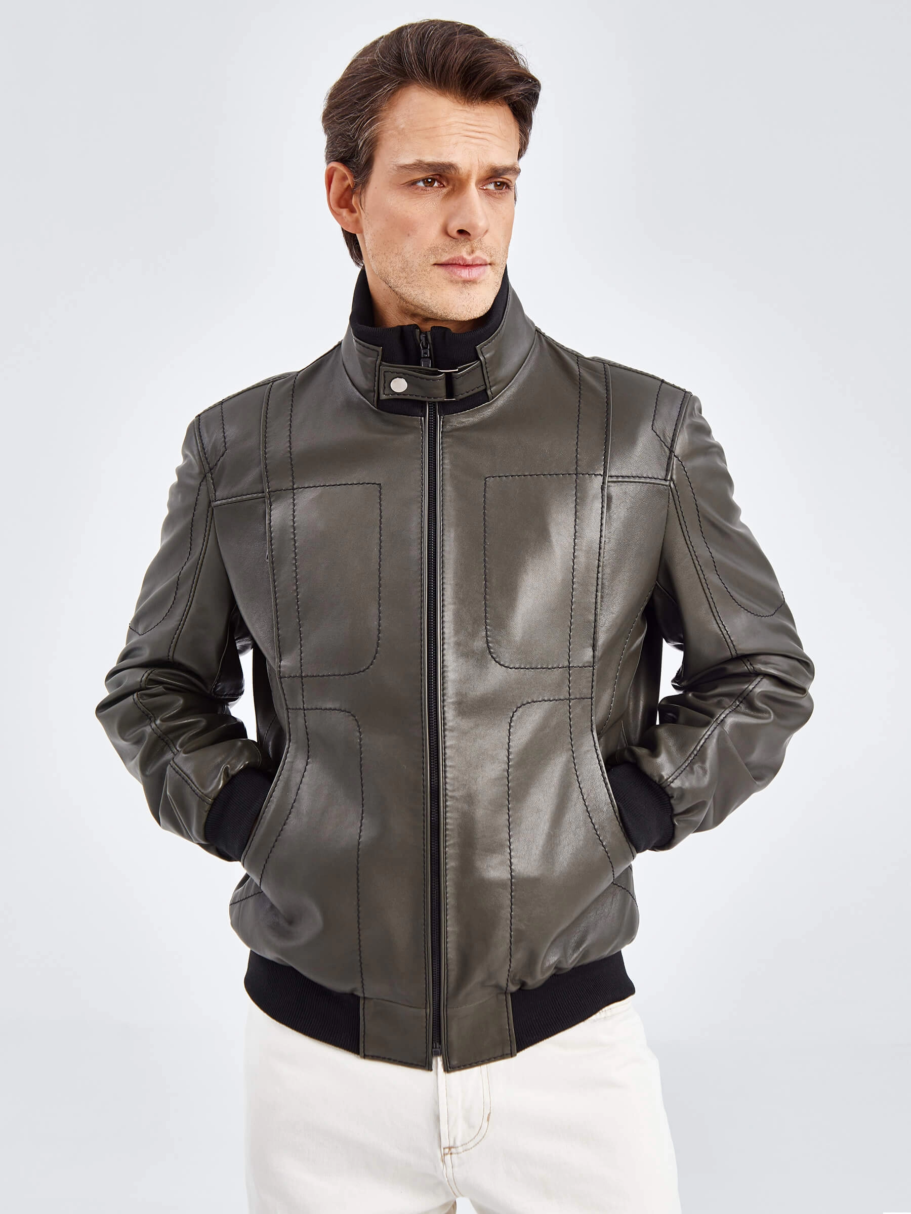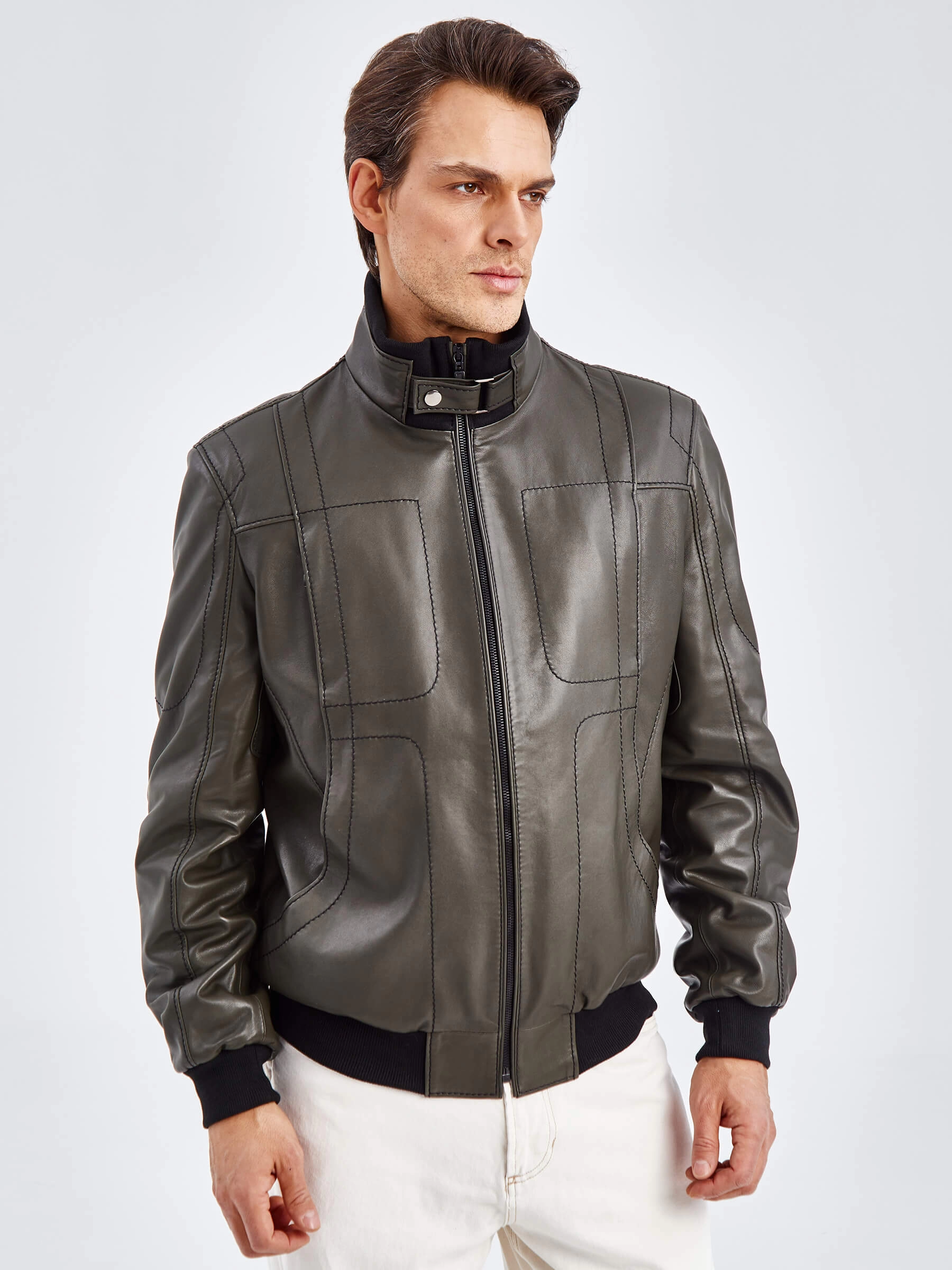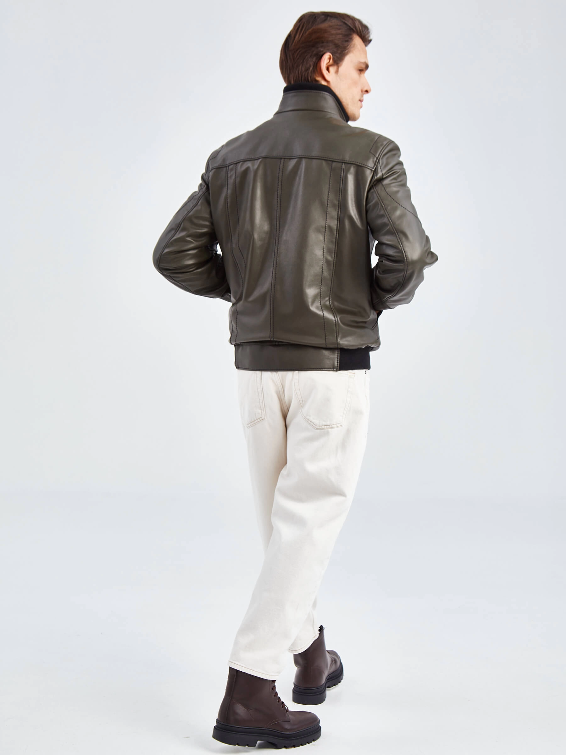Кожаная куртка бомбер мужская премиум класса 521, оливковая, размер 50, артикул 29030