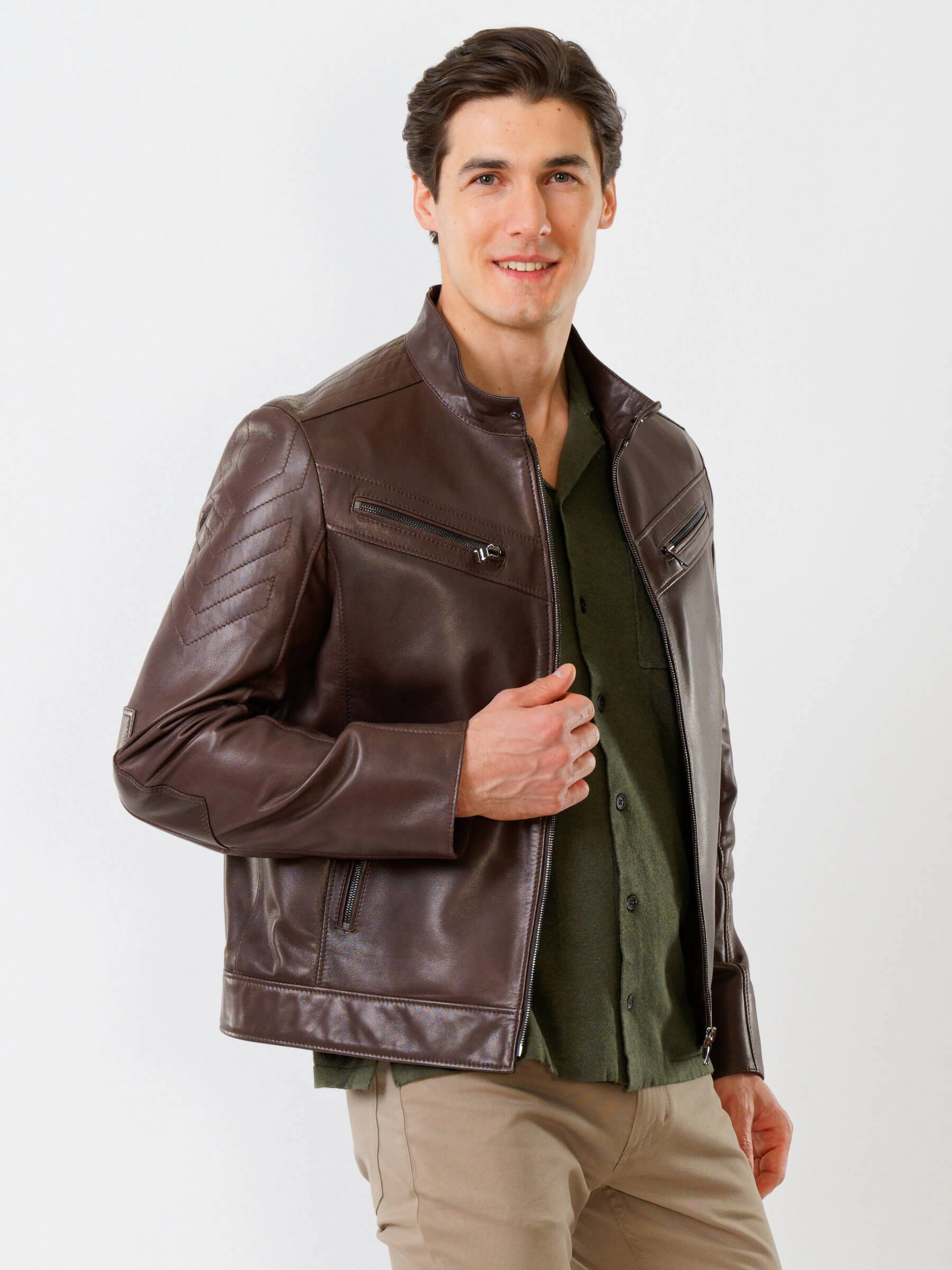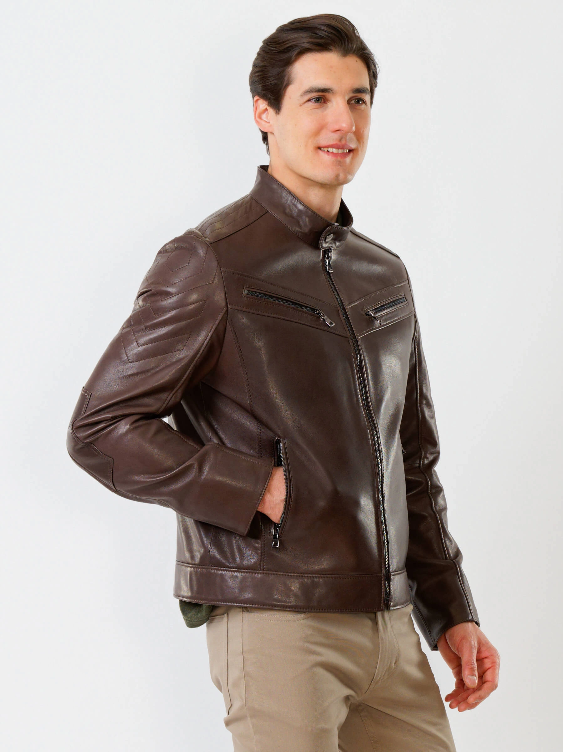Короткую куртку полуприлегающего силуэта с воротником- стойкой выполинили из гладкой кожи премиального качества. Втачной рукав выделили стеганным ромбовидным узором. Боковые и нагрудные карманы как и само изделие застегиваются молниями. Предусмотрены удобные внутренние карманы для документов. Безупречная работа наших портных. Идеальная посадка по фигуре, прекрасная свобода движений.