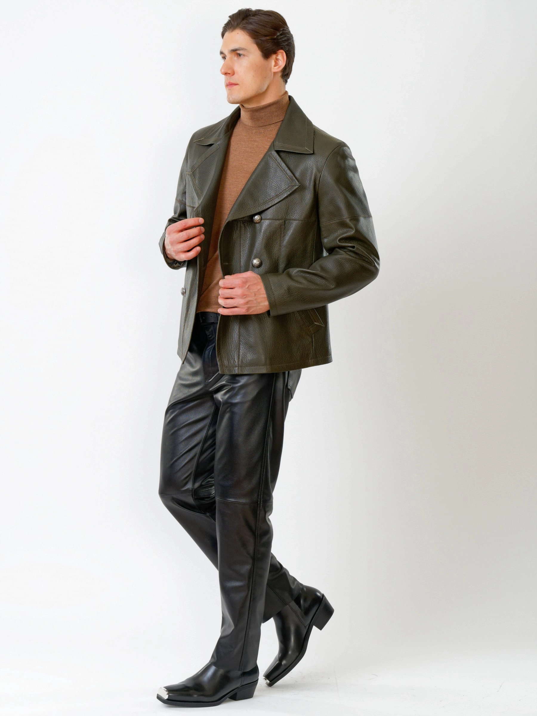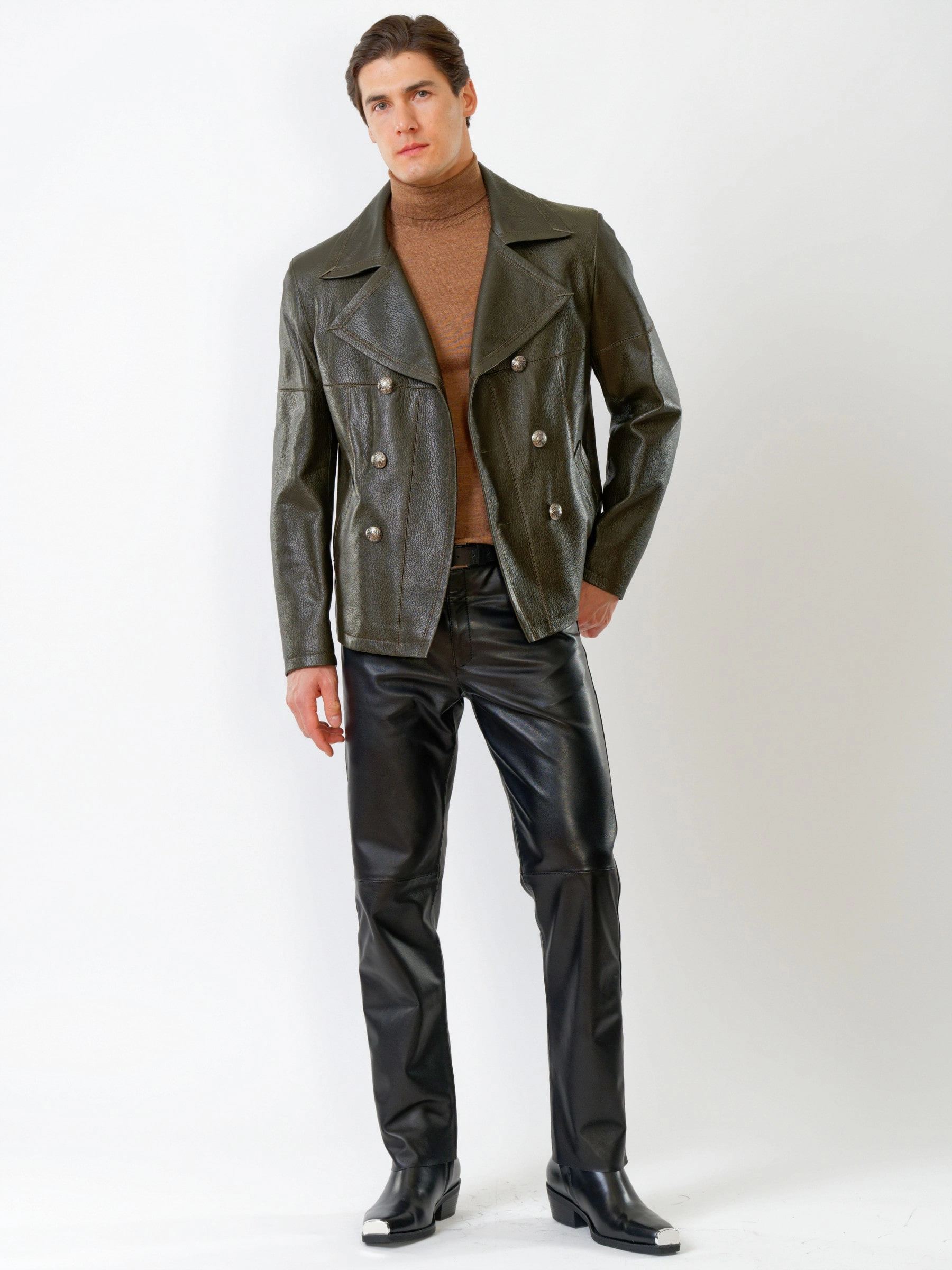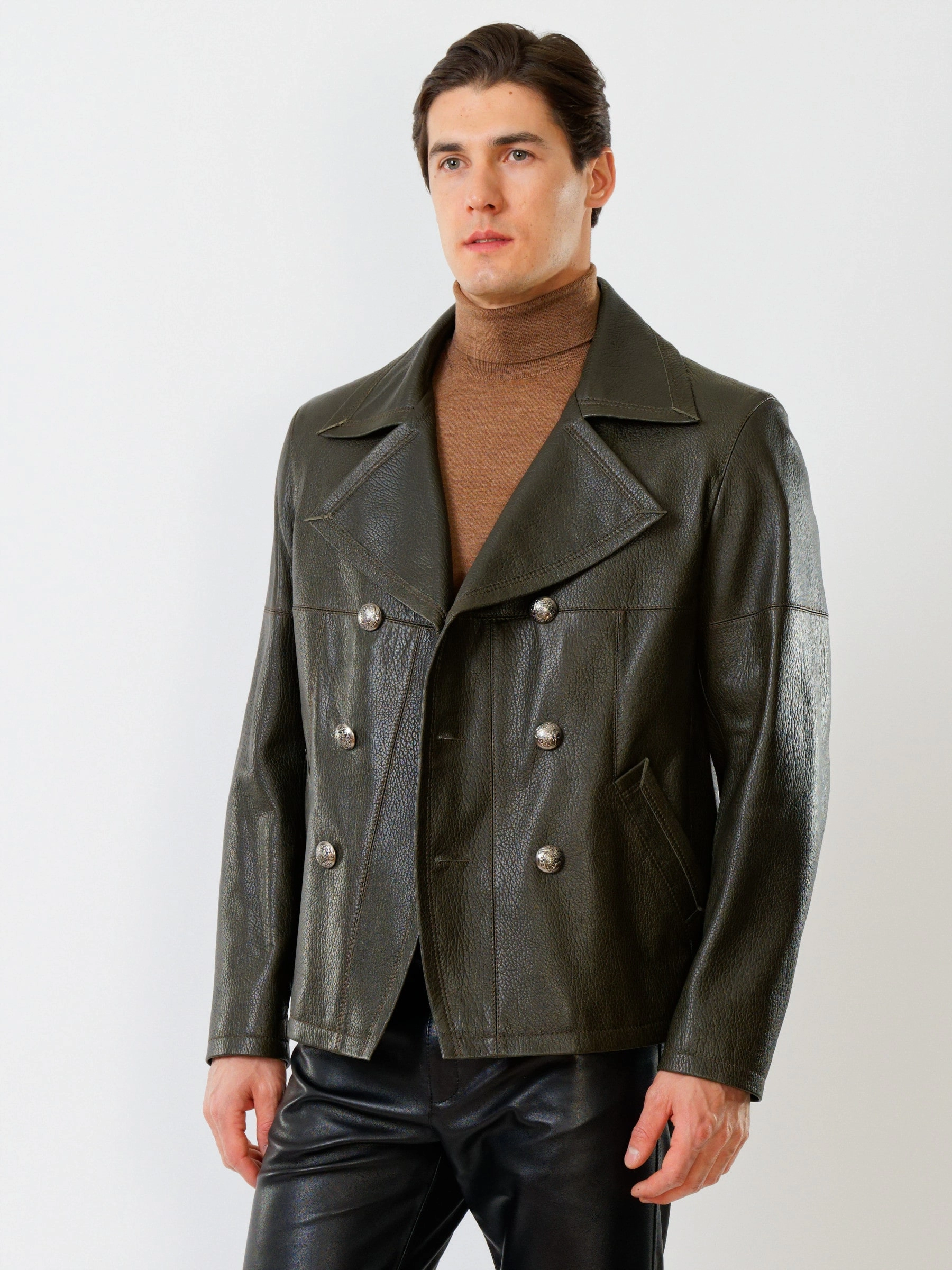 Двубортная кожаная куртка великолепна в сочетании с кожаными брюками. Кожа премиального качества. Безупречная работа портных. Комфортная посадка по фигуре.