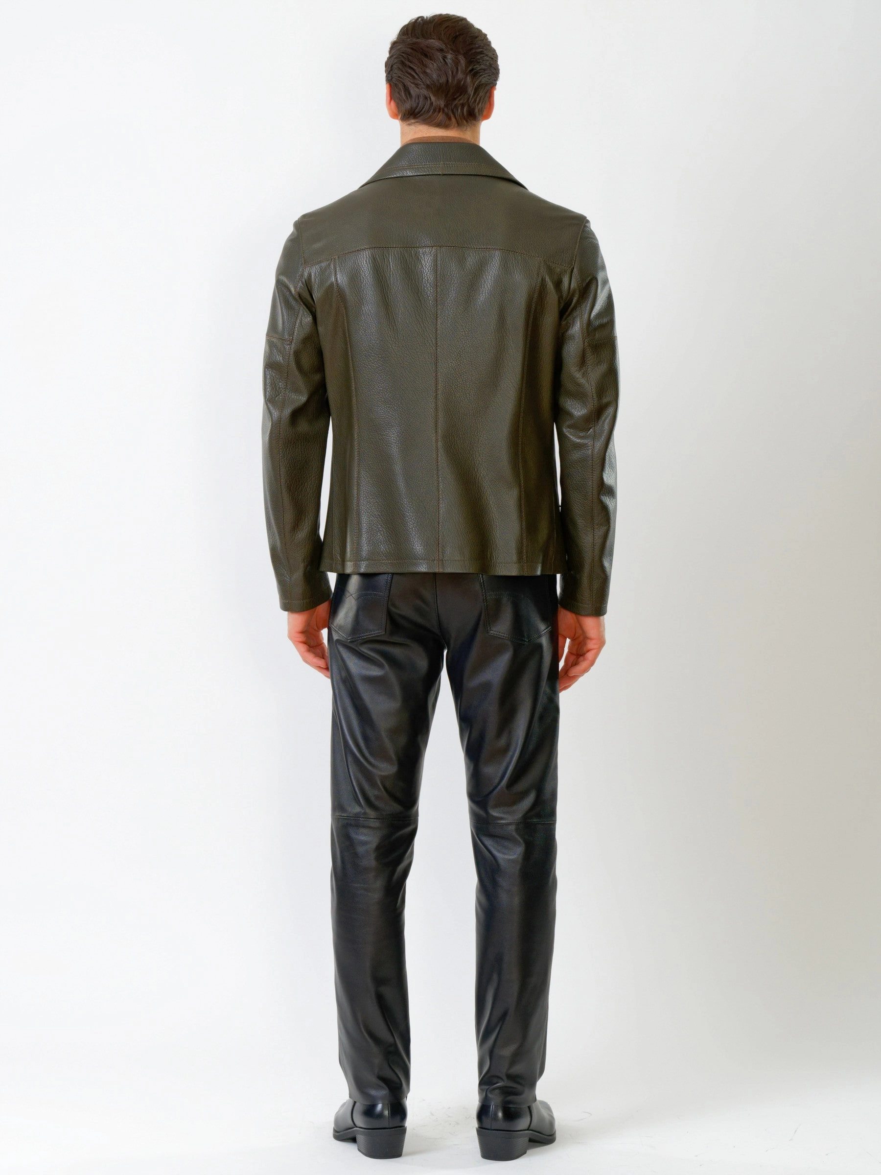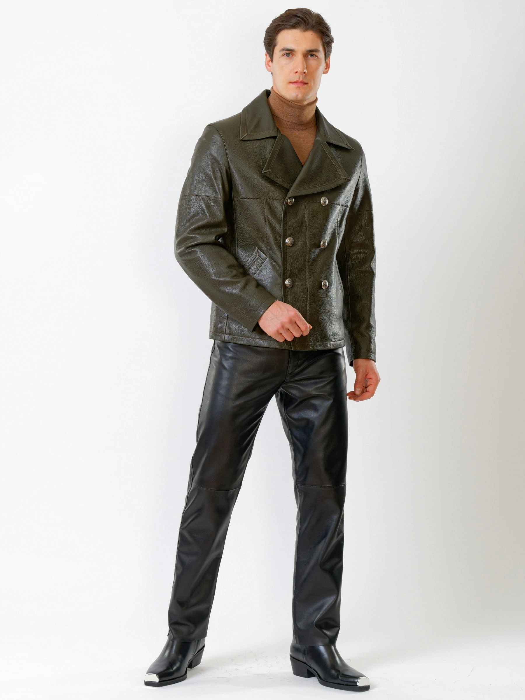 Кожаный комплект мужской: Куртка Клуб + Брюки 01, оливковый/черный, р. 48, артикул 140200